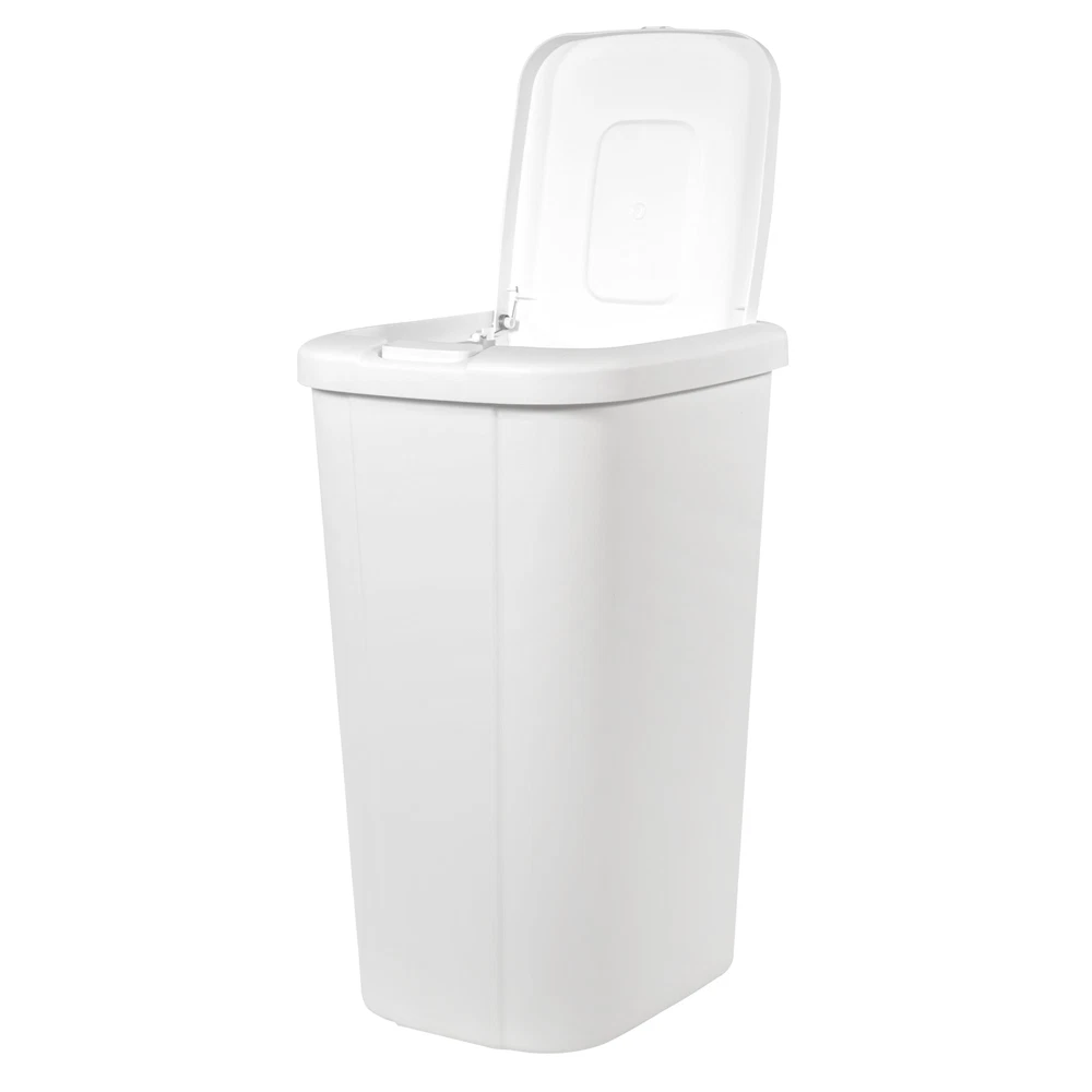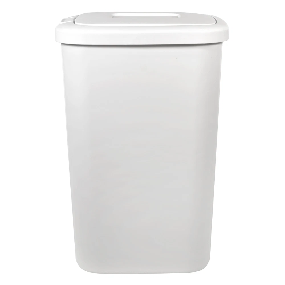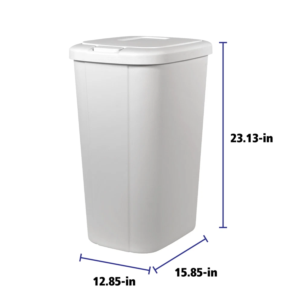 The touch lid plastic kitchen trash can in matte white has everything you need and nothing you don’t. The slim profile allows you to neatly tuck the bin away while still offering a large 13.3-gallon capacity. The spring loaded lid pops open with the simple touch of a button and clicks securely closed, helping to reduce odor. Plus, the trash bin is made of durable plastic to withstand daily use and can be easily wiped down when needed. This trash can will look great in your kitchen for years to come. The best part is, it fits a standard 13-gallon trash bag perfectly! Premium touch top button that opens spring-loaded lid Slim profile makes the most of your space Durable material to withstand daily use 12.8-in W x 15.8-in L x 23.1-in H