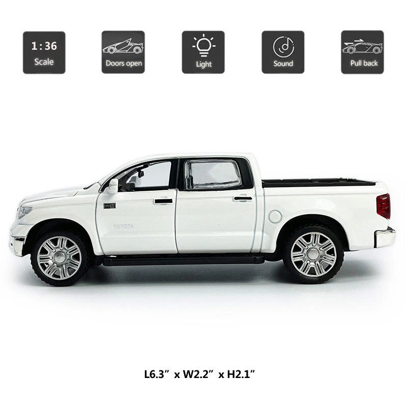 1:36 Tundra Pickup Truck Model Car Diecast Toy Cars Toys for Kids Boys Gift Item Type Diecast & Toy Vehicles Scale 1:36 Material Diecast and ABS Color White and black, as picture shows Dimension About L6.3" x W2.2" x H2.1" (L16.1 x W5.6 x H5.3 cm) Vehicle Type Pickup Truck Function *Pull back *Two doors and engine cover can be open *Press the car, it will make sound and light Package Packed in original color box, in excellent condition Power 3 x AG13/LR44 button cell, power is just for light and sound Tips *Great choice of gift for kids, especially for Birthday, Christmas and New Year Gift *Great item for collector, business gift, home decoration, office decoration Warning Don't put in mouth/Keep Away from Fire/Not for Children under 3 Years Notice Due to manual measurement, please allow a little error Package include 1 x 1:36 Scale Tundra Model Car (Batteries Not Included) Payment Delivery details Terms of sales Payment We accept paypal only. Delivery details We ship orders within 24 hours upon receipt of payment. Terms of sales We provide great products and service. If you have any problems with the order,please do contact us before leaving negative feedback and opening case on eBay.