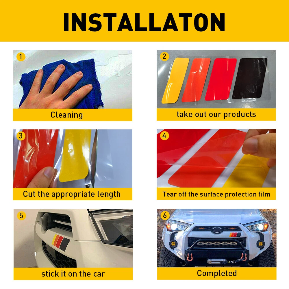 Fit for: Compatible with all Toyota Tacoma Tundra 4Runner FJ Cruiser RAV4 Hilux Highlander Sequoia Land Cruiser, Also compatible with Lexus GX LX, etc Specifications: Material: vinyl paper Color: Red, orange, yellow and black Placement on vehicle: Bumper, window,fender,hood, side mirror, center console, instrument panel etc. Features: *Tri-Color stripe design makes your vehicle stand out and be recognized immediately. *Made with high-quality reflective KK vinyl paper with a glossy coating cover 13''Neo Retro Stripe Four-Wave Style Decal Sticker Toyota For Tacoma/Lexus GX LX Fit for: Compatible with all Toyota Tacoma Tundra 4Runner FJ Cruiser RAV4 Hilux Highlander Sequoia Land Cruiser, Also compatible with Lexus GX LX, etc Specifications: Material: vinyl paper Color: Red, orange, yellow and black Placement on vehicle: Bumper, window,fender,hood, side mirror, center console, instrument panel etc. Features: *Tri-Color stripe design makes your vehicle stand out and be recognized immediately. *Made with high-quality reflective KK vinyl paper with a glossy coating cover *Good for exterior and interior decoration use such as grille, bumper, windows, fender, hood, side skirt, side mirror, rim, front/rear lip or spoiler, dashboard, inside trims, center console, etc. *Easy installation with a direct replacement. Packaging include: TRI-COLOR DECAL*1 Item Specifics Features Self-Adhesive Manufacturer Warranty 2 Years OE/OEM Part Number / Material vinyl paper Universal Fitment Yes Interchange Part Number Red/Orange/Yellow/Black 4-colors Placement on Vehicle Upper Finish Gloss Manufacturer Part Number SSCT-4PCS Brand Unbranded Color Multicolor Type Body Side Universal Fitment Yes FAQ ♥ If you have a decoding problem or any other problems, please contact us first, we will help you with it. We will reply you within 24 hours in working days. I'm a new seller, thanks a lot for your trust and convince! I will serve you with all my heart. ♥ Q1: Will this bulb fit my vehicle? A: We can match almost any vehicle to one of our bulb sizes. eBay only lets us include some vehicle fitments per listing, but if your vehicle does not show up on the compatibility table at the top of our listings, welcome you to contact us for free consulation before purchasing a product. Q2: My item has not arrived, what's taking so long? A: Sometimes items take longer than expected, especially if it’s going far or to rural area. Check with your post office to see if your item has been held up. Sometimes Royal Mail will not update a tracking number until it has arrived at its destination. If your item still don't arrive after a few days, let us know so we can double check for you and help solve it asap. Q3: My bulbs won't fit, help! A: Special bulb holder may be required. See if you can take the holder from the stock bulb. If not, let us know. The bulb size may be wrong, double check the item you received with the item you ordered. Do you have an aftermarket lighting housing? These may not be perfectly fitted for aftermarket bulbs and will require some manual modifications. Q4: Neither side lighting up? Both sides flicker, hyper flash, or work inconsistantly. A:Check the light fuses, and then check the ballast plugs to insure correct installation. If this doesn't work, there may be a voltage problem with the vehicle. You probably just need a relay or capacitor. Even though some bulbs are builtin resistors, they may still need a decoder. Pay & Ship (1). We gladly accepts payment via PayPal, We will ship your item(s) within 24 hours. (2). Before payment, please keep the consistency of Paypal address and ebay address. (3). Quantity orders are welcome! Returns (1). We offer 60 days free return policy. Please contact us within 60 days from the date you receive your order if you have any issues with the product or want return. Refund will be send after we got your resend package. (2). All returned items should be in the original packaging , return tracking information should be provided . Contact Us (1).Negative feedback will not help resolve any problems you have, please contact us via eBay messages before leaving negative feedback , our customer service will make best effort to help you with the issues. (2).We maintain high standards of excellenceand strive for 100% customer satisfaction! Feedback is very important to us. We request that you contact us immediately before you give us neutral or negative feedback, so that we can satisfactorily address your concerns. About us We're professional in car and motorcycle accessories, especially in LED bulbs. We have our own factory and R&D team. Our belief is to sell top quality items that fit your car and serve you with our heart. Anything please feel free to contact us! Our customer service is very responsibility. Come and follow us! DESCRIPTION NEW ARRIVED HOT SALE CONTACT US SAVE US Store Category Store Home Other Hot Item Fire Extinguisher Holder,Car Accessories for Jeep Wrangler Tj Jk Jl 1997-201 USD 11.99 4x Car Accessories Universal Front Rear Mud Flap Flaps Splash Guard Mudguards US USD 24.99 Windshield Reveal Surround Molding Trim For 2006-2011 Honda Civic 73150-SNA-003 USD 12.98 For Dodge Charger 2011-2021 6pc Black Pillar Posts Set Door Trim Piano Cover Kit USD 12.99 Car Trunk Organizer Oxford Interior Accessories Back Seat Storage Bag 4 Pocket USD 15.10 New List Item Chrome Pillar Posts Window Trim Cover For 2005-10 Chrysler 300/300C Dodge Magnum USD 12.99 FOR 2007-2011 HONDA CRV CR-V GLOSSY BLACK WINDOW VISOR VENT TRIM DEFLECTOR GUARD USD 35.99 Carbon Fiber Sticker Car Door Body Anti-Scratch Sill Protector Scuff Cover Strip USD 13.99 Black Window Door Posts Pillar Trim Cover For Set Honda CR-V CRV 2017-2022 18 19 USD 17.99 Pair Front LH RH Side Vent Window Visors Rain Guard For 16-21 Honda Civic Coupe USD 36.99 Picture 13''Neo Retro Stripe Four-Wave Style Decal Sticker Toyota For Tacoma/Lexus GX LX Fit for: Compatible with all Toyota Tacoma Tundra 4Runner FJ Cruiser RAV4 Hilux 