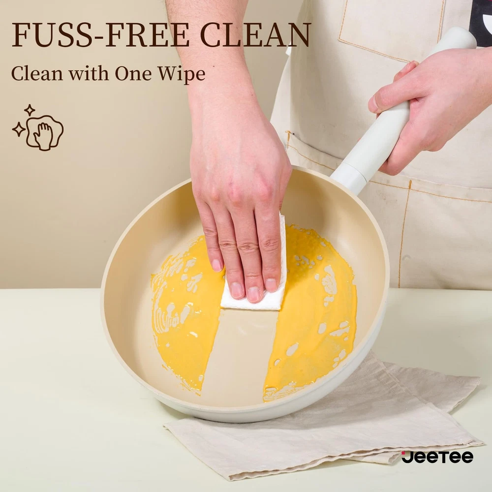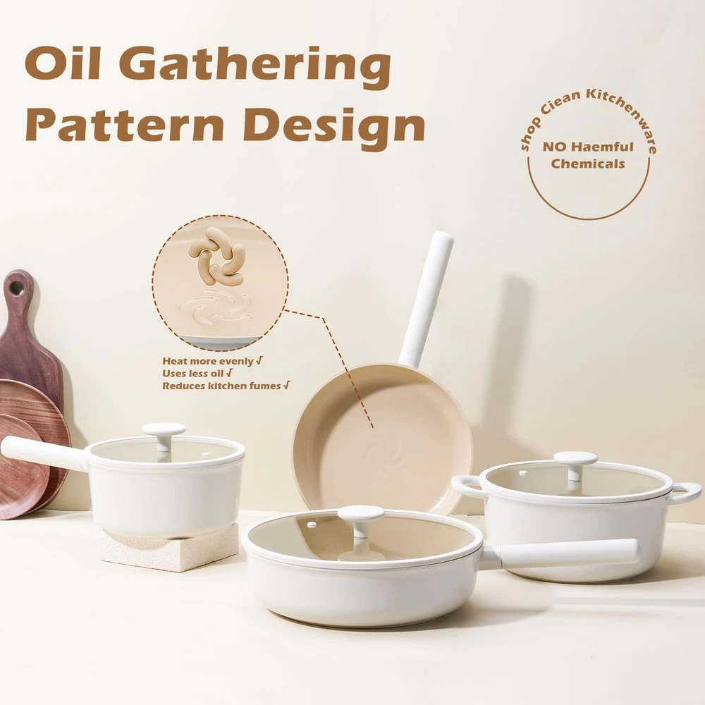 Ceramic Cookware Set, 13 Pcs Pots and Pans Set Nonstick with Rotation Removable Handles, Healthy Non-Toxic Cooking Set for All Stoves, Stackable Pots Pans, Oven Safe, PFOA/PFOS Free, Cream What's Included: 3-quart saucepan with lid, 9.5-inch frying pan, 4.7-quart sauté pan with lid, 4.7-quart casserole with lid, 2 silicone utensils, 4 pot protector. Perfect Size for a 2-5 people family, meeting your cooking needs for breakfast, lunch, and dinner throughout the day. Healthy & Safe Ceramic Cookware: Our 13pcs ceramic cookware sets use natural ceramic material, which is 100% cadmium-free, PFOA-free, PFOS-free, and Lead-Free. Our ceramic pots and pans set ensures your daily cooking is always safer and healthier. Saving Space Design: Saving 70% of space with an easy-swivel removable handle compared to regular pans. You can easily remove the handles, neatly stack all the pots and pans, and place the pot protector between each pot to prevent scratches, then they can be easily placed in the cabinet. Support Oven Use: This ceramic pot and pan set can be used in the oven up to 450°F, you can use them to bake, roast, and grill delicious food. Before placing them in the oven, please remove the handles and the lids first. Oil Polymerization Design: unique oil gathering pattern design at the bottom of the pot makes the food heat more evenly, uses less oil, reduces kitchen fumes, and improves cooking efficiency and food taste.