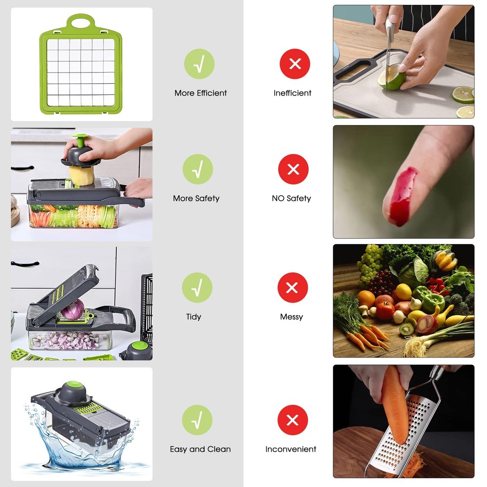 🥦【Add Accessories 】🥦We've added an accessory, a hand pull string onion chopper to this multifunctional vegetable chopper cutter. Compared to other choppers, it can cut small pieces of solid food into a semi-liquid form, which is a perfect combination. 🥕【High-Quality】🥕The onion chopper is food-grade ABS plastic material and 420-grade hardened stainless steel blades. The plastic part is sturdy, smooth, and comfortable to use. The stainless steel blade is sharp enough to cut through most vegetables and fruits, and it's easy to clean without rusting. It can be used for a long time and is a good helper in your kitchen. 🥒【Save Time】🥒This veggie chopper slicer is a practical kitchen tool. Usually, it takes a lot of time to cut food into small pieces and thin slices. With this vegetable slicer, this process can be reduced. Time-consuming, a vegetable chopper can cut your prep time down to minutes. This lifestyle has brought us into the era of fast food... 🧅【Innovative Design】🧅 Use the food basket when slicing small vegetables and fruits, which prevents the foot from slipping when sliced, and never have to worry about cleaning and wiping. It also can be cleaned in minutes with its accompanying scrubbing fork. Its compact size allows you to store it anywhere.... 🍆【Service】🍆 Do not place the blade arbitrarily. After rinsing and drying, please collect the blade in a container and keep it away from children. If you are not satisfied with our manual vegetable dicer chopper, please send us an email, and we will promptly replace it for you without any hassle. So please place an order now .