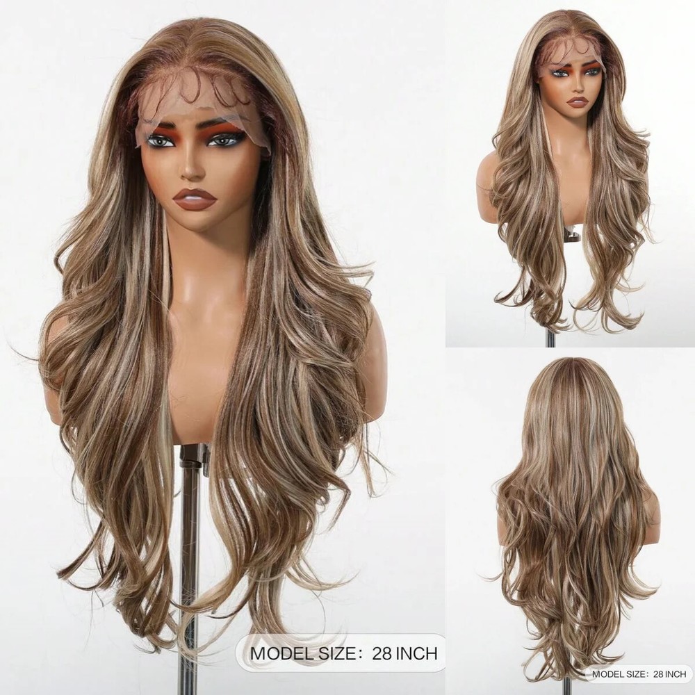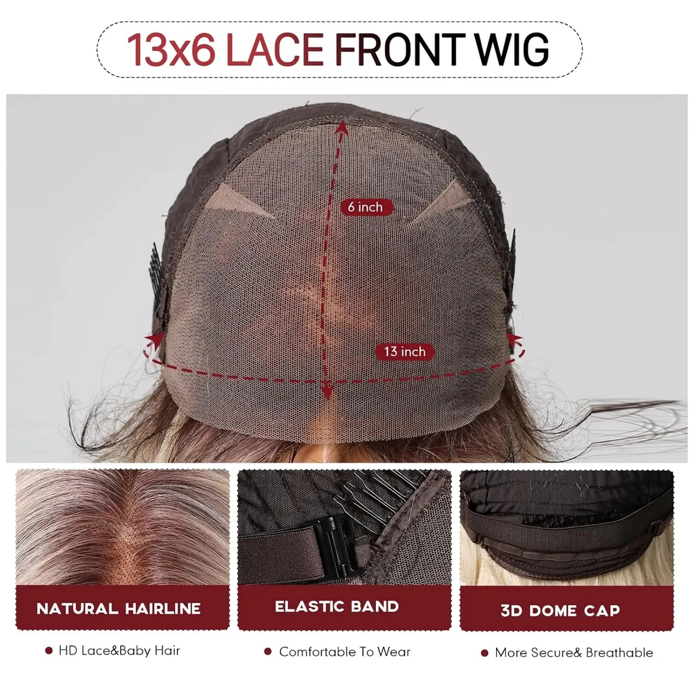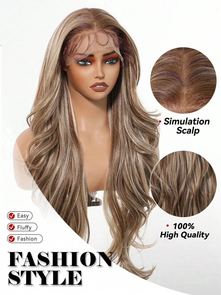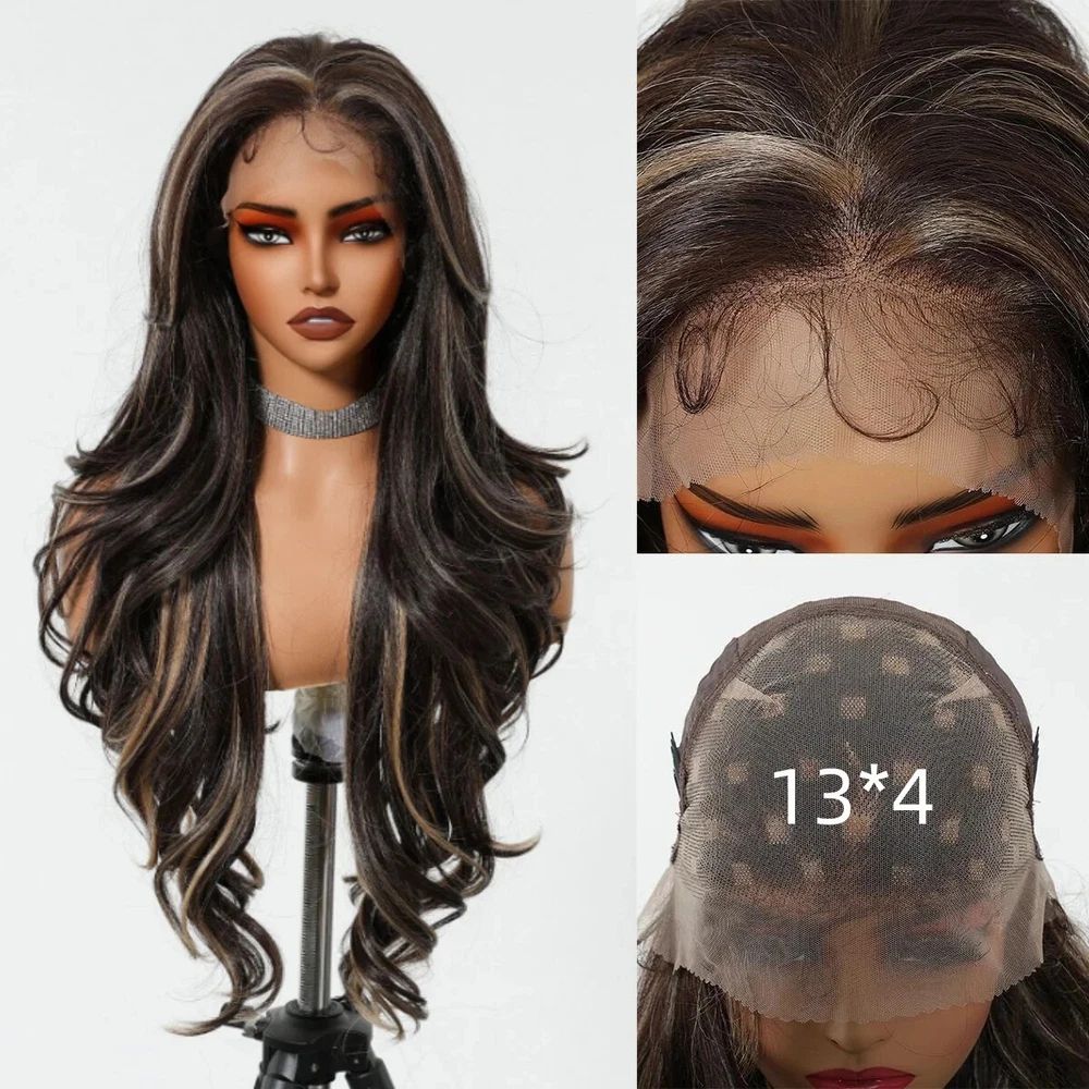 13x6 HD Body Wave Lace Front Wig Brown Highlight Blonde Hair Synthetic Wig With Baby Hair For Women Preplucked Lace Glueless Wig Features: 100% High-quality synthetic hair. Made with new high-tech technology, it has the same softness, hairline,color, density and luster as human hair.Can replace human hair for daily use. With a pre-plucked hairline like human hair for every unit it is more natural to wear. High temperature fiber wig, which can withstand a high temperature of 180 degrees Celsius Perfectly match all occasions, whether it is daily work, weddings, parties, concerts, role-playing, theme parties, Halloween or video shooting, it is your best choice. Also a great gift for relatives and friends. All pictures are real shots, no filters Wig Detail: Wig Length: 26inches-28inches Wig Density:About:280g-300g Wig Style: Straight wig for women Lace Color: Transparent Lace Part Design: Middle Part (Can make side part) Hair Material: High Temperature Fiber (synthetic lace wigs) Cap Size: 54-57cm-Average Size (You Could Adjust Straps According To Your Head) Advantage:Very Soft, No shedding, no tangle and easy to wear. Highlight 13x6 Blonde 13x6