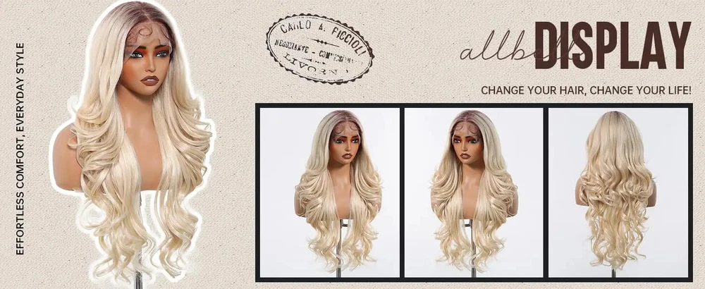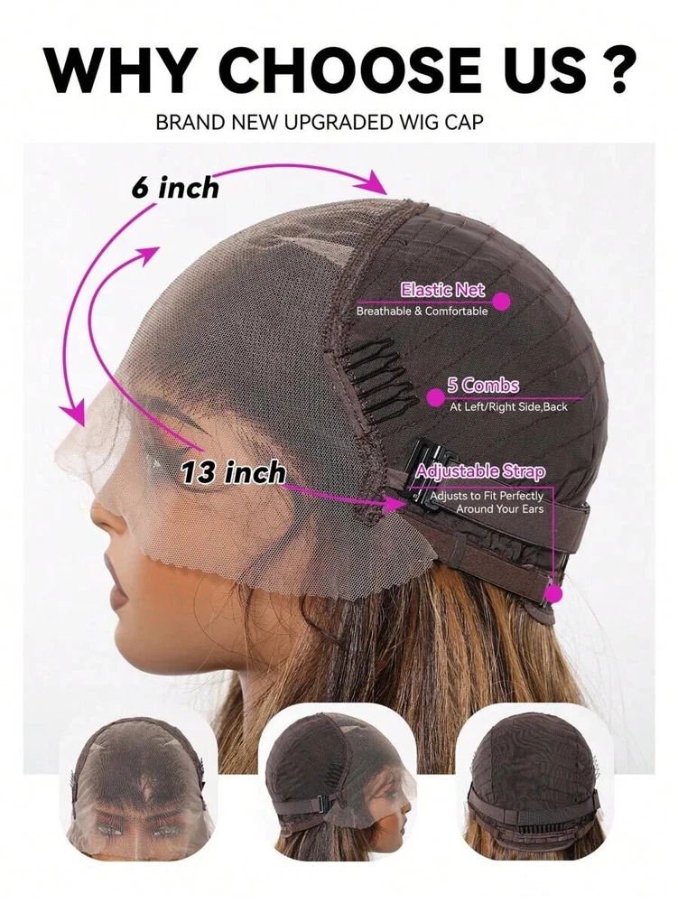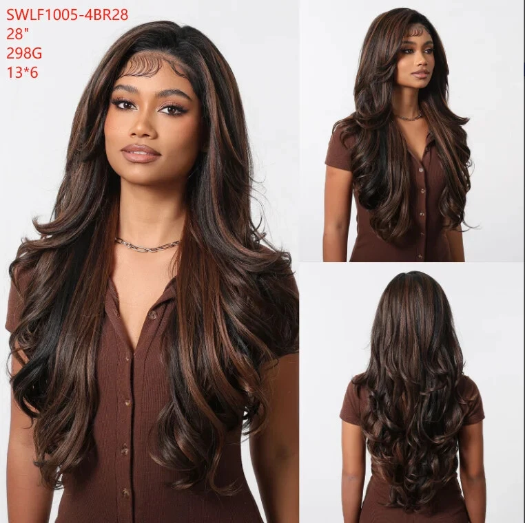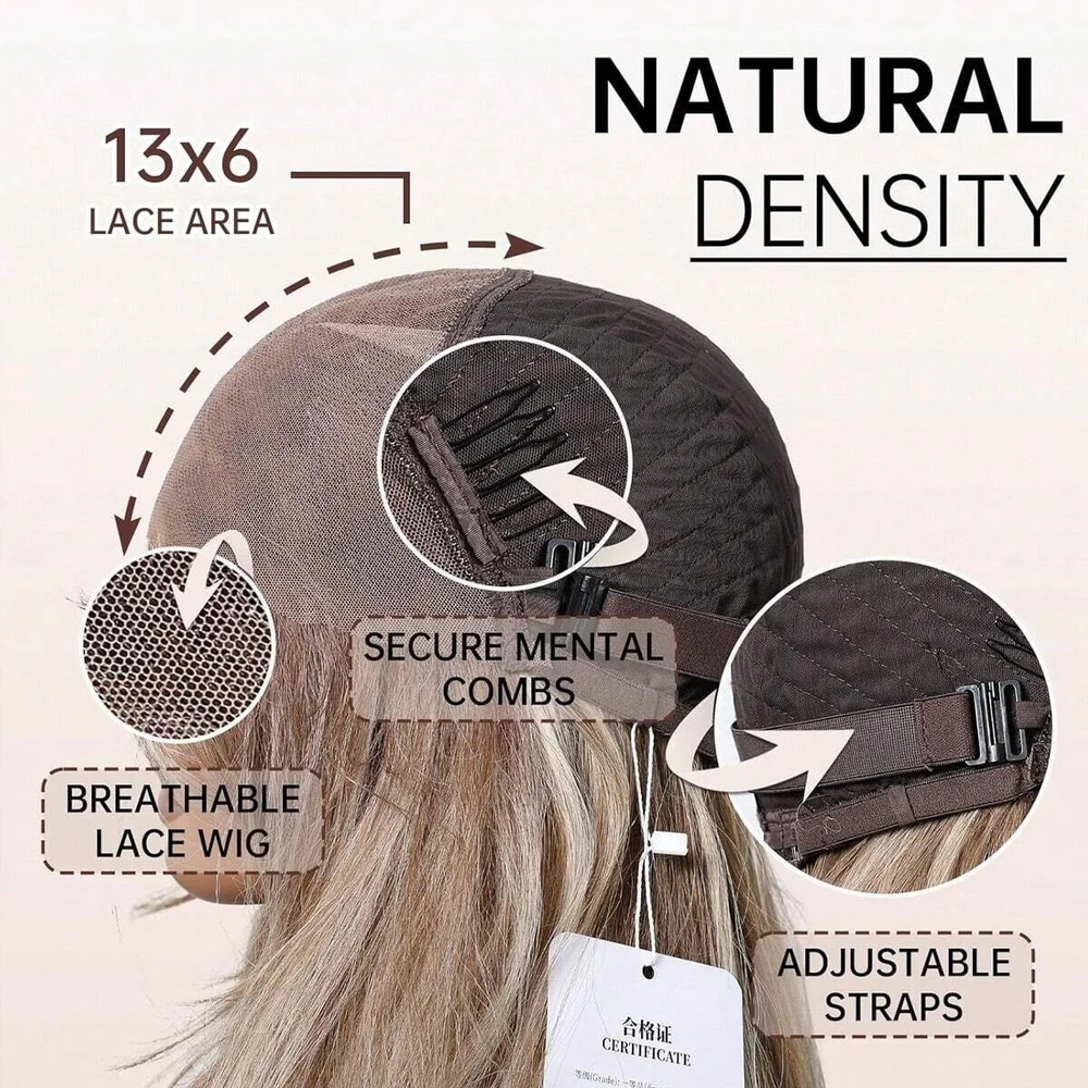 13x6 HD Body Wave Lace Front Wig Brown Highlight Blonde Hair Synthetic Wig With Baby Hair For Women Preplucked Lace Glueless Wig Features: 100% High-quality synthetic hair. Made with new high-tech technology, it has the same softness, hairline,color, density and luster as human hair.Can replace human hair for daily use. With a pre-plucked hairline like human hair for every unit it is more natural to wear. High temperature fiber wig, which can withstand a high temperature of 180 degrees Celsius Perfectly match all occasions, whether it is daily work, weddings, parties, concerts, role-playing, theme parties, Halloween or video shooting, it is your best choice. Also a great gift for relatives and friends. All pictures are real shots, no filters Wig Detail: Wig Length: 26inches-28inches Wig Density:About:280g-300g Wig Style: Straight wig for women Lace Color: Transparent Lace Part Design: Middle Part (Can make side part) Hair Material: High Temperature Fiber (synthetic lace wigs) Cap Size: 54-57cm-Average Size (You Could Adjust Straps According To Your Head) Advantage:Very Soft, No shedding, no tangle and easy to wear. Highlight 13x6 Blonde 13x6