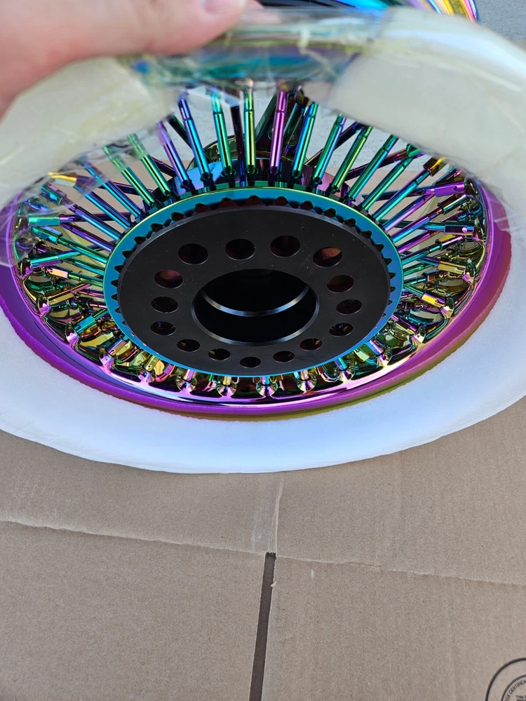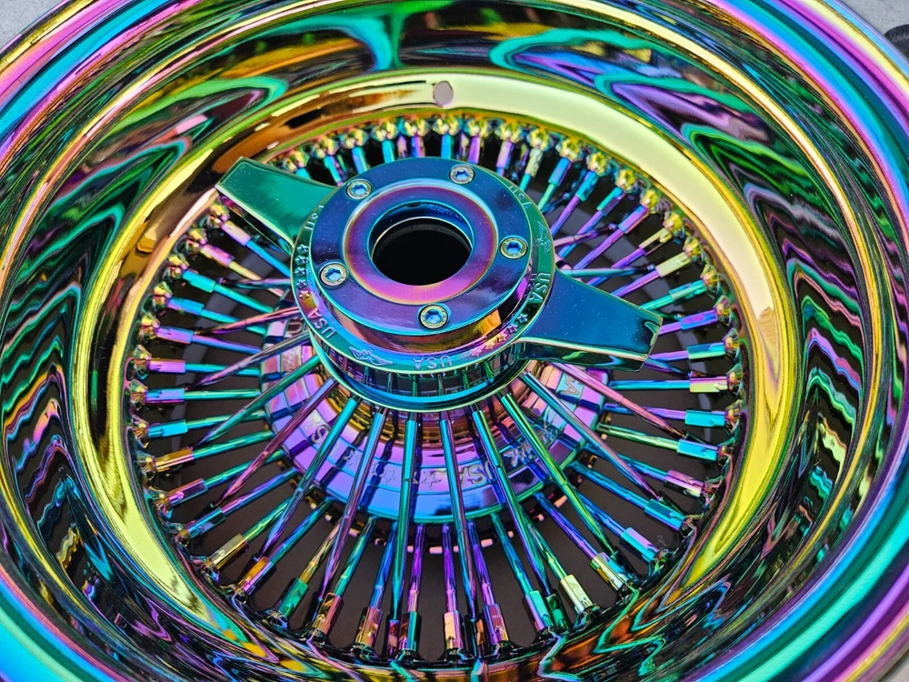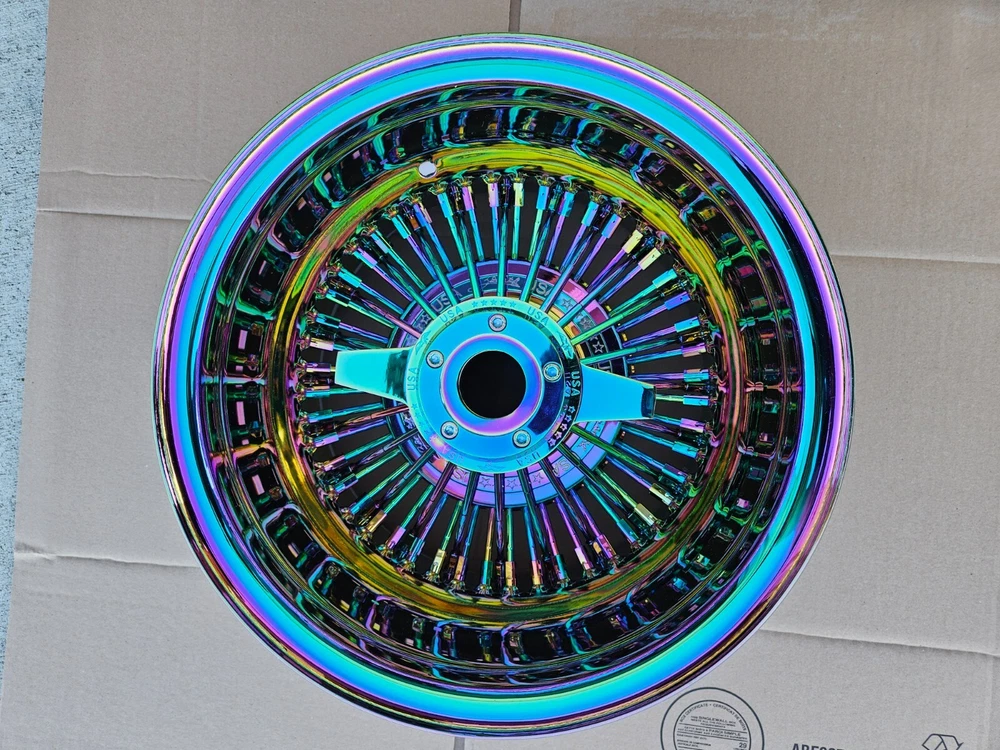Welcome to Wheel Parts King. New set of 4 custom wire wheels (4) 13x7 reverse 72 spoke wheels electroplated color change(Radium) in color (4) 5 lug adapters with lug patterns 5x5...5x4.5...5x4.75 (1) lead hammer no knockoff chips are included The item shown in pictures is the exact item you are purchasing. ***outside of the 48 states must message for shipping quote*** Please add us to your favorites to see all of our great products that we will be adding. Thank you