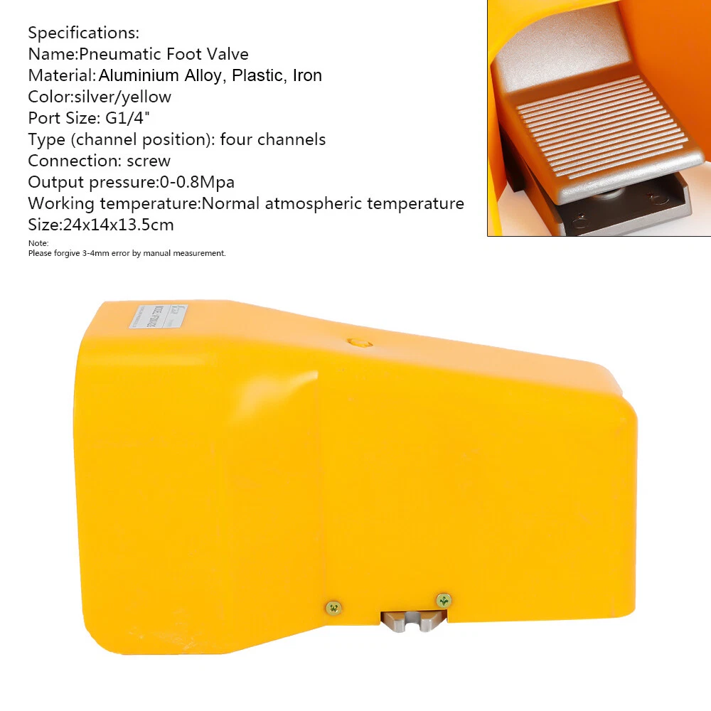 Name:Pneumatic Foot Valve Material:Aluminium alloy Color:silver/yellow Port Size: G1/4" Type (channel position): four channels Connection: screw Output pressure:0-0.8Mpa Working temperature:Normal atmospheric temperature 1 pc Pneumatic Foot Valve Note: Please allow 3-4mm error for manual measurement. 1/4" Foot Pedal Valve 2 Position 4 Channels NPT with Guard Air Pneumatic Switch Foot Pedal Valve 2 Position 4 Channels 1/4" NPT with Guard Air Pneumatic Switch Name:Pneumatic Foot Valve Material:Aluminium alloy Color:silver/yellow Port Size: G1/4" Type (channel position): four channels Connection: screw Output pressure:0-0.8Mpa Working temperature:Normal atmospheric temperature 1 pc Pneumatic Foot Valve Note: Please allow 3-4mm error for manual measurement. Payment Delivery details Terms of sales About us Contact us Payment We accept ebay payment 。 Fees such as import duties, taxes are not included in the item price or shipping costs. These charges are the buyer's responsibility. Delivery details Shipping: 2-9 working days to: USA Terms of sales We maintain high standards of excellence and strive for hundred percent customer satisfaction. Feedback is very important to us. We hope that you contact us immediately before you give neutral or negative feedback, so that we can address your concerns. It is impossible to address issues if we do not know about them! About us Your satis faction is our ultimate goal. We work hard to earn your trust and future business. Our certified technicians have tested each item before shipping. The unit comes with 1 year limited warranty on all manufacturing defects. a) If you receive a defective item, you may return it or ask for a discount. Please contact us within 14 days after you receive the package. b) What you returned must be intact and in its original packaging as re? u. Customer is responsible for shipping costs of the returned item. c) We will cover the cost of shipping back t with the shipping rate indicated in the registration page. We will send you a new unit or refund the full payment you paid. Thank you. Contact us Business Hour Business Hour: Monday To Friday: 8:30 AM to 5:00 PM (Beijing China time) Due to time zones, our reply to your questions may not be immediately. But within above working time, we will reply your email within 24 hours. If it's non-workdays, please kindly be patient and wait till Monday. Please contact us with ebay message. Please feel free to contact us if you have any questions. Monday To Friday: 8:30 AM to 5:00 PM (Beijing China time) Due to time zones, our reply to your questions may not be immediately. But within above working time, we will reply your email within 24 hours. If it's non-workdays, please kindly be patient and wait till Monday. Please contact us with ebay message. Please feel free to contact us if you have any questions. Feature 1 Easy installation,Convenient Use,Easy Operation Shipping notice Can not ship to Puerto Rico/Alaska/Hawaii Brand Unbranded MPN Does Not Apply Bundle Listing Yes Valve Operation Pedal Operated Control Material aluminium Alloy Color silver/Yellow Port Size G1/4" Type (Channel Position) Four Channels Connection Screw Output Pressure 0-0.8mpa On Feb 19, 2025 at 21:55:06 PST, seller added the following information: