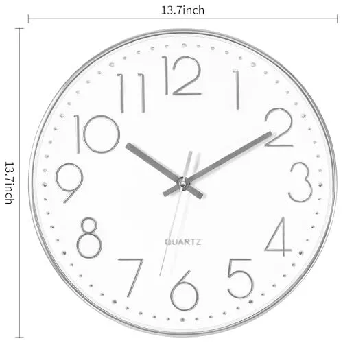 Return Policy Fast Delivery Trusted seller 14 Inch Wall Clock, Large Silent Non-Ticking Silver Wall Clock Battery Operated Round Quartz Modern Wall Clock Decorative for Living Room Bedroom Kitchen Home Office Product Description Non-ticking Mechanism: Precise quartz sweep movement s accurate time and absolutely silent environment, suitable for meeting room, guest room, classroom, kitchen and any other places which needs a silent environment. Elegant Design: Silver color frame makes it the perfect decorative wall clock for office, living room, classroom, bedroom, bathroom. Unlike other using cardboard as clock background that easy damaged in moisture and wet season, this clock back base are made of solid plastic, tfore remain well function and dry in any weather condition. Easy to Read: Silent wall clock with large numbers are clear to read, front glass cover s perfect view and keeps dust away from dial. Battery Powered: Requires 1 AA zinc carbon battery (not included). Alkaline battery or rechargeable battery which may have influence on the life span of clock movement, as well as the accuracy of the time. Easy to Hang: Come with a hook, wide slot in back for easy hanging. Shipping Returns Payment Shipping Shipping is FREE to all addresses other than APO/PO boxes in the lower 48 states. All our stock ships from US-based warehouses. Shipped via USPS or UPS (depending on location and package weight) Unless stated otherwise, all orders will ship within 24-72 hours of your payment being processed. Check our feedback to see the great reviews of FAST shipping we offer. Returns Seller does not accept returns Payment We currently accept payment via eBay managed payments only. Once payment is cleared, we will dispatch your shipment within 1-3 business days. Please refer to the "Shipping" tab for more information regarding shipping speed to your destination.