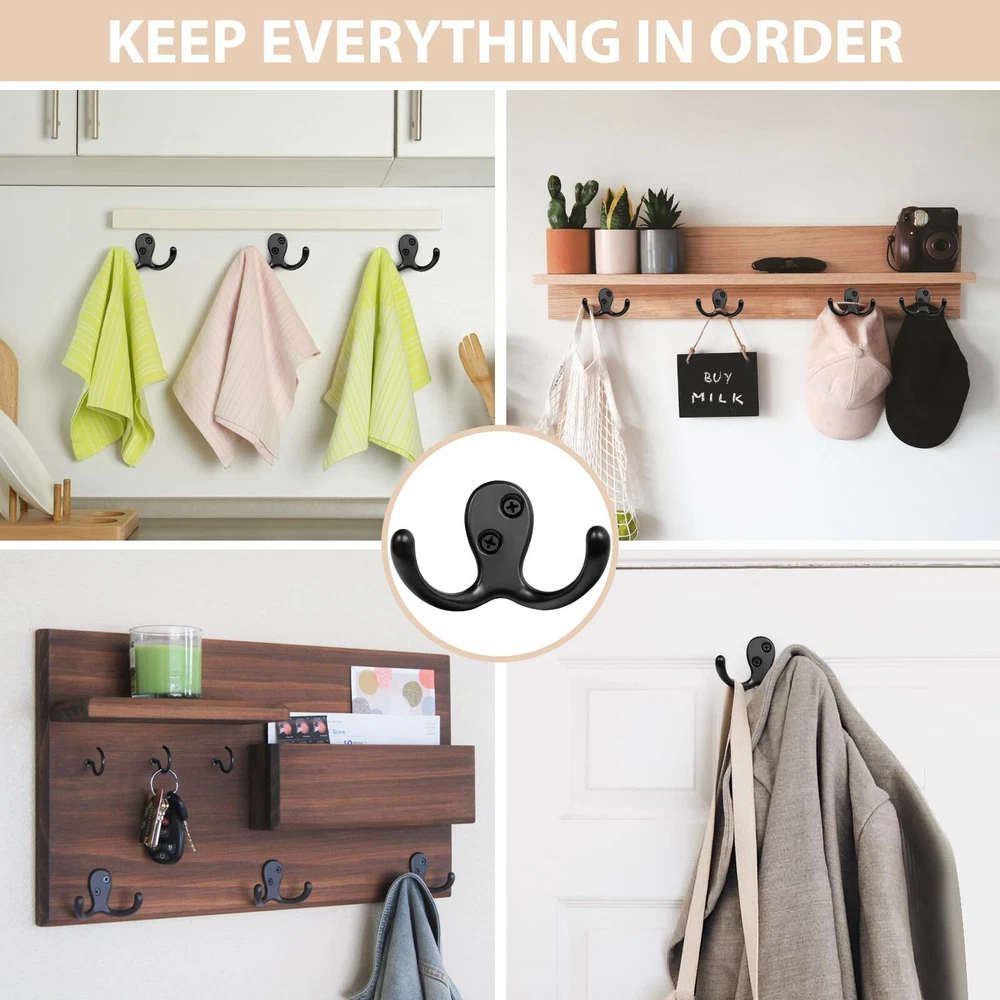 【Metal Wall Hooks Strong & Sturdy】Keep everything organized & within reach! The heavy duty double prong metal hooks are made of good quality zinc die cast material, the screws are made of iron, it can easily hold up to 40 lbs of weight, very strong sturdy and beautiful, hooks easy storage and long-term use, meet your storage needs. 【Super Cost-effective Set】14 x Black coat hooks, 28 x screws, double hooks design beautiful rustic, suitable for most decoration. closet hooks can help you organize clutter quickly, meet your different hanging needs. 【Wide Application & Space Saver】Wall hooks for hanging purse, jackets, robe, towel, coat, bag, hat, cup, key as well as Christmas socks and Christmas wreath etc. Perfect for use in bedroom, closet, bathroom, living room, entryway, and make them easy to find, helps you to save space and keep everything in order. 【Size & Specification】The hat hooks dimension is 2.8 x 1.77 inch, easy for installation, screws are 18 mm long and 6 mm in screw head diameter. 【Easy to Use】The towel hooks adopt drilling installation way, you can use the screws to mount hooks directly to closets or walls or doors.