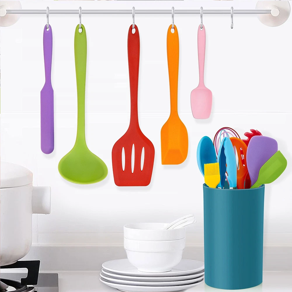 Value kitchen utensils set, all basic cooking utensils are contained in this set to meet your different cooking needs, come with soup ladle, slotted turner, pasta server, solid spoon, slotted spoon, spatula spoon, small spatula spoon, large spatula, small spatula, whisk, tong, spreader spatula, brush and utensils holder Food grade silicone, 14 pieces kitchen cookware utensils are made of premium silicone without harmful substances, no smell odor and would not react with your foods, safe and healthy for cooking, non-scratch silicone utensils protect your pans and pots Heat resistant, this heat resistant silicone cooking utensils set can withstand high temperature up to 446ºF, do not worry about melting at high temperature cooking or leaving in hot pans for a while, perfect for family everyday cooking, stirring, frying, baking and mixing Exquisite crafted, seamless one-piece molding without any gaps to capture foods to make cleaning a breeze, solid and sturdy structure will not warp, crack or deform, non-slip silicone handle is anti-scalding to prevent you getting burned, dishwasher safe to save your labor Attach utensils holder, our cooking utensils plus holder for convenient storage, each handles of kitchen set have a small hole for hanging, keep your kitchen neat and organized, colorful utensils will live up your counter, wonderful gift for wedding, housewarming, thanksgiving, Mother’s day, Christmas and more