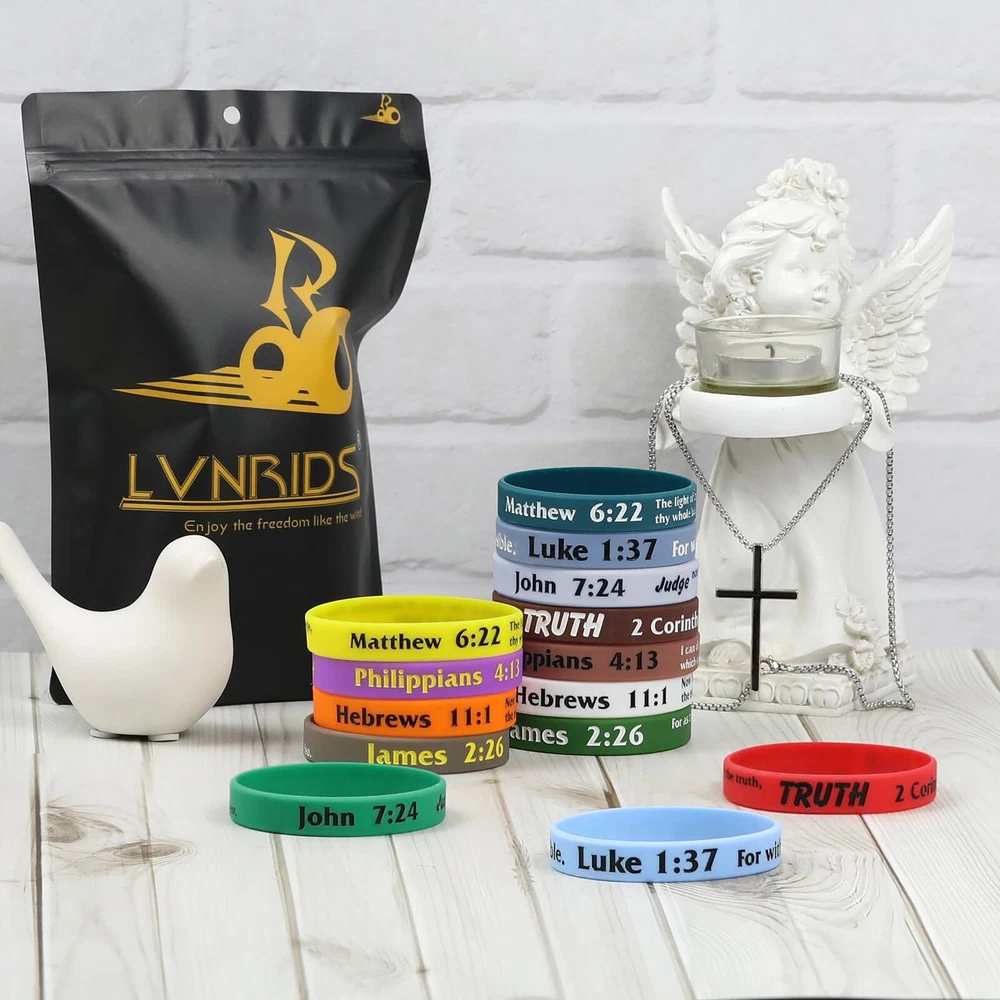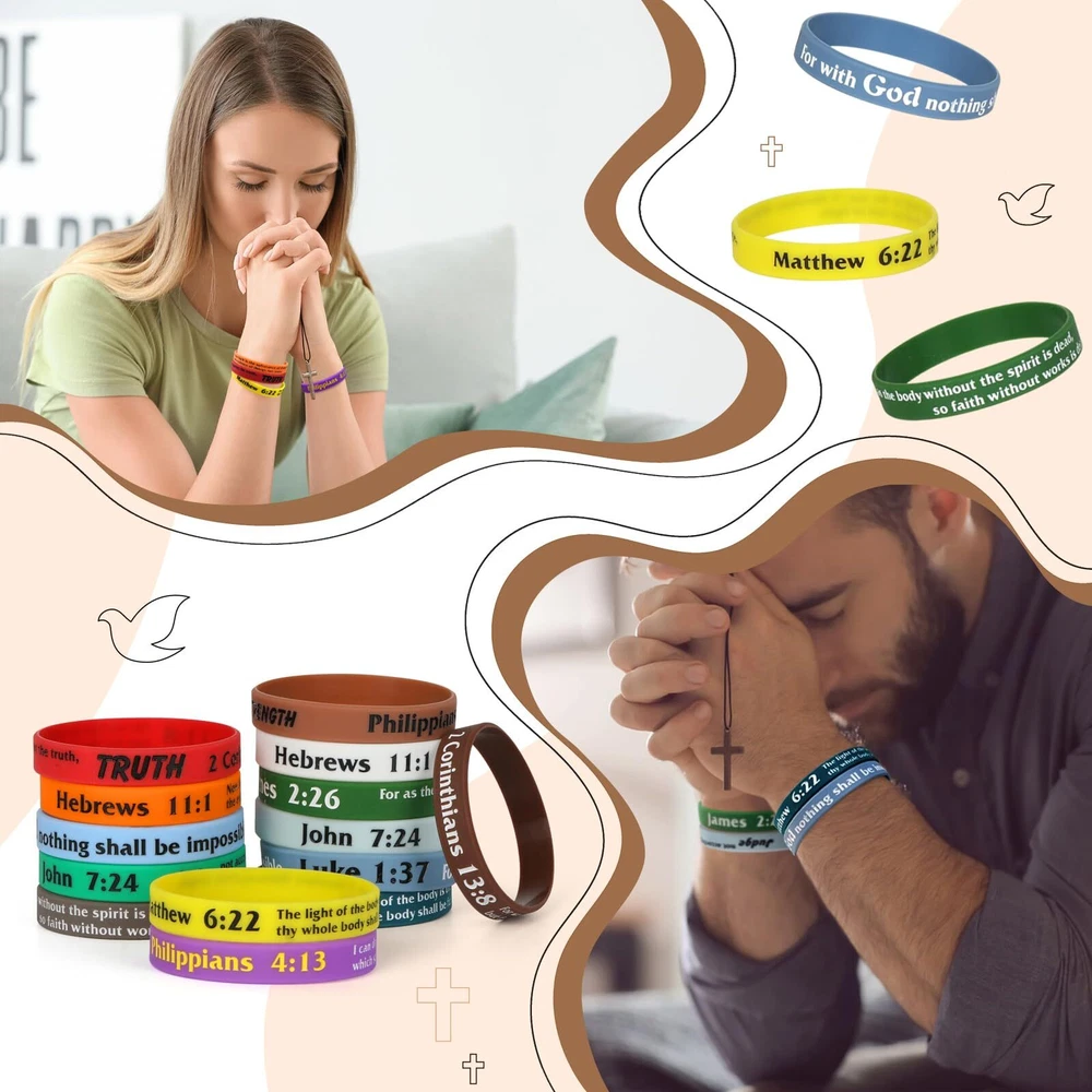 Silicone Wristbands 14 pieces Bible Bracelets: Include 14 colors. You can give them to your family, to inspire you and others to have a strong faith in God. It can be as religious gifts for men and women. Inspirational Christian Bracelet: Designed bible verse bracelets with powerful bible verses to keep the word of God close to your heart. The scriptures written are from Matthew 6:22, Luke 1:37, John 7:24, 2 Corinthians 13:8, Philippians 4:13, Hebrews 11:1, James 2:26. Bracelets Bulk Size: 8 inch length (20.2 cm circumference x 1.2 cm width x 0.22 cm thickness), measured 2.53 inch in diameter, 0.47 inch in width, can be stretched, the size fits most men, women and teenagers. Religious Bracelets Quality: CPC test report and REACH report. Made of 100% high quality silicone, eco-friendly and soft. Waterproof, durable and comfortable stretch. Ideal Gift: These religious silicone wristbands with inspirational words for motivation and positive thinking, the Lord direct your hearts into the love of God. The Bible Verse bracelets pack can be as a gift for church gatherings and retreats or outreach events, such as bible study, religious fundraisers, Christmas, Easter, and baptism celebrations.