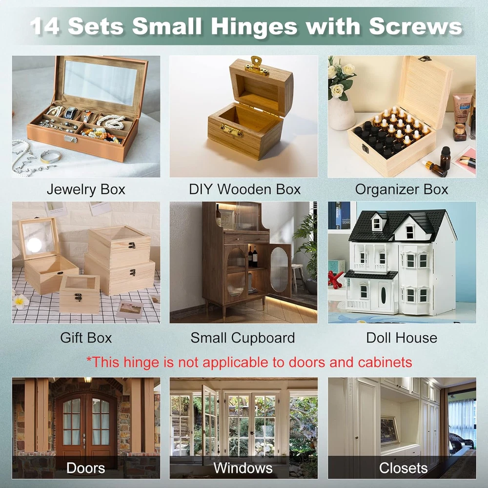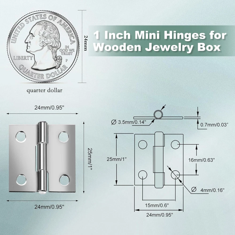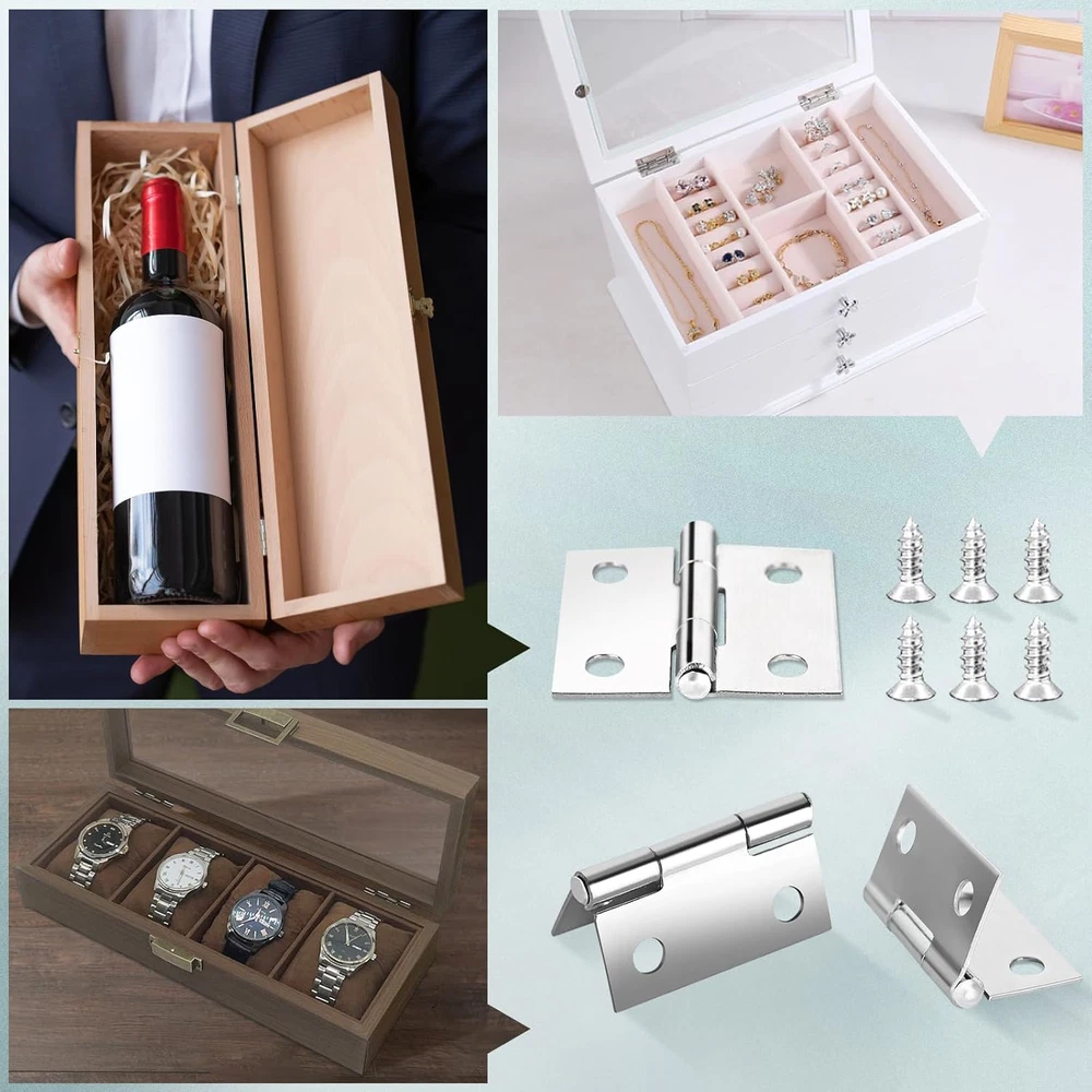 1.【Set Details】The small jewelry box hinges set contains 14 small hinges with 60 mounting screws, jewelry box hinges size 25x24mm/ 1 "x 0.95"(L*W), thickness 0.6mm. 2.【Stainless Steel Hinge】Mini hinges for wooden box is made of stainless steel, sturdy and durable, not easy to deform, long service life, brushed surface treatment, high gloss, strong bearing capacity, multi-point positioning holes, installation is very stable. Silver color. 3.【No Noise】very smooth when opening and closing the jewelry box hardware hinges, no obvious noise, smooth slide bearing hinge can be rotated 300 degrees, not easy to block or stagnation. 4.【Installation Effect】Folding size of small hinges for wooden box: 25 x 14mm/ 1" x 0.6"(L*W), expanding size: 25x 24 mm/ 1" x 0.95"(L*W). Predict the opening and closing scale of your jewelry box based on the small hinges for jewelry box data. 5.【DIY Jewelry Box】Small hinges for wood are perfect for making nostalgic crafts, wooden jewelry boxes, dollhouses, small cabinets, small carpentry projects, drawers and other small projects, looks very novel, you can not only repair the antique box at home, but also make a very beautiful jewelry box for your family as a gift. 6.【Widely Used】Mini hinges are widely used in home life, such as wooden tool boxes, gift boxes, jewelry boxes, wine boxes, small wooden storage boxes and other small boxes of DIY design, small hinges for crafts make wooden handmade creativity more convenient and varied with its lightweight and sturdy characteristics. 7.【Installation Tips】Each small box hinges comes with 4 pre-drilled holes, when using, choose the right location to mark the holes, drill the holes and then use the screws that come with the mini hinges to install, easy and fast. You can also directly use a screwdriver to screw in hard. 8.【Suggestion for Use】The mini hinges for wooden jewelry box size is relatively small, with limited load-bearing capacity, not suitable for doors, cabinets, windows, wooden boxes, tables, chairs, dressers and other large furniture, please check the hinge size carefully to match your needs. 9.【Warm Tips】The stainless steel folding butt hinges set comes with corresponding mounting screws, pay attention to storage. 10.【Packing Method】The hinges for wooden box set is packed in a transparent plastic box for easy storage.