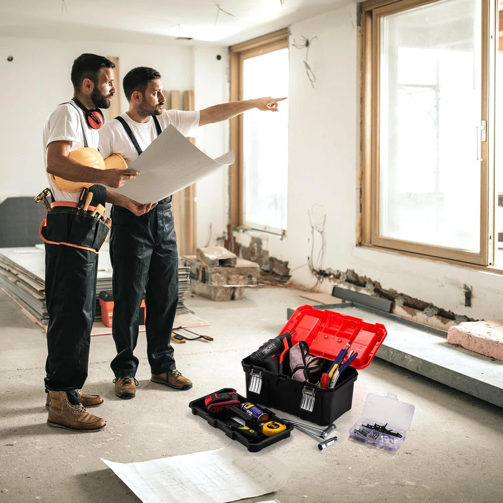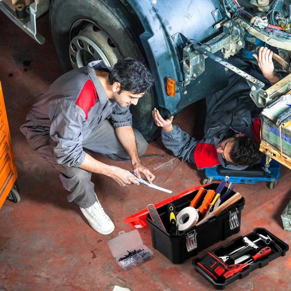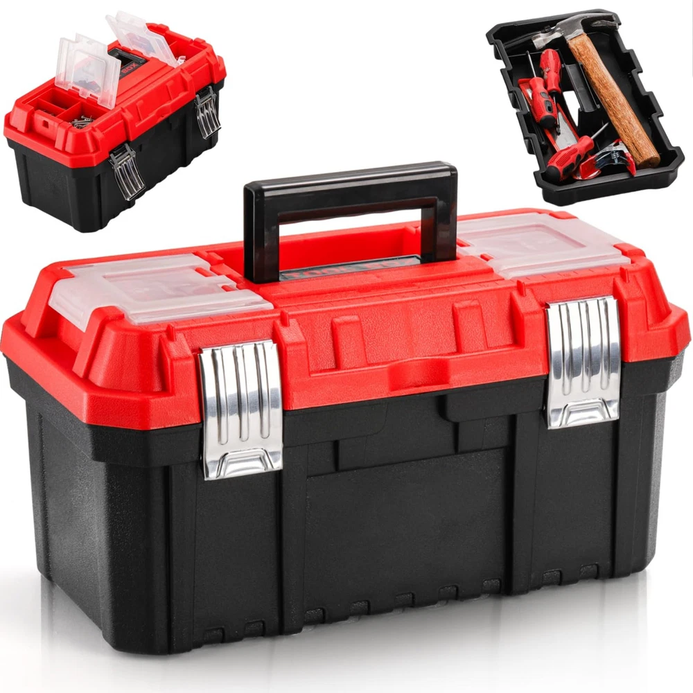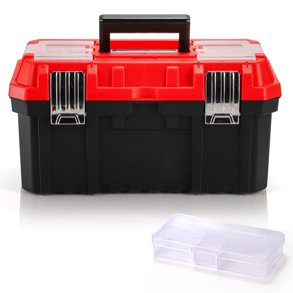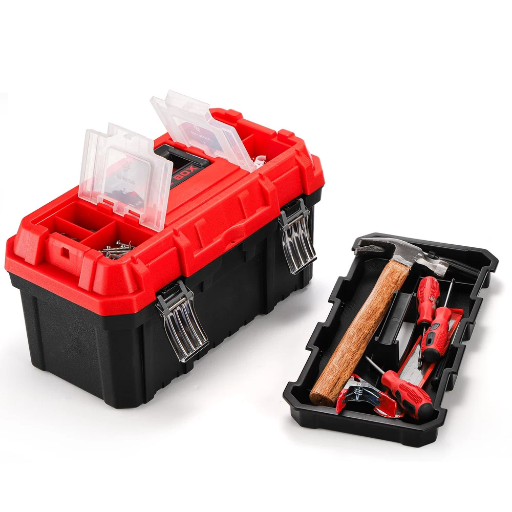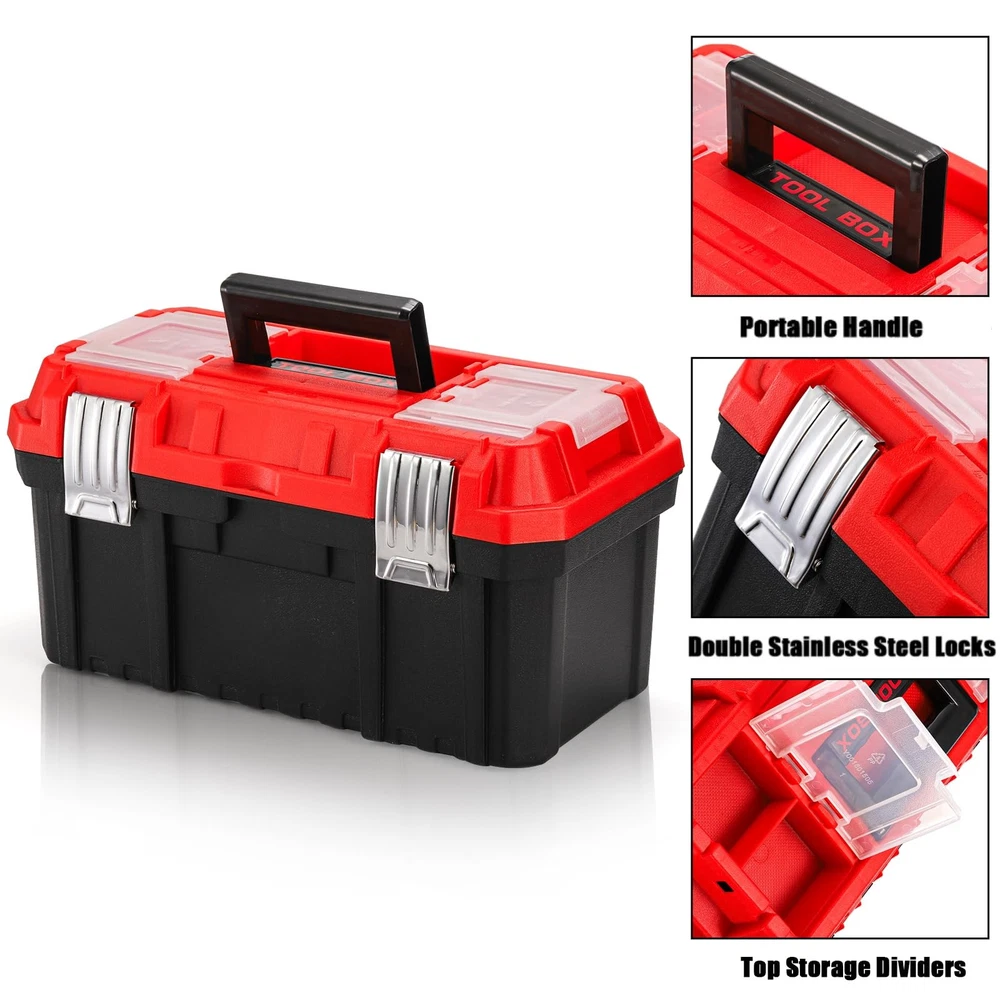 Size and Weight: The 14-inch tool box's internal dimension is 14.4"x7.68"x7.1", and external dimension is 13.8"x6.7"x6.1", around 2.4 pounds. Rugged Material: -layer plastic storage organizer is made of rugged polypropylene random construction. With high quality PPR plastic, even under extreme freezing weather, the toolbox is still resistant to falling, smashing and not cracking, ensures it is durable and sturdy. Double Lock Design: Except non-slip handle, the multi-function toolbox also features metal stainless steel double locks, more secure, safe and reliable. The double locks design will perfectly meet your needs and protect your tools from loss. Ample Storage Space: The easy access tool box has an interior removable organizer tray and a small transparent container, providing ample storage space. The top storage box can small parts, easy access to fasteners, bits, and frequently used items. Versatile: The handheld tool box with removable tray and dividers is great for the car and household, lightweight for carrying, helps you mobilize many tools, parts, and fasteners with comfort and ease. And the tray and dividers with suitable size fits to storage small wrenches, sockets, screwdrivers.