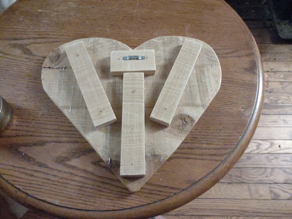 The 14" x 12" Rustic Pallet Wood Heart Decor is a charming and rustic decorative piece for your home. Made of wood with a primitive style, this heart-shaped plaque adds a touch of love and warmth to any space. Measuring 14 inches in height, this unique piece is perfect for displaying on a shelf or wall, adding a personal and cozy feel to your living decor.
