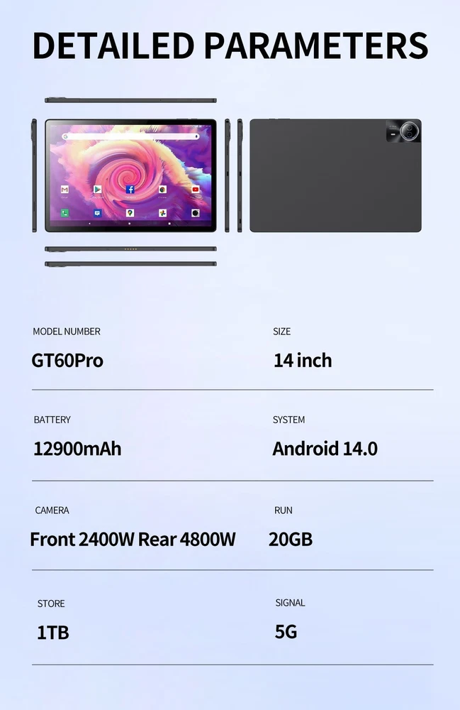 Tablet mobile phone 14 inch Ultra Big Android 14 Tablets, 1TB Storage,20GB RAM, 12900 mAh Battery , 10-Core 2.5gHz CPU,2 Speakers, 4G/5G WiFi with Case Bullet Point ★ 14 LARGE DISPLAY& 10 CORE CPU: Experience ultimate performance with the Weiboer Android Tablet featuring a robust 10-core CPU, 20GB RAM, and 1TB internal storage. Expand up to 1TB with microSD (sold separately). Enjoy seamless multitasking on the fast and responsive tablet. Its 10.1inch 4096x2160 full screen with a wide viewing angle offers high-resolution images, providing a more realistic and powerful visual experience. ★ UPGRADED ANDROID 12 TABLET: 14 inch google android tablet is equipped with a new upgraded system "Android 13", providing a more personalized, safe and easy-to-operate system experience. You can install apps like Netflix, TikTok, YouTube, LINE, Yahoo, Twitter from the Google Play Store on your GMS certified tablet. ★ 12900MAH LONG LASTING BATTERY: The 14 inch Computer Tablets is equipped with battery up to 12900mAh. Achieve up to 8 hours of video battery life, and use the Type-C port to charge more easily, regardless of positive or negative. With a weight of 996g, it is very convenient to carry it with you whether you are working, studying or going out. ★ MULTIFUNCTIONAL 14 INCH TABLET: Equipped with a 20MP + 50MP camera and By combining it with the flash, it is thought that shooting in dark places will be really improved. iMeshbean tablets android Bluetooth 5.0 supports high-fidelity headphones for sound quality enjoyment. Great for work or pleasure, use this tablet for video conferencing, gaming, streaming, or even as an e-reader in your preferred language. ★ 2 IN 1 TABLE WITH KEYBOARD LEATHER CASE: Tablet connect with Keyboard, change 2 in 1 laptop; Tablet case, Screen protector and Touch pen can better use. ★ SEAMLESS CONNECTIVITY: Get fast and stable internet connectivity with 2.4G/4G/5G WiFi that offers better range and speed, undisturbed streaming, gaming or browsing. The sturdy metal frame adds durability to this WiFi Android tablet, making it perfect for everyday use . ★ IDEAL CHOICE FOR GIFT: With exceptional performance, a chic aesthetic, and exquisite packaging, this tablet stands as the ideal gift for occasions like Christmas, Valentine's Day, birthdays etc, Its impressive features ensure a memorable and versatile present for your loved ones. Specification 14 inch Tablet Brand XYLORE Model GT60 Shell Metal aluminum alloy shell Color Black Silve Display 14 inch Resolution 4096X2160 Keyboard Backlight Bluetooth Keyboard(Support external keyboard) CPU T616 Core 10 core Storage 8GB RAM +256GB ROM Camera Front Camera:500W Rear Camra:1300W Battery 12900mAh Operating system Android 14 Bluetooth BT5.0 Processor Speed 2.5 GHz Microphone 42db 2.2kΩ Speaker Built-in 8Ω 1W TF Card Micro SD Earphone 3.5MM Interface Type Cx1, headphone jack 3.5 mm x1, microSD slot x1 DC power x1 Power adapter 5V 3A Package included 1x14inch Tablet 1xbluetooth keyboard 1xCharger 1xKeyboard Case 1xWireless Mouse 1xTouch pen 1xEarphone 1xEnglish Manual 1xMouse Package List 1x14 inch Tablet 1x14 inch bluetooth keyboard 1xCharger 1xKeyboard Case 1xTouch pen 1xEarphone 1xEnglish Manual 1xMouse