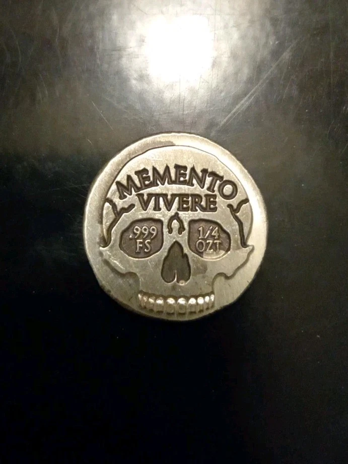 The product is a 1/4 oz round made of 0.999 fine silver, hand poured by Mutiny Metals. The round features a design with the words "Memento Vivere" inscribed on it. This unique piece contains a quarter ounce of pure silver, making it a valuable addition to any collection or investment portfolio. The round's round shape and high silver content make it a desirable item for those interested in bullion and precious metals.