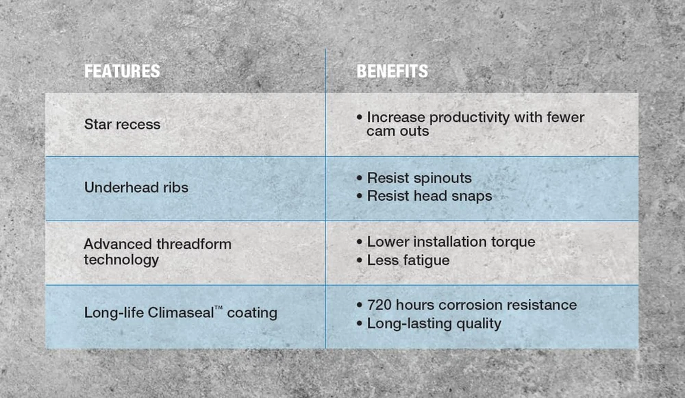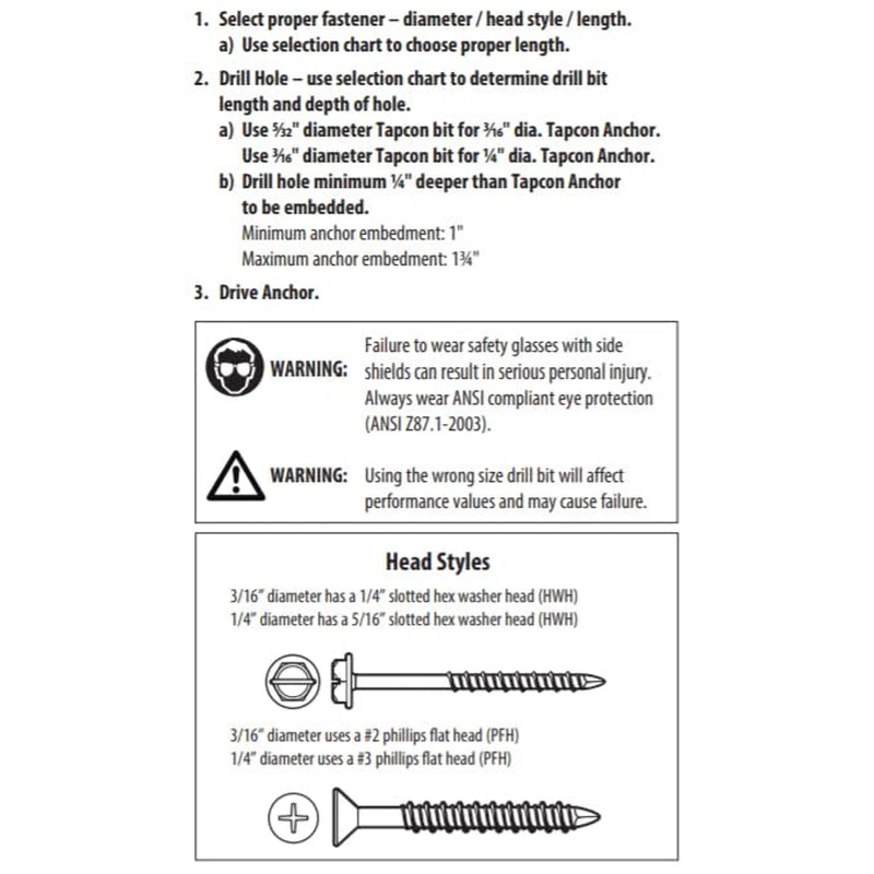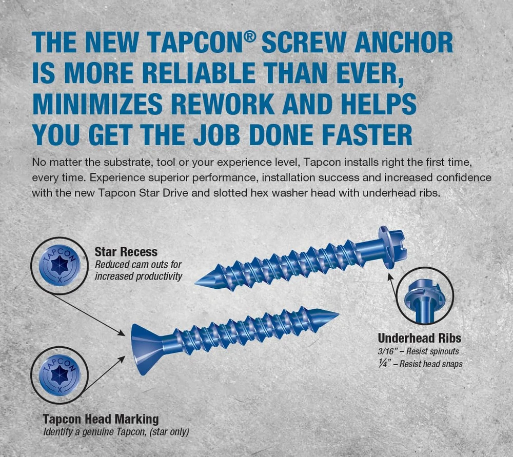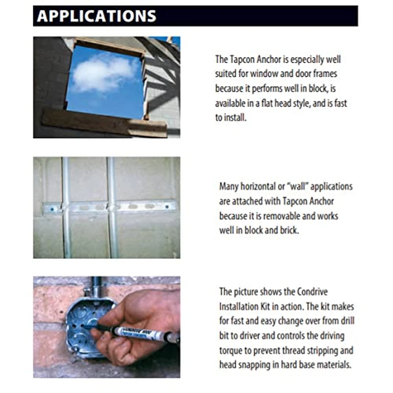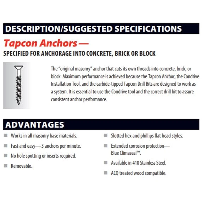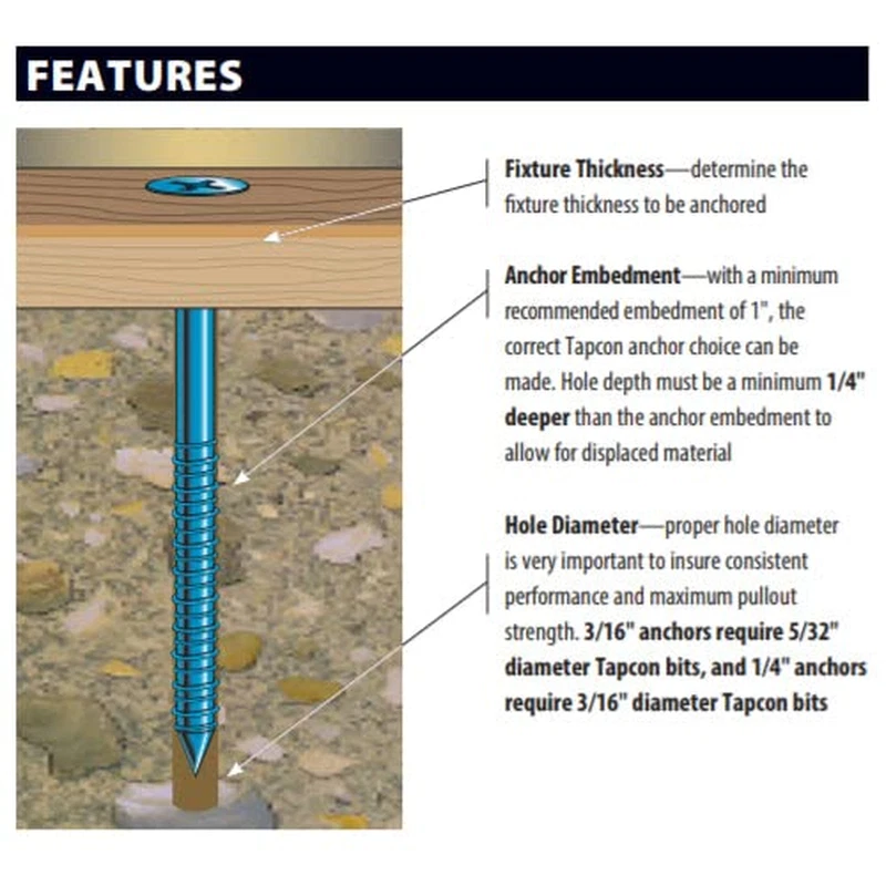 Tapcon anchors are masonry screws designed with Advanced Threadform Technology which cuts threads into all masonry materials including concrete, block and brick Many applications that include shelving brackets used in electrical equipment, HVAC strapping, 2x4 lumber, wood headers, window frames, jambs & sills, door frames to masonry, plywood backer boards to masonry & exterior installation into masonry Approved for use in ACQ treated lumber Tapcon anchors are masonry screws designed with Advanced Threadform Technology which cuts threads into all masonry materials including concrete, block and brick. Many applications that include shelving brackets used in electrical equipment, HVAC strapping, 2x4 lumber, wood headers, window frames, jambs & sills, door frames to masonry, plywood backer boards to masonry & exterior installation into masonry. Approved for use in ACQ treated lumber.