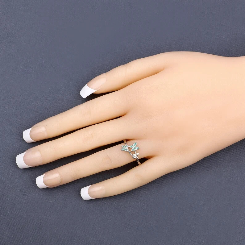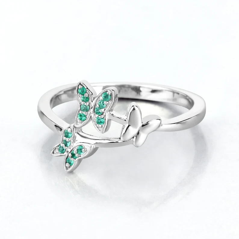 This is a stunning butterfly ring featuring a 1.40 Ct round simulated emerald stone in a 14k white gold plated setting. The ring is handmade with sterling silver, nickel-free, and adjustable. It can be personalized and engraved to suit the occasion, such as engagement, Mother's Day, or weddings. The design is elegant and whimsical, perfect for those who appreciate beauty and nature-themed jewelry.