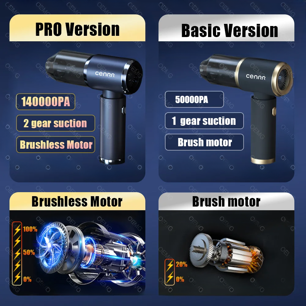 Introduction [Product Name]: Multifunctional Vehicle Vacuum Cleaner [Product functions]:mainly cleaning cars, vacuuming, blowing dust and so on [Package list]: vacuum cleaner X1 Accessories X 6 Charging line X 1 User manual X 1 [weight]:590g for Basic,610g for Pro Version Introduction 【Pro version】 [Product material]: ABS [Motor]: New upgraded Brushless motor [Color]: Elegant Silver [Vacuum degree]: 140000PA [Rated speed]: 35500rpm [Capacity of lithium battery]: 2 * 2000mAh [Charging mode]: Type-C charging line [Noise]: ≤ 32dB [Operating temperature]: - 20 ℃~+50 ℃ 【Basic version】 [Product material]: ABS [Motor]: Brushed motor [Color]: Glamour Black [Vacuum degree]: 50000PA [Rated speed]: 15500rpm [Capacity of lithium battery]: 2 * 2000mAh [Charging mode]: Type-C charging line [Noise]: ≤ 32dB [Operating temperature]: - 20 ℃~+50 ℃