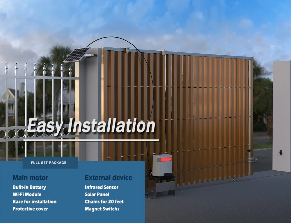 This gate opener is a game-changer! The powerful motor handles heavy gates effortlessly, and the solar panel keeps it running without extra costs. Love the WiFi control—so convenient to open the gate from my phone. The safety sensors work perfectly, stopping instantly if something’s in the way. Installation was straightforward, and the battery backup ensures it works even during power outages. Super reliable in all weather, and the remote controls are a nice bonus. Highly recommend for anyone needing a secure, low-maintenance gate solution!