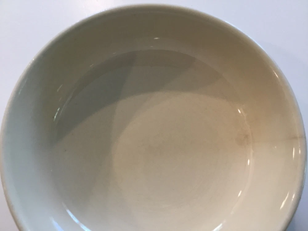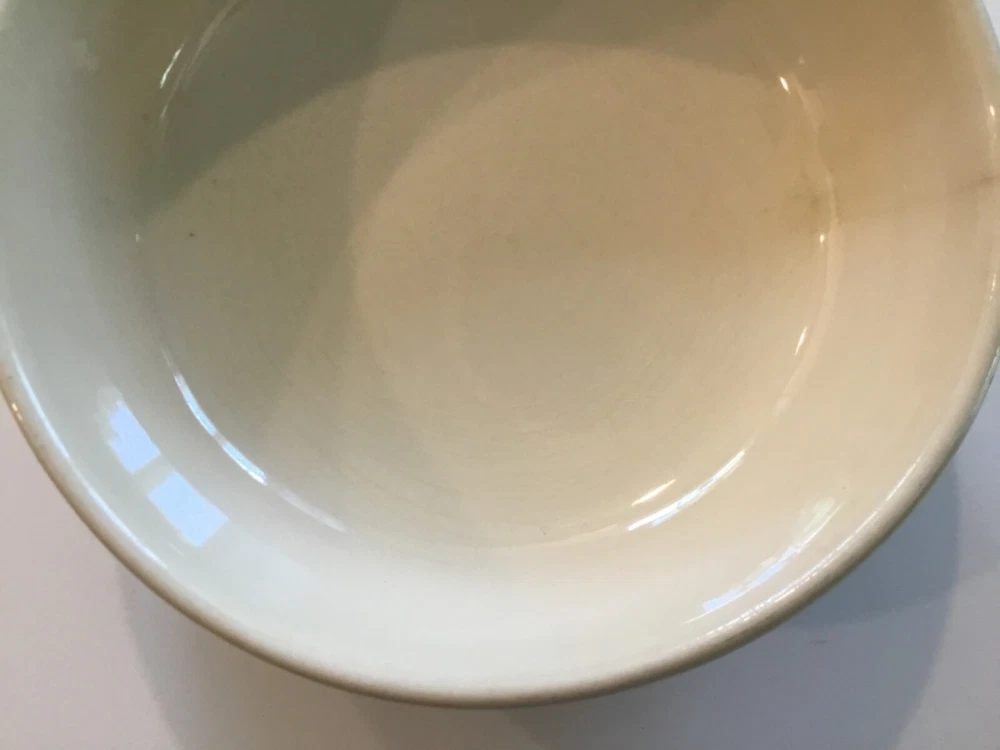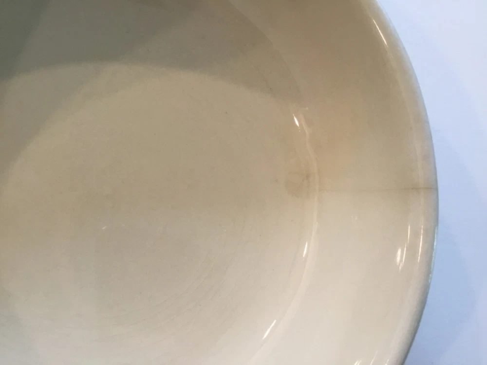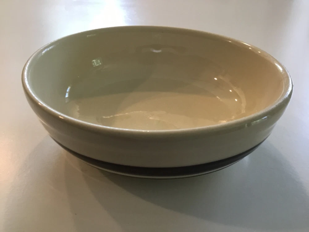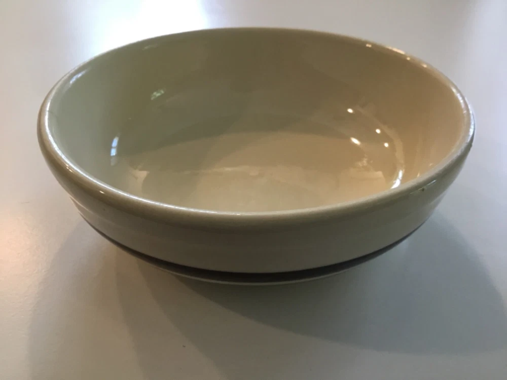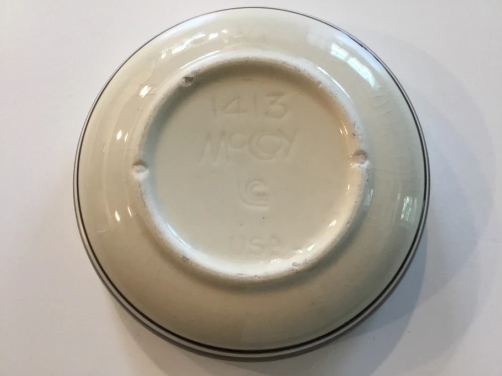 1413 McCoy Bowl USA Beige with two dark brown stripes. Crack on side. The bowl is used and has some scuff marks and scratches with a visible crack on the side. The bowl does not leak. This may be pottery but I am not certain. See photos. Sold “As Is”.