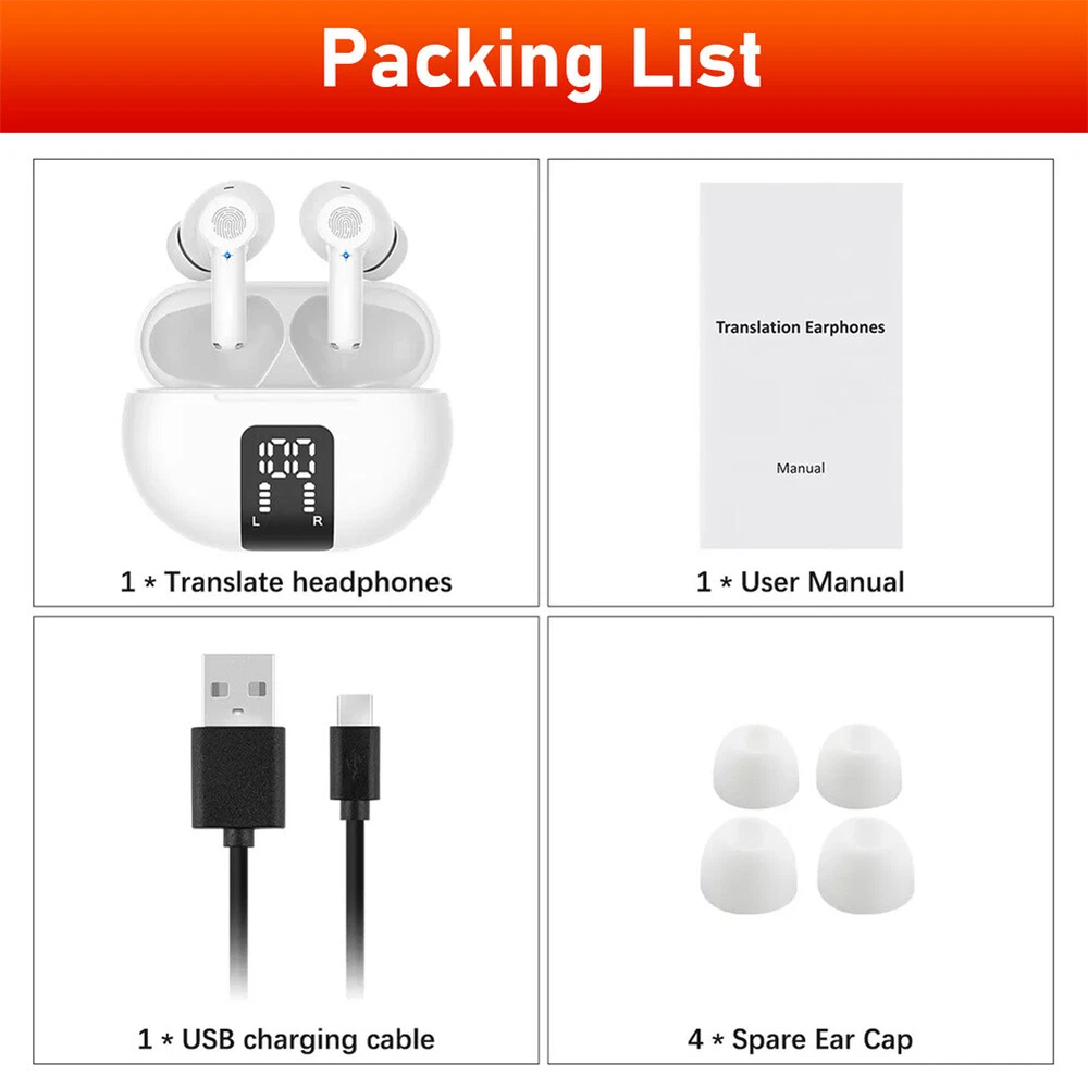 Product Description 144+ Language Translator Earbuds Wireless Bluetooth Two Way Translator Device Features: - These earbuds support two-way real-time translation in 144 languages with up to 97% accuracy, enabling seamless cross-language communication. - Easily pair the earbuds with your mobile phone via Bluetooth for simultaneous interpretation in touch or speaker mode, while also supporting music playback and call functions. - The intuitive touch controls allow you to play music or answer/reject calls conveniently, with advanced noise cancellation ensuring clear conversations and 97% accuracy within just 1 second. - Built-in charging indicator lights help you monitor battery levels, and the USB-compatible charging case ensures your earbuds stay powered on the go. - The lightweight, ergonomic design fits the shape of the human ear, providing long-lasting comfort and an immersive music experience. Specifications: BT Version: BT 5.3 Battery Capacity: 5V/1Ah Li-polymer button battery Charging Case: 5V/1Ah Li-polymer battery Working Time: 4-6Hours Charging Interface: Type-C Packing list: 1 x Translate headphones 1 x User Manual 1 x USB charging cable 4 x Spare Ear Cap Note: 1. Offline translation requires extra payment. If you don't need it, you don't need to spend money to buy it. 144 free online languages. 2. It needs to be used in conjunction with the app. Scan the code to download the app, and the standard version will be shipped for free for one year. TRANSLATOR EARPHONE -SUPPORT 144+LANGAGES: South Africa Dutch language, Albanian language, Amharic, Arabic (Algeria), Arabic (Bahrain), Arabic (Egypt), Arabic (Iraq), Arabic (Israel), Arabic (Jordan), Arabic (Kuwait), Arabic (Lebanon), Arabic (Morocco), Arabic (Oman), Arabic (Qatar) Arabic (Saudi Arabia), Arabic (the State of Palestine), Arabic (Tunisia), Arabic (the United Arab Emirates), Arabic (Yemen), Armenian language, Azerbaijani language, Basque language, Bosnian language, Burmese language, Bengali language (Bangladesh), Bengali language (India), Bulgarian language, Catalan language, Chinese (Simplified), Chinese (Traditional) Chinese (Cantonese), Croatian language, Czech language, Danish language, Dutch language (Belgium), Dutch language (Netherlands), English (Australia), English (Canada), English (Ghana), English (Hong Kong), English (India), English (Ireland), English (Kenya), English (New Zealand), English (Nigeria), English (Philippines), English (Singapore), English (South Africa) English (Tanzania), English (United Kingdom), English (United States), Estonian language, Filipino language, Finnish language, French (Belgium), French (Canada), French (France), French (Switzerland), Galician language, Georgian language, German (Austria), German (Germany), German (Switzerland), Greek, Gujarati language, Hebrew language, Hindi, Hungarian language, Icelandic language Indonesian language, Italian (Italy), Italian (Switzerland),Japanese, Javanese language, Kannada, Kazakh language, Khmer language, Korean, Lao language, Latvian language, Lithuanian language, Macedonian language, Malay language, Malayalam, Marathi language, Mongolian language, Nepali language, Norwegian language, Persian language, Polish language, Portuguese (Brazil), Portuguese (Portugal), Punjabi language Romanian language, Russian, Serbian language, Sinhala language, Slovak language, Slovene language, Spanish (Argentina), Spanish (Bolivia), Spanish (Chile), Spanish (Colombia), Spanish (Costa Rica), Spanish (Dominican Republic), Spanish (Ecuador), Spanish (El Salvador), Spanish (Guatemala) Spanish (Honduras), Spanish (Mexico), Spanish (Nicaragua), Spanish (Panama), Spanish (Paraguay), Spanish (Peru), Spanish (Puerto Rico), Spanish (Spain), Spanish (United States), Spanish (Uruguay), Spanish (Venezuela), Sundanese language, Swahili language (Kenya) Swahili language (Tanzania), Swedish language, Tamil language (India), Tamil language (Malaysia), Tamil language (Singapore), Tamil language (Sri Lanka), Telugu language, Thai, Turkish language, Ukrainian language, Urdu (India), Urdu (Pakistan), Uzbek, Vietnamese language, Zulu language TRANSLATOR EARPHONE -SUPPORT 8 OFFLINE LANGAGES : Supports 8 precise offline usage options for payment: Chinese, English, Japanese, Korean, German, Spanish, Russian, and French