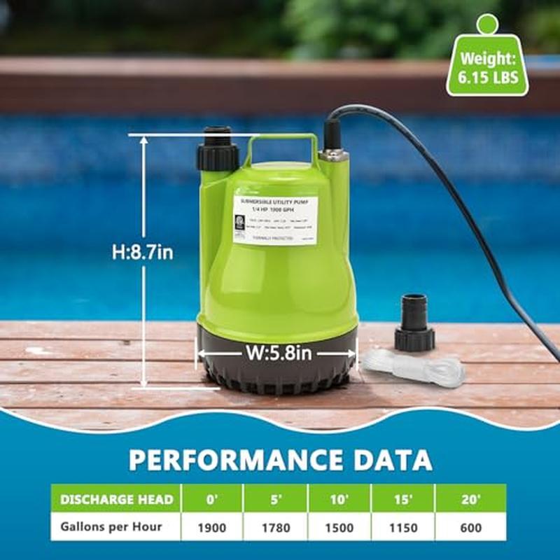 You may also like Portable Low Suction Electric Water Transfer Removal Utility Pump on/Off Switch 83.91 USD 88.33 USD Free shipping 5% off Sump Pump Thermoplastic Utility Pump Portable Electric Water Pump for Basement 97.91 USD 103.06 USD Free shipping 5% off Portable Electric Utility Water Transfer Pump 115V 1/10 HP with Suction Hose Kit 88.33 USD 92.98 USD Free shipping 5% off 1/3HP Sump Pump Submersible Unique Flow Sensor Switch for Pools Hot Tub Backyard 111.9 USD 117.79 USD Free shipping 5% off 330 GPH Portable Electric Water Transfer Removal Utility Pump W/Suction Hose Kit 72.13 USD 75.93 USD Free shipping 5% off About this item EFFICIENT UTILITY PUMP: 1/4 HP powerful motor offers a maximum flow rate of 1900 Gallons Per Hour with 1" discharge hose horizontally. This pump has the ability to lift water up to Max. 23 feet of vertical height. Removable suction screen and handles CLEAN WATER up to 1/5 inch solids COMPACT & LIGHTWEIGHT: The portable handle design, along with a 16. 4' power cable and a 26' rope, makes the pump easy to carry and install. Item weight: 6 lbs. This pump can be used in a minimum 7"x7" pit. It's perfect for a water tank, hot tub, rain barrel, swimming pool, garden pond, and more SIMPLE MANUAL CONTROL: It works by manual plug-in/out operation. The minimum water level to start working is around 6", and it can remove water down to 3/5". Just don't risk the pump to be dry running SAFETY & TOUGH: Full corrosion-resistant shell and environmental thermoplastic construction with thermal overload protection ensure durability for household and utility applications. ETL Listed EASY INSTALLATION: Two plastic hose adapters are included: GHT 3/4" connects standard garden hose for quick installation, and 1" connects discharge hose for high-capacity pumping › product details Color:Green Material:Plastic Style:1/4HP 1900GPH Product Dimensions:5. 8"L x 5. 7"W x 8. 7"H Power Source:ac Item Weight:6. 15 Pounds : :1/4HP Utility Pump 1900GPH Portable Submersible Sump Pump, Manual Control with 16.4 Ft Cord for Draining Water from Pool Pond Garden Hot Tub Basement Tankless Heater Liquids : You may also like 9' Patio Umbrella Outdoor Table Market Umbrella Waterproof with 8 Sturdy Ribs 82.15 USD 86.47 USD Free shipping 5% off Room Darkening Blackout Grommet Top Curtain Panel Pair Thermal Insulated Bedroom 33.94 USD 35.73 USD Free shipping 5% off Popcorn Maker Machine Vintage Popcorn Machine Movie Theater Professional Cart 247.98 USD Free shipping Portable Laptop Table with Charging Station Height Adjustable Standing Computer 77.78 USD 81.87 USD Free shipping 5% off 9-Piece Simple Cooking Non-Stick Aluminum Cookware Set Lightweight Easy Cleaning 31.46 USD 33.12 USD Free shipping 5% off Deluxe Multi-Bin Toy Organizer Stackable Cube Storage with Storage Bins Playroom 62.49 USD Free shipping 1 Pair 6 Ton Jack Stands Heavy Duty Car Truck Lift Tire Change Lifting Garage 96.48 USD 101.56 USD Free shipping 5% off 1/2" Drive Deep Impact Socket Set 9-Piece Spindle Axle Nut Metric 6 Point Socket 58.88 USD 61.98 USD Free shipping 5% off 20" Modern Round Indoor Analog Wall Clock Arabic Numbers Living Room Bedroom 42.94 USD 45.2 USD Free shipping 5% off Commercial Grade Multi-Purpose Microfiber Cleaning Towel Roll Reusable for Home 30.6 USD Free shipping Fabric Upholstered Accent Chair with Rattan Sides for Living Room Bedroom Lounge 122.07 USD 128.49 USD Free shipping 5% off 2 Pack 15 x 6.00-6 Tire and Wheel Set for Lawn Tractors with 3” Centered Hub 103.06 USD 108.48 USD Free shipping 5% off
