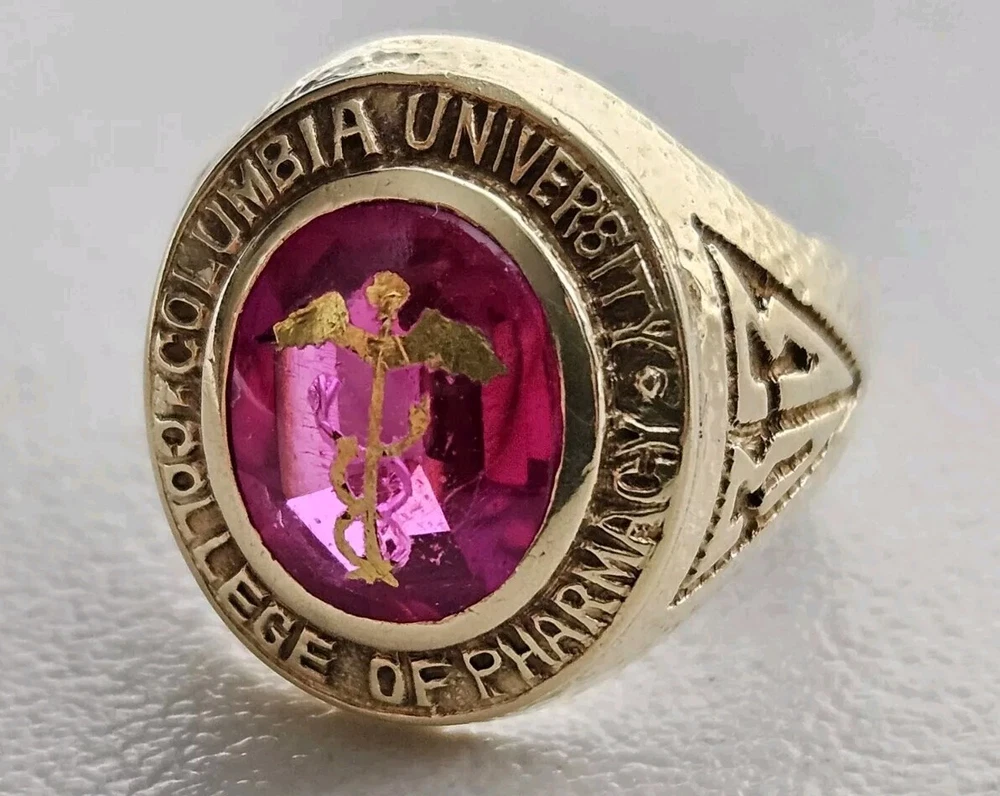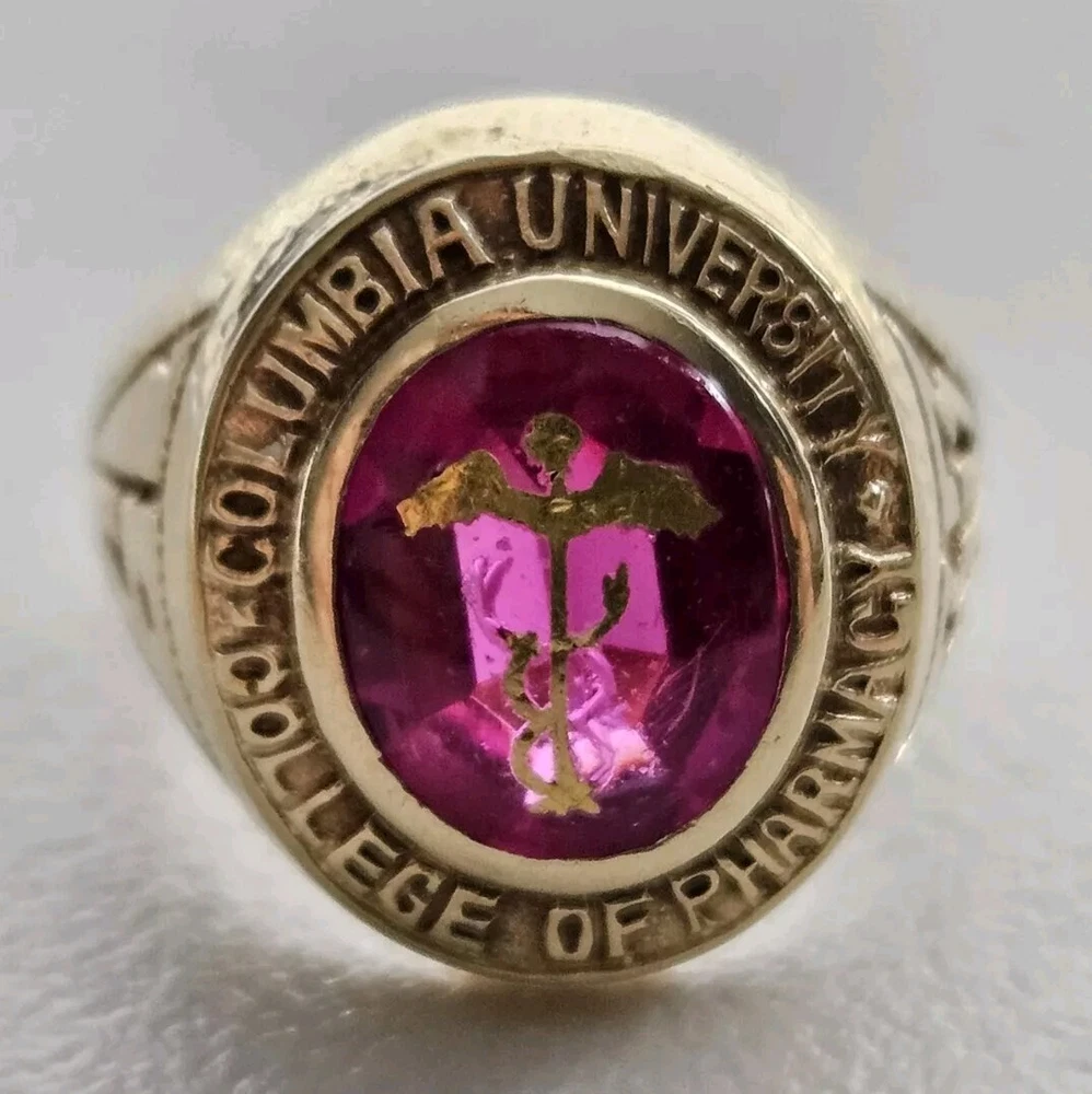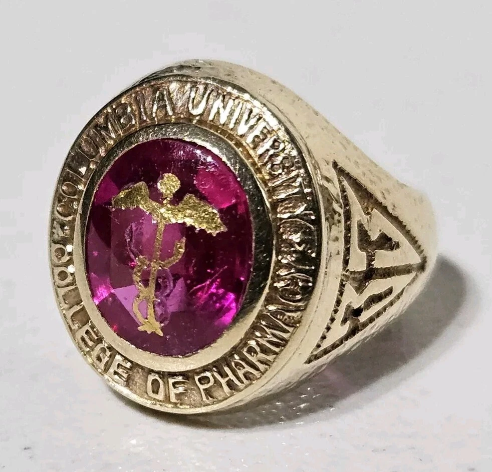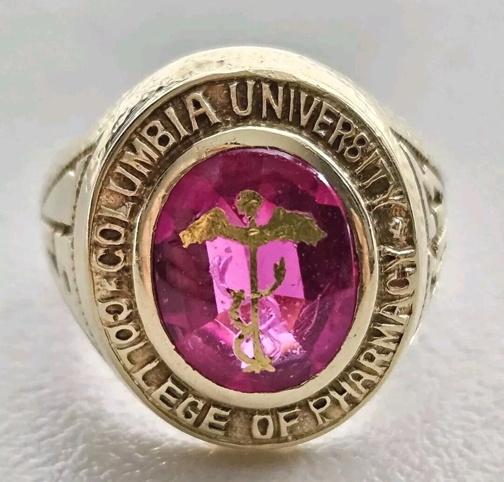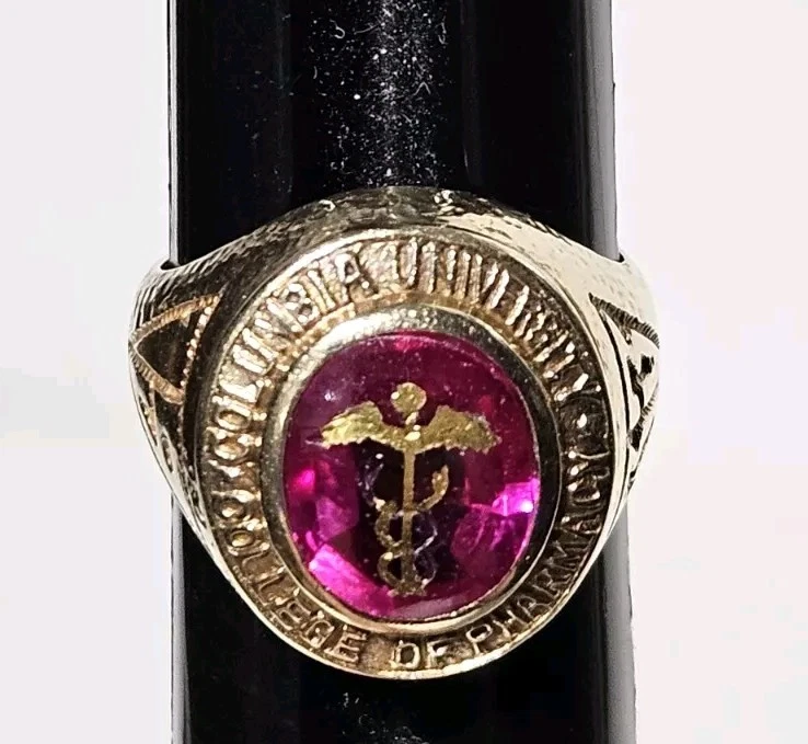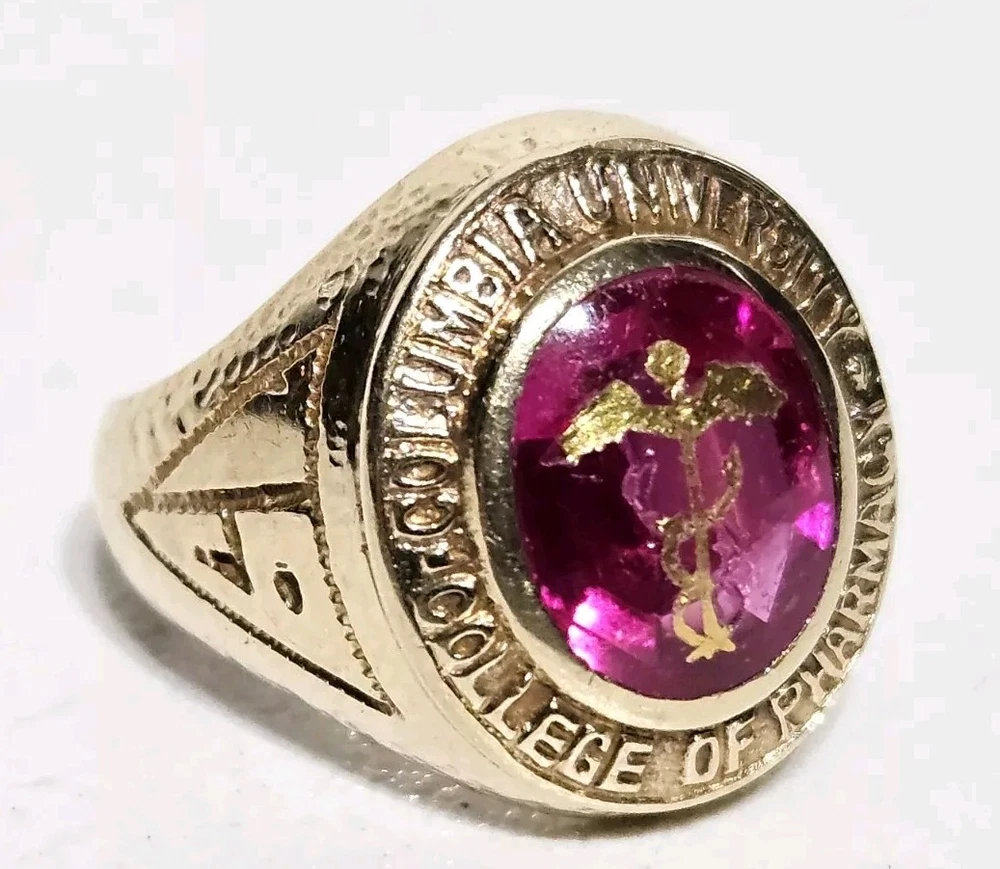 Up for sale is an Antique 14K Yellow Gold 1933 Columbia University College Of Pharmacy 3 Carat Ruby With Caduceus Class Ring. Approximately a size 5.5. Total weight is 8.7 Grams. Ruby measures 8mm Wide X 10mm High (Approximately 3 carats). Ruby is reverse faceted with smooth top. Ring is in good condition with light wear. Gold leaf is worn in 2 areas on ruby and ruby has a few small scratches (last pictures). Please feel free to ask questions. Thank you. From a smoke and pet free environment E-239