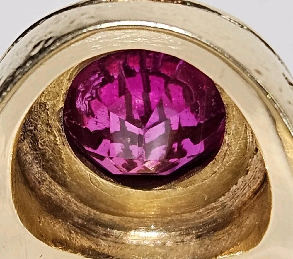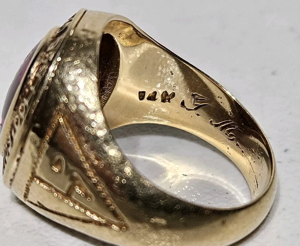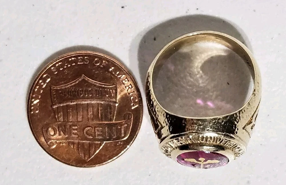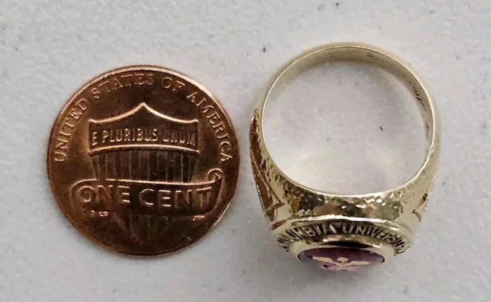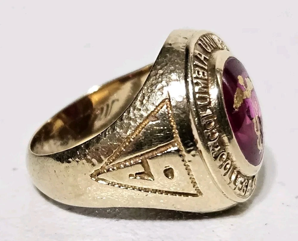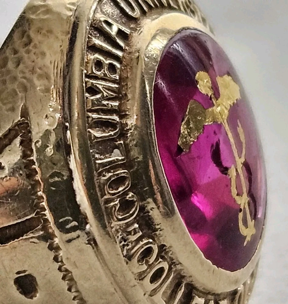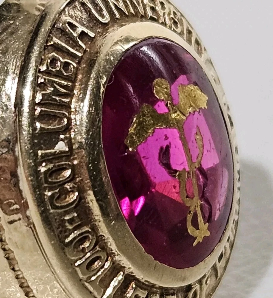 Up for sale is an Antique 14K Yellow Gold 1933 Columbia University College Of Pharmacy 3 Carat Ruby With Caduceus Class Ring. Approximately a size 5.5. Total weight is 8.7 Grams. Ruby measures 8mm Wide X 10mm High (Approximately 3 carats). Ruby is reverse faceted with smooth top. Ring is in good condition with light wear. Gold leaf is worn in 2 areas on ruby and ruby has a few small scratches (last pictures). Please feel free to ask questions. Thank you. From a smoke and pet free environment E-239