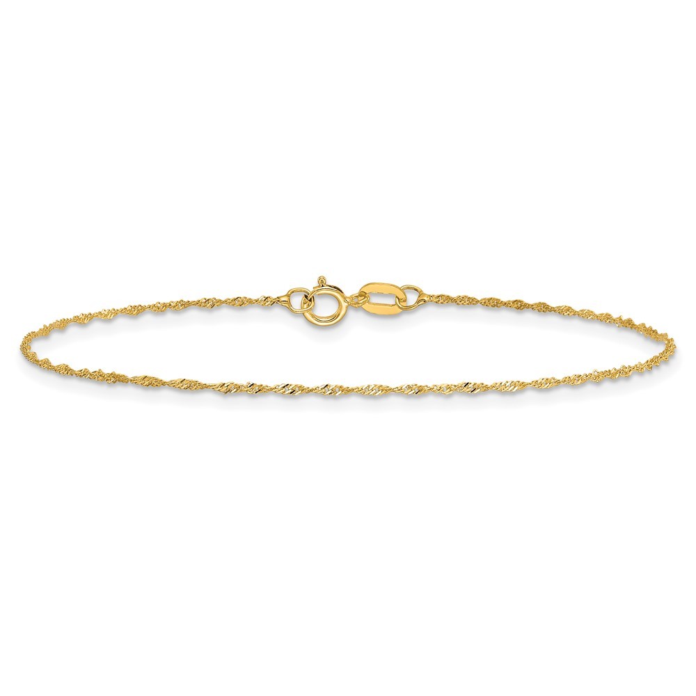 Features: Material: Primary - Purity:14K Finish:Polished Length of Item:9 in Chain Length:9 in Chain Type:Singapore Chain Width:1 mm Clasp /Connector:Spring Ring Feature:Solid Manufacturing Process:Casted Material: Primary:Gold Width of Item:1 mm Material: Primary - Color:Yellow Manufacturing Process 2:Machine Made All weights and measurements are approximate and may vary slightly from the listed information. Welcome to diamond_6720 Payments We accept all Ebay approved payment. Please sent the payment to us within 8 days after the auction has ended, or you will have unpaid case auto open by eBay. Shipping Policy We will ship all items within 1 business days of purchase during the work week (M-F) excluding holidays. If you order on Friday, your order will be shipped the following business day. Tracking will be provided when it becomes available. We will only ship to a PayPal Verified Address. Please make sure your address is current and correct. If the information does not match, your order may be canceled. Buyers are responsible for all customs, duties and taxes for your respective countries. Delivery times for International Shipping will vary. California Buyers Pay 9.0% Tax on all orders. case auto open by eBay. Return Policy & Exchange Returns or Exchange are accepted. Buyer must contact us within 30 days after the item is received. Item must be returned in unworn and resalable condition. We will only issue a refund for the purchase price, excluding any shipping fees. If we are at fault, we will provide a full refund. Buyer is responsible for all return shipping costs. BUYERS FEEDBACK If you have any concerns regarding your purchase, please contact us via eBay Message, we assure you that a satisfactory resolution will be reached. Your feedback is very important to us Do remember to give us 5 star rating(*****) if you are satisfied with our product & service .