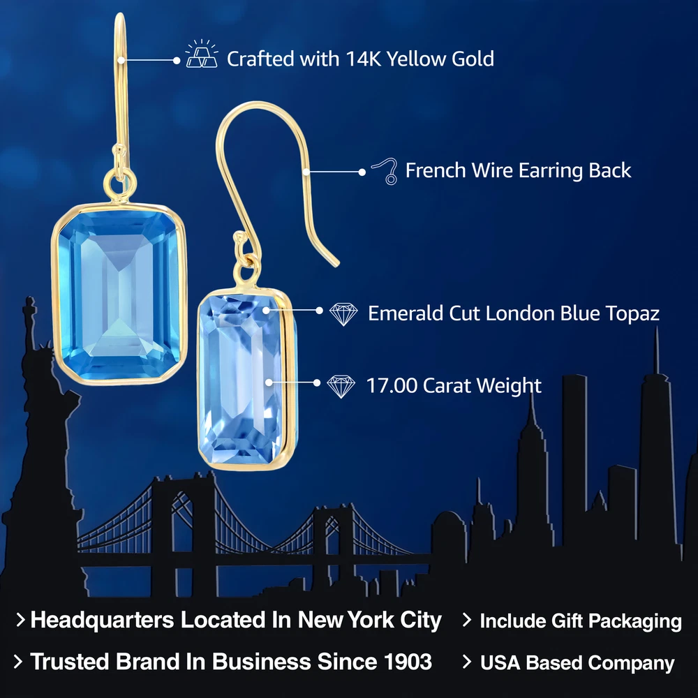 eBay Listing 14K Yellow Gold London Blue Topaz Dangle French Wire Earrings For Women (17.00 Cttw, Emerald Cut, Gemstone Birthstone) About This Item Exquisite gemstone design: These dangle earrings showcase stunning London Blue Topaz gemstones in a deep and captivating hue, with a remarkable total carat weight of 17.00 cttw. The emerald cut adds a touch of elegance and sophistication to the design. Birthstone significance: London Blue Topaz is associated with December birthstone symbolism, making these earrings a meaningful gift for those born in December or anyone who appreciates the rich blue color and symbolism of this gemstone. Elegant French wire design: The French wire style of these earrings adds a graceful and delicate touch, allowing the gemstones to sway gently and catch the light with every movement, enhancing the overall allure of the earrings. Product Description We are proud to have an unconditional, 'no hassle-no questions asked' 60-day money back guarantee. All our items come with a 100% guarantee. Should you not be satisfied with your merchandise for any reason, you may return it within 60 days after receipt and receive a refund. We offer 100% satisfaction guaranteed on all our sales. We pride ourselves in carrying high quality items and we hope that you will be pleased with your order. We want you to be 100% happy with the products you receive! If you are not satisfied with your purchase contact us anytime between the hours of 9:30 a.m. to 6 p.m. EST, Monday through Friday, within 60 days of receiving your order for a return authorization number.