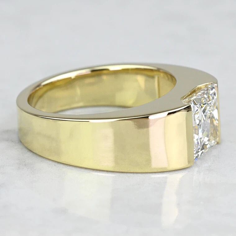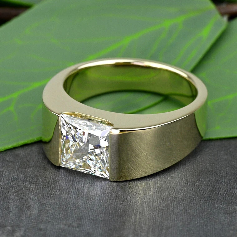 WELCOME TO HARRY GEMSTONES Elevate your style with this exquisite 14K Yellow Gold Plated Princess Cut D/VVS1 Moissanite Half Bezel Set Men's Ring. Crafted to perfection, this ring features a stunning white princess cut moissanite stone, measuring 8mm in length and width, showcasing excellent cut grade and VVS1 clarity grade. The half bezel setting style adds a touch of sophistication and elegance to this band, making it an ideal choice for engagement and wedding occasions. This band is made of high-quality 925 sterling silver, and it is completely plated with yellow gold, providing a luxurious look and feel. The ring size is 7, and it is customizable as per your preferences. The band is also available in a rectangle shape, adding more variety to your jewelry collection. Get this IGLA certified ring for a fair price, and enjoy the timeless beauty it brings to your everyday look.