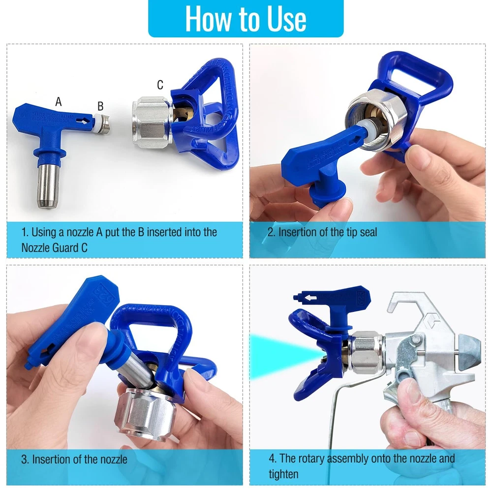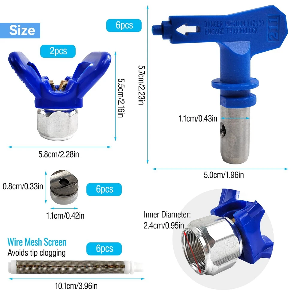 14Pcs Reversible Spray Paint Nozzle Tips, Airless Paint Sprayer Guns, with Spray Gun Filters and Protective Seat, Spray Paint Machine Parts, for House, Car, Hull Painting (211, 315, 417, 515, 517, 623 Practical: Our reversible spray paint nozzle set can be sprayed stably, the coating is uniform and delicate, which can effectively reduce the loss. It is a must-have painting accessory for painters and decorators. Model: Our airless paint sprayer has 6 models: 211, 315, 417, 515, 517, 623. The spraying angle is 20° - 60°, the range of spray width of paint sprayer gun can be seen in the picture. Material: Our airless paint spray gun tip set is made of high -hardness tungsten steel. It is strong and durable, not easy to wear, and has a long service life. High precision, spray stable. Easy to use and clean: Upgrade airless paint spray nozzle can be installed quickly in a short time without using tools. After use, you only need to rotate the nozzle to clean it, which is convenient and fast. Applicable scenario: We provide you with 6 spray paint nozzles, 2 protective seats, and 6 filters. It can be used for house renovation, hull painting, car painting and other scenarios to meet your daily painting needs.