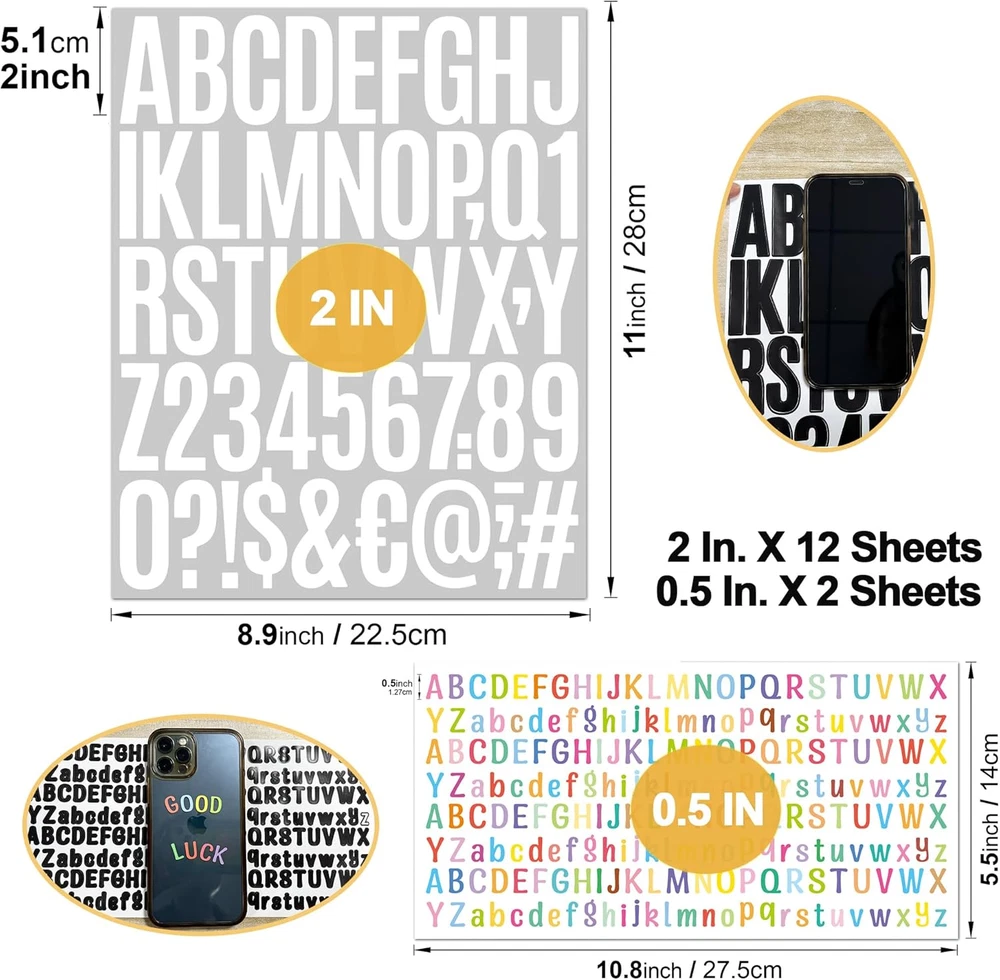 Store New Arrivals Add to Favorite View Feedback Contact 14-Sheet Vinyl ABC Number Letter Stickers 1040 PCS, 2 Inch Mailbox Numbers White Deco Stickers Bulletin Board Letters for Football Poster Board Wall Decor Doors Signs Logo(White,2 In,0.5 In) Description Reusability Single Use Item model number 2IN-STICKER-12PCS Item dimensions L x W x H 11 x 8.9 x 1 inches Item Form Sheet Finish Type Polished Number of Items 1040 Color White Pattern Letter Print Country of Origin China Shape Square Unit Count 14.0 Count Item Weight 4.6 ounces Theme Alphabet Surface Recommendation Plastic Material Vinyl Age Range (Description) Adult Recommended Uses For Product Wall Special Feature Weatherproof Product Dimensions 11 x 8.9 x 1 inches Cartoon Character letter stickers Number of Pieces 1040 14 sheets 1040 PCS vinyl alphabet stickers in total:12 Sheets 624 PCS 2 inches alphabet/number stickers,and 2 sheets 416 pcs small vinyl letter stickers in 0.5 inch,including uppercase/lowercase letters A-Z, numbers 0-9 and assorted symbols Two size of letter stickers(2 Inches/0.5 inch),large quantity in different colors/sizes,will fully meet your different decorating needs,you can match them any way you like Self-adhesive & weather-proof strong vinyl material,can be peeled off easily and no residues,sun-resistant and colors are not easy to fade,won't break when peeling off,looks nice and touch smoothly,durable for long-term use The stick on letters and numbers are perfect for outdoor/business use, such as for mailbox numbers,bulletin board letters,deco stickers,football stickers,poster board letters,crafts,wall decor,poster,doors,signs,stanlzey logo,trucks,etc The sticker letters are also suitable for household use for letter stickers for water bottles,deco stickers,eater bottles,happy mothers day decorations stickers,names,bikes,decal,notebook,scrapbook,house number,etc Product Description 2 Inches Self Adhesive Stick On Letters Large Size Vinyl Letter Stickers Sticker Color: White/Black/Colorful/Morandi/Mix-Colors (five options) Qty: 12 Sheets for 2inches, 2 Sheets for 0.5inch Contents: Capital letter(A-Z) /Number(0-9)/ Monetary Symbols & Punctuation Package includes: 624 pcs x 2 inches vinyl stickers (12 Sheets) ; 416 pcs x 0.5 inch. vinyl stickers ( 2 Sheets) Large Size Stickers More Conspicuous 2 inch. in height.Easier to stick and more conspicuous.,including 12 sheets of 2 inches Letter/Number/Punctuation Stickers Waterproof & Weatherproof Vinyl Material Waterproof,Weatherproof, UV resistant.Touch smoothly not easy to fade,durable for long-term use. Self-Adhesive and won't break Easy to peel and stick, peeling off easily leaving without trace and won't break. ABOUT US We offer the best prices around on high quality products. Our E-store includes media such as books, movies, music and games while offering electronics, toys, sporting apparel, clothing, tools, general home, garden items and more. SHIPPING We are always working hard to ensure your package arrives as soon as possible. Please understand that some factors like weather, high postal traffic, and the performance of shipping companies are outside of our control. We offer free shipping to the lower 48 states and ship within 2 business days of payment, usually sooner. We do not accept P.O. Boxes. Please provide a physical address. RETURNS We offer a 30-Day Return Policy on items which you are not completely satisfied with. You have the option for a full-refund or an exchange of the item. No returns are available on items shipped outside of the USA. PAYMENT We accept PayPal. CONTACT US This page content is yet to come Please ad us to your favorite seller and visit again later Thank You CUSTOMER SATISFACTION We try our very best to make sure every customer is completely satisfied. If there's a problem, message us! We're happy to help.