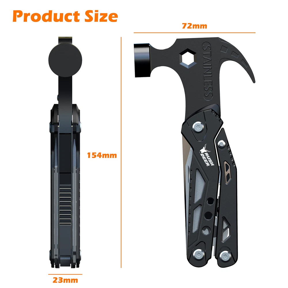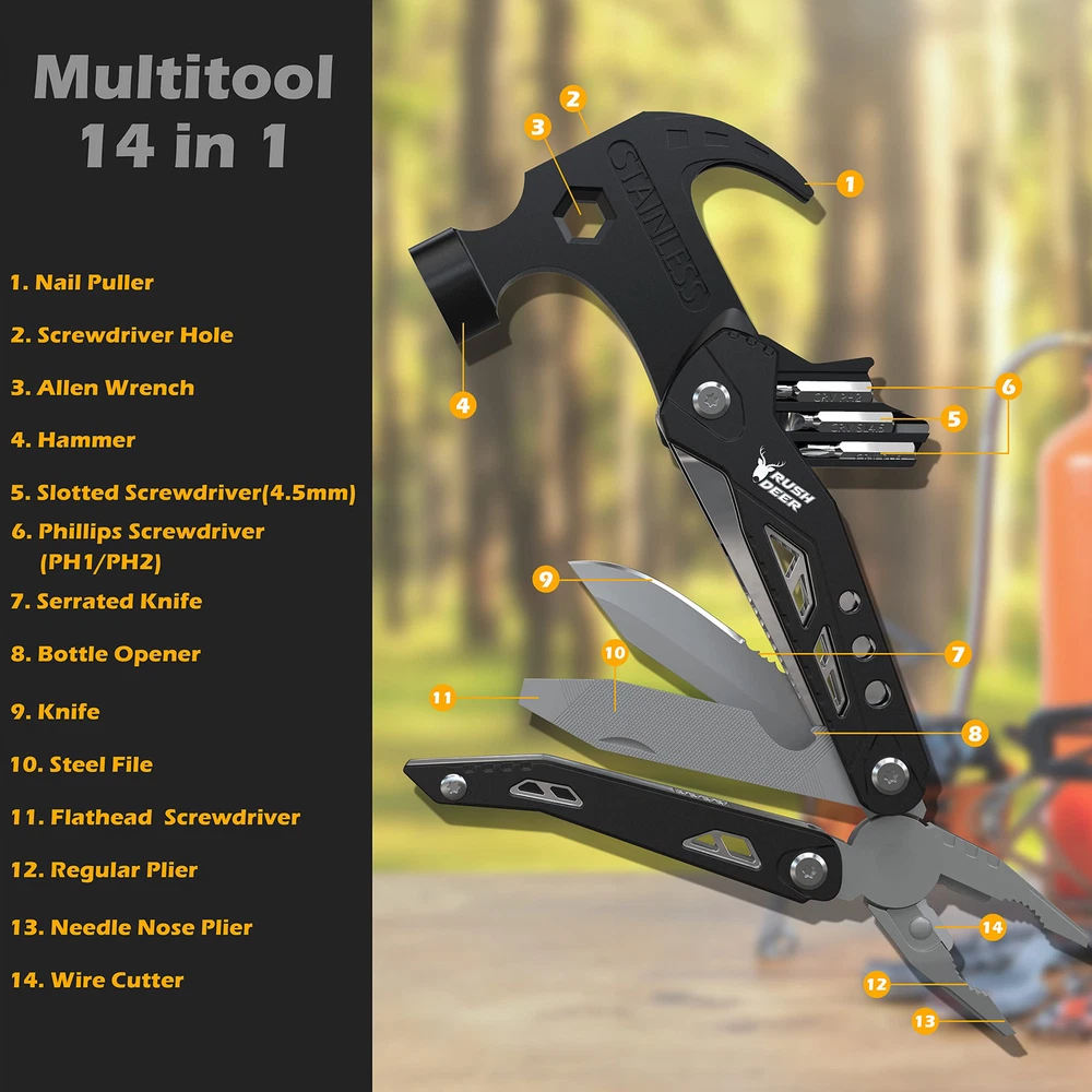 【14-in-1 Multi tool】:The 14 in 1 mini hammer multitool includes heavy duty mini claw hammer, allen wrench, needle nose pliers, phillips screwdriver, wire cutter, serrated knife, screwdriver hole, slotted screwdriver, nail puller, steel file, bottle opener, knife, regular pliers, slotted screwdriver. 【Upgraded Survival Gear and Supplies】: The hammer multi tool survival gear tool kit with a seatbelt cutter and min hammer, is a utility tool for keeping in the car to deal with any emergencies. Strong enough to shatter the glass curtain wall, cut the rope curtain in a dangerous escape. A necessity for every family. 【Camping Essential Accessories 】: This multitools camping gear kit fits camping, home daily-use, hiking, exploring, adventure, fishing, work, hunting etc. Comes with a waist clip bag, the multitool is made of stainless steel, durable and rust-resistant. It can be folded into a handle shape, easy to grip, and is an ideal tool for everyday carry. 【Christmas Gifts for Men and Women Who Have Everything】: Have you ever seen more versatile and unusual gift ideas? This is a gift for dads who have everything, suitable for men, husbands, sons, and boyfriends for birthdays, Christmas, Father's Day, anniversaries, or Valentine's Day. 【Satisfactory Service】: Quality and Customer Satisfaction are our top priorities. If the camping accessories hammer multi tool doesn’t live up your expectations, please feel free to contact us and we will do our best to ensure your happy purchase experience.
