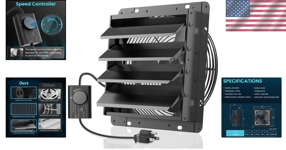 This exhaust fan is a game-changer! The sturdy steel mesh and sleek black design look great while delivering powerful airflow—up to 882 CFM! The speed control lets me adjust ventilation easily, and the thicker build feels super durable. Perfect for garages, workshops, or any space needing fresh air. Installation was straightforward, and it runs quietly for its size. Definitely worth it for the performance and quality!
