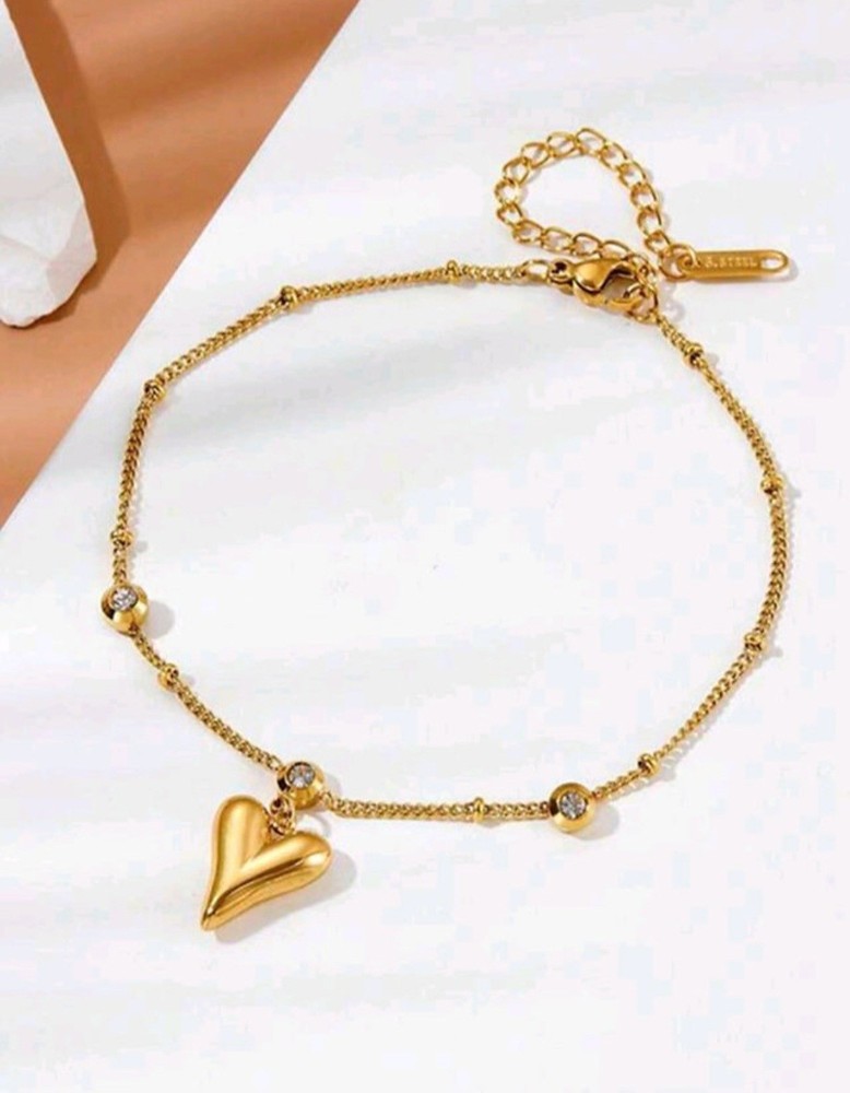Add a romantic shimmer to your step with this 14K Gold Plated Heart Anklet, designed to express love and elegance with every movement. Featuring a sleek gold chain adorned with tiny bezel-set cubic zirconia stones and a dangling polished heart charm, this anklet is a dainty yet eye-catching piece perfect for summer, date nights, or daily wear. Made with a durable stainless steel base and finished in rich 14K gold plating, this anklet is non-tarnish, waterproof, and hypoallergenic, ensuring long-lasting shine and comfort even in warm weather. The adjustable clasp allows for a custom fit, making it a lovely and thoughtful gift for women of all ages. Whether you're shopping for a birthday, anniversary, or just because, this heart anklet makes a meaningful and stylish addition to any jewelry collection.