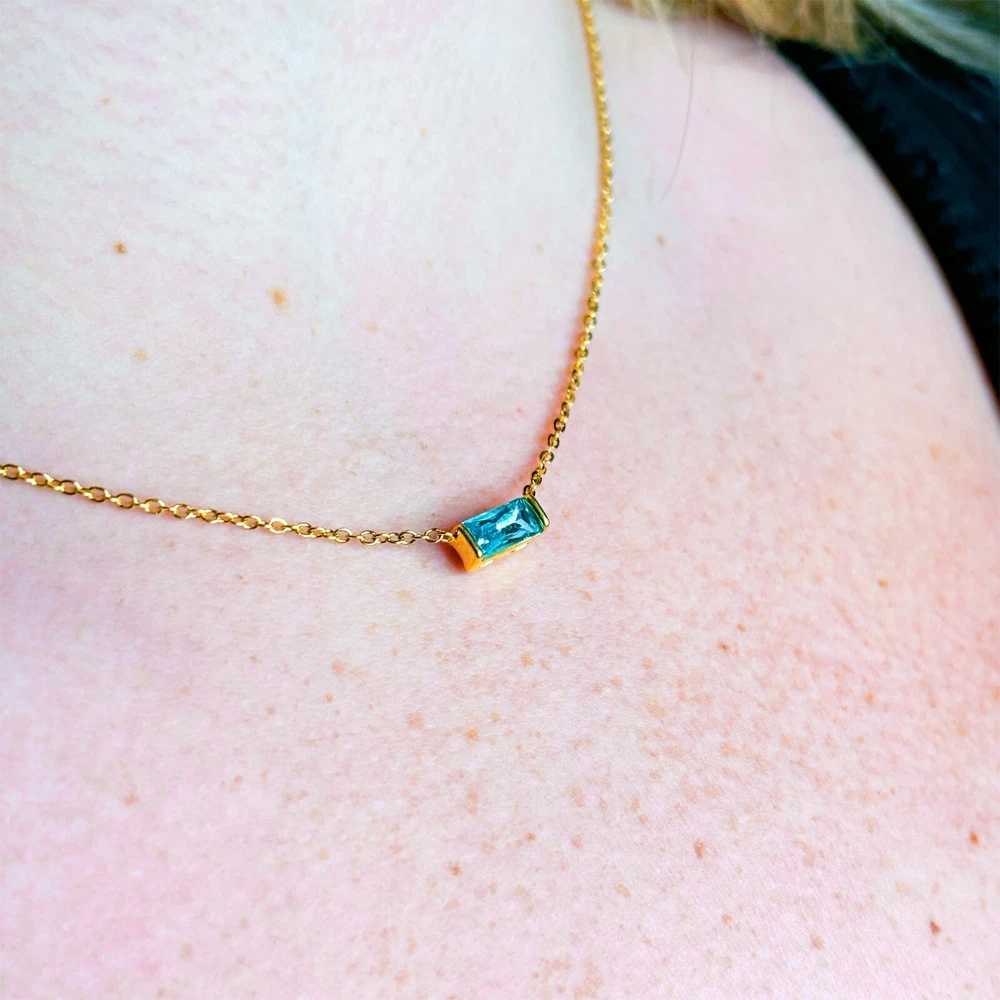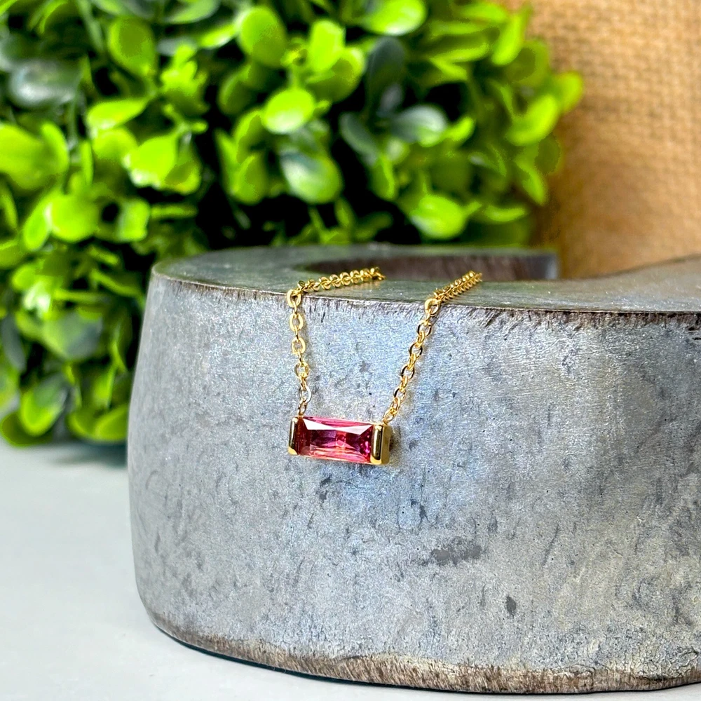 Elegant 14k Gold Ruby Necklace featuring a rectangle-cut gemstone. FAST & FREE SHIPPING! Features: ✨ Gemstone: Genuine rectangle-cut Ruby Crystal (~6x4mm), symbolizing love, passion, and strength. ✨ Material: 14k gold-plated chain and setting for a radiant, durable shine. ✨ Chain Length: Adjustable from 16 to 18 inches for a perfect fit. ✨ Design: Minimalist and lightweight, perfect for everyday wear or elevating any outfit. Available Gemstones While this listing highlights Ruby, explore other gorgeous birthstones to suit your needs: January: Garnet (Love & Vitality) February: Amethyst (Peace & Intuition) March: Aquamarine (Tranquility & Courage) April: Clear Crystal (Clarity & Strength) May: Emerald (Abundance & Growth) June: Alexandrite (Balance & Joy) August: Peridot (Prosperity & Healing) September: Sapphire (Wisdom & Royalty) October: Pink Tourmaline (Compassion & Healing) November: Yellow Topaz (Confidence & Energy) December: Blue Zircon (Hope & Purity) Perfect for Gifting: This birthstone jewelry makes an ideal gift for any occasion: Mother’s Day: A heartfelt gift for mom. Birthdays: Celebrate with a meaningful gemstone. Valentines or Holidays: A dainty yet thoughtful present. Anniversaries: Symbolize love with this elegant keepsake. Why You’ll Love It: Versatile Style: Pair it with formal or casual outfits for everyday elegance. Lightweight & Comfortable: Designed for all-day wear without compromising on style. Care Instructions: To maintain its brilliance: Avoid prolonged exposure to water, perfumes, or harsh chemicals. Store in a dry, soft pouch or jewelry box when not in use. Please Note: Each necklace is crafted with care, and gemstone hues may vary slightly due to their natural origin, making your piece truly unique. Disclaimer: Gemstone properties are based on traditional beliefs and are not a substitute for medical advice. For personalized medical guidance, consult a professional. Add a touch of passion and meaning to your jewelry collection or gift someone special with this 14k Gold Ruby Necklace. Its timeless design and symbolic charm make it the perfect July Birthstone Gift for any occasion. Order now and enjoy FAST & FREE SHIPPING!