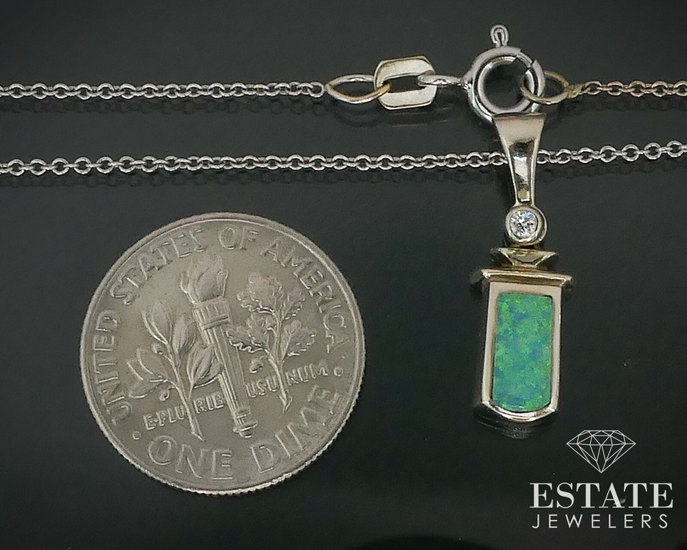14k White Gold Inlaid Opal & Diamond Ladies Necklace 3.1g 18"L i17758 Lovely white gold pendant with 7mm by 3.5mm inlaid lab opal and diamond accent. Attached to a 18"L EFFY chain attached. Stamped 14k 3/4"L pendant including bale. Shipping & Handling Policy Domestic shipping is free, with paid expedited shipping services available in the shipping options. Exceptions may exist for large items. Once your item is paid for, it will typically ship on the next business day. Sorry, we can not hold items once they are paid for, per eBay policy. U.S.A. Shipments Orders are shipped USPS Ground Advantage with tracking. Your package is fully insured for all U.S.A. shipments. International Shipments International shipments are handled through eBay's Global Shipping Program and are subject to their policies, prices and shipping times. Please note that eBay does not allow combined shipping on international orders through their Global Shipping Program. Return Policy We accept returns for any reason through the eBay returns service up to 14 days after receiving the item. Items must be returned in original condition they were sold in to qualify for a full refund. Refunds can take 1-3 business days to process. Appraisals All items are inspected and graded by our GIA Graduate Gemologist. Insurance appraisals are available upon request and may be subject to additional fees. Pleast contact us if you are interested in this service. Ring Resizing Please message us prior to payment for an estimate if you would like a ring resized so that we may send an updated invoice. Ring resizing is available (up or down two sizes) on most of our gold rings, for an additional charge. Also note, returns are still accepted after the ring has been sized in most cases, but the sizing fee is non-refundable. About Us We are open Monday - Friday 10-6, EST. With more than 30 years of experience in buying and selling estate, vintage and antique jewelry, you can feel confident that every piece of jewelry you buy from us will be of the highest quality. We have a full service brick-and-mortar store staffed with highly trained jeweler, and each piece is expertly examined prior to being listed. Our inventory is always changing, there is something new to find in our eBay shop every day. You can bid with confidence knowing that you are purchasing remarkable pieces at a remarkable price!