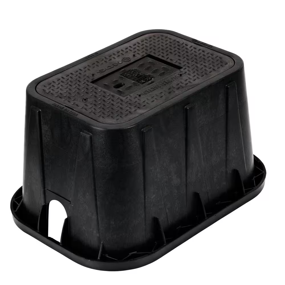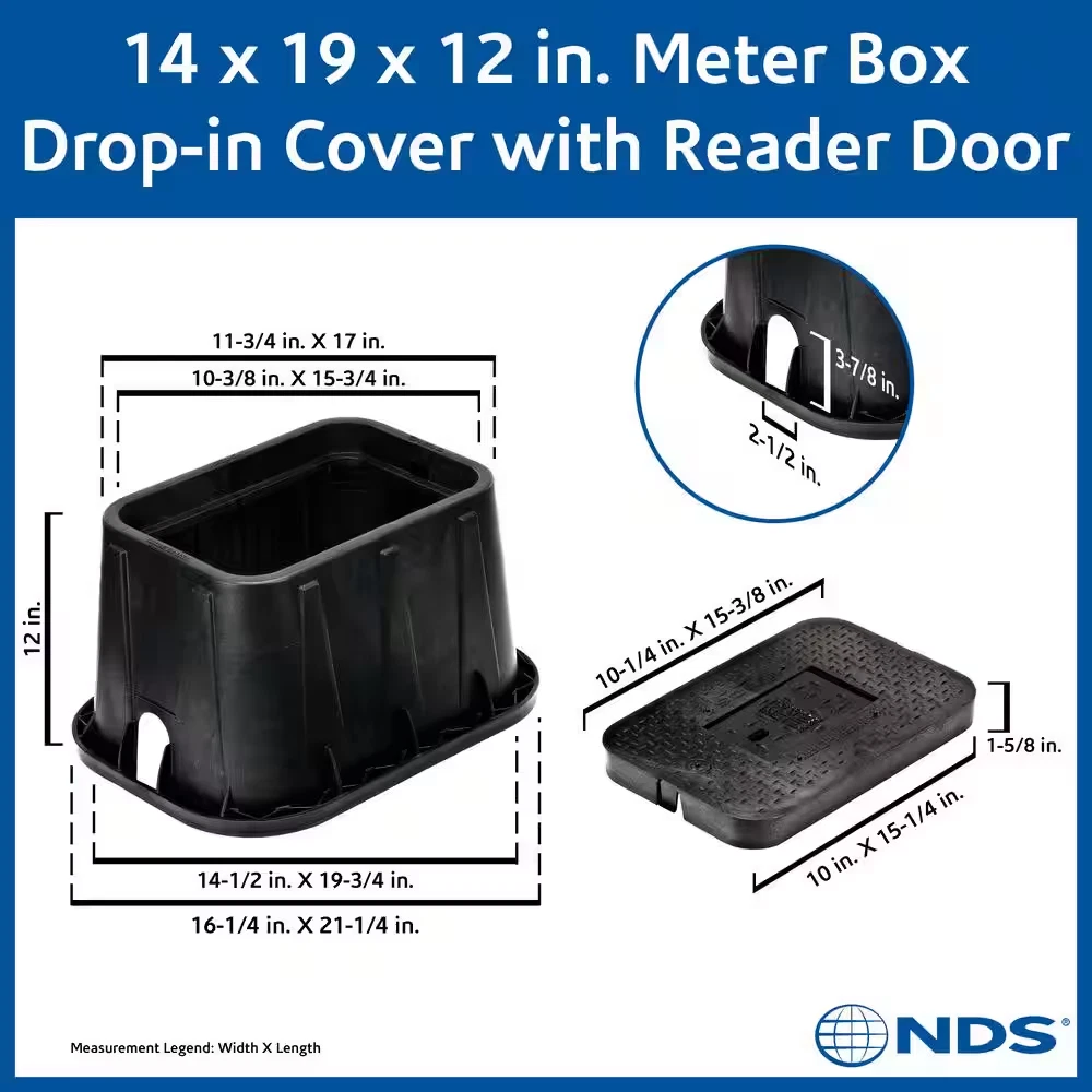 Protects irrigation components; keeps them out of sight Reinforcing ribs, pipe hole, drop-in cover, cast iron reader door Made of durable PP and HDPE treated with UV inhibitors Provide the ideal balance of protection and accessibility for your irrigation system components with the 14 in. X 19 in. X 12 in. Meter Box and Drop-in Cover. Built with structural reinforcing ribs, the meter box fits over valves, control zone kits, and other irrigation components to provide protection. Durable cover provides access for maintenance and reader cover allows for easy meter reading. The black box and black cover are built for durability to stand up to the elements, pedestrian traffic, lawn care equipment, and potential vandalism. Convenient slot makes drop-in lid easy to lift with a flathead screwdriver. The meter box is made of polypropylene (PP) using 100% recycled materials; the lid is made of high-density polyethylene (HDPE) using 100% recycled materials. The reader door is made of cast iron. Both the irrigation meter box and lid are treated with UV inhibitors to prevent fading and cracking from sun exposure. NDS is a leading manufacturer of water management solutions and the trusted brand of professional landscape contractors since 1972. NDS products are available at major home centers, retailers, and online. Check out the NDS website or reach out to us for technical support-our friendly, experienced team is here to help make your project a success