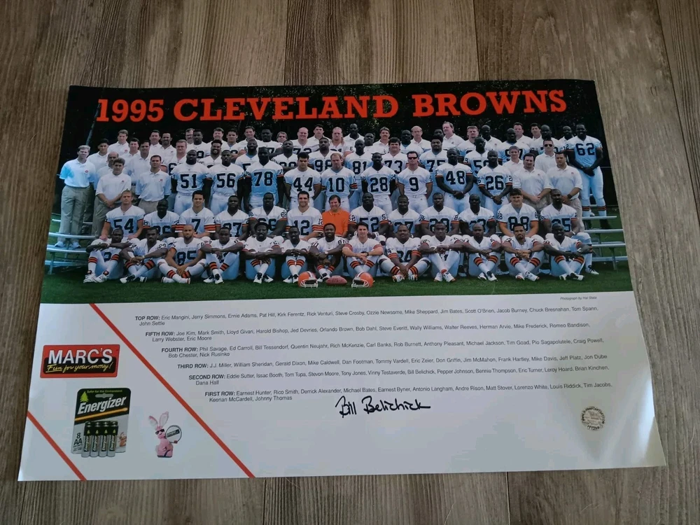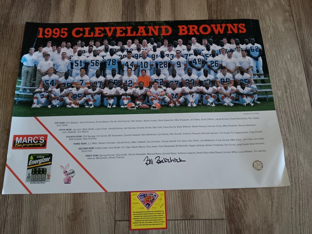 This is a rare and valuable 14x20 inch photo of the 1995 Cleveland Browns team signed by Bill Belichick. The photo is an original and comes with an SSC Certificate of Authenticity. It is a must-have for any football fan or collector of sports memorabilia. The photo depicts the team during the season and is a great addition to any collection. The signed photo is a unique piece that will surely impress any fan of the Cleveland Browns or Bill Belichick. Has 1 bent corner and some shelf wear.