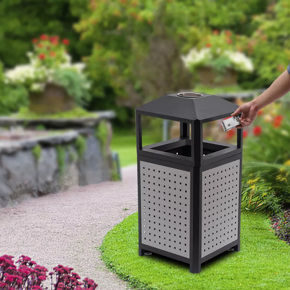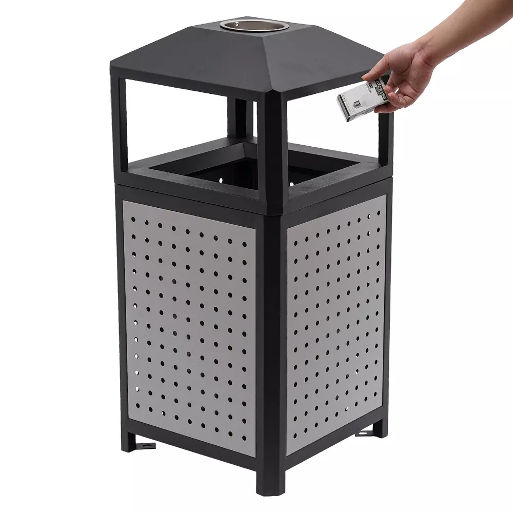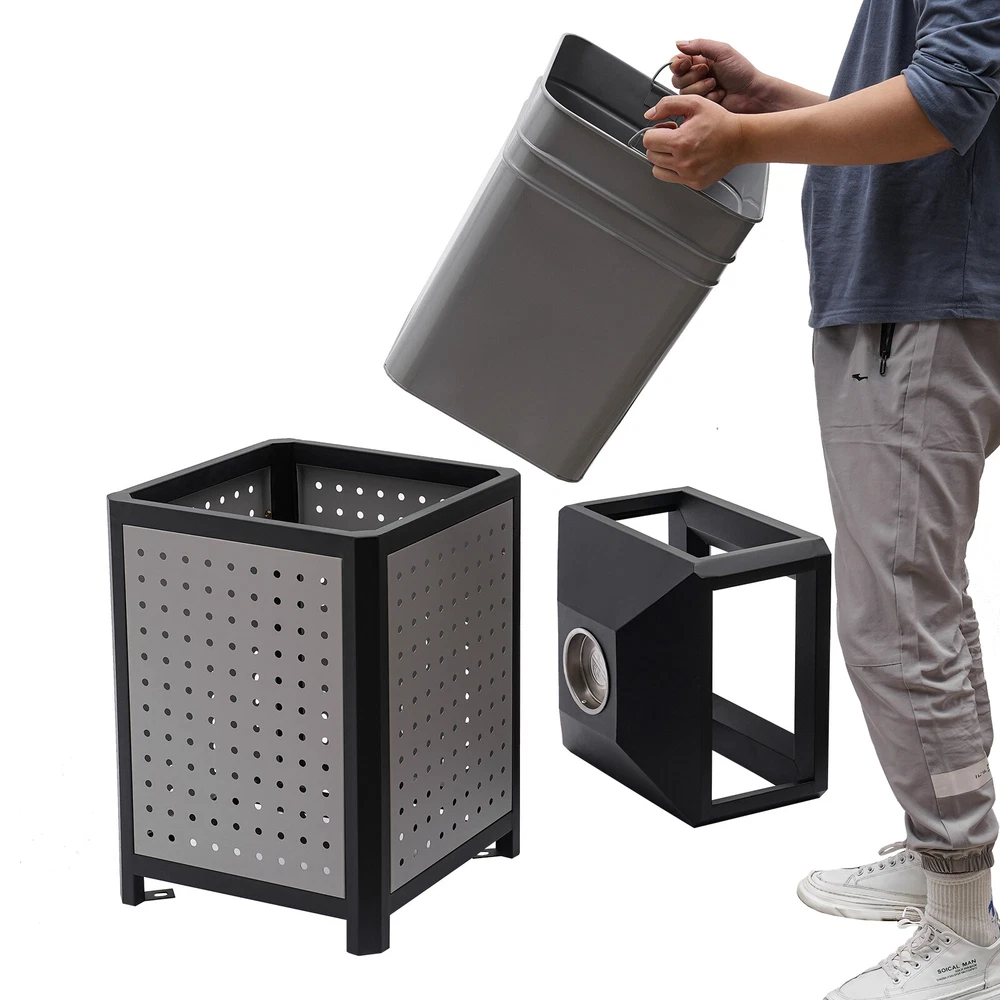 15 Gal Commercial Waste Container Outdoor Trash Can Garbage Enclosure Gray NEW Description The industrial waste container is made of high-quality galvanized sheet material with a smooth, rust-resistant surface for long-lasting durability. Its 15-gallon large capacity design can store more garbage, effectively reducing the pollution of garbage, and is more convenient for garbage cleaning and management. Its modern style and generous appearance design make it blend into the surrounding environment, which is not only practical but also beautiful. It is an indispensable item in modern life and an excellent waste disposal solution for you! Key Features Premium Material: It is made of galvanized board and stainless steel featuring high hardness, high strength, and resistance to rust, corrosion, and heat. Besides, its high-temperature plastic spray and bake paint processes provide extra protection to its surface, greatly extending its service life. Exquisite Appearance: Its modern style appearance will show you the beauty of simplicity and neatness, making it also a good view on the street or in your backyard garden. Large Capacity: Its 15-gallon capacity can hold more trash and greatly reduces the number of times you have to clean out your trash, which helps you save time and be more productive. Easy to Install: Its most parts are well assembled, you just need to put the inner barrel in and install the lid and fix it on the ground with four expansion bolts, which will not cost you much time. Ventilate Design: The great number of ventilated holes and grid-style bottom provide it with a wonderful ventilation condition to dispel the odor generated by garbage and reduce bacterial growth. Convenient to Use: Its four-sided wide-opened mouth(10.5*6.5 inches) can swallow your garbage from each side you throw, which is very convenient. Easy to Clean: Its smooth surface, detachable lid and inner barrel make the clean work easy and labor-saving with water flushing or wiping it with a damp cloth. Customer Service: We aim to provide quality products and services. If you have any problems, please feel free to contact us. We will reply and solve the problem for you as soon as possible. Details Build-in Ashtray: The stainless steel ashtray is on the top of the lid and is strong, durable, and fireproof. It well meets the needs of the smoking crowd and also reduces the occurrence of fire accidents. Top Cover: It helps to protect against rain and snow, thus preventing odors from being aggravated by wet garbage and reducing sweeping pressure. Inner Barrel with Handle: With two handle rings, you can easily lift it out for cleaning or dumping garbage. Elevated Base: It separates the inner barrel from floors, pests, and dust and reduces the abrasion that can occur when in contact with hard surfaces. Application It can be used in conference rooms, banquet halls, restaurants, hotel lobbies, outdoor patios, cafes, recreation and picnic areas, corporate and college campuses, boardwalks, tourist attractions, and other high-traffic outdoor and indoor locations. Specifications Color: Grey Material: Galvanized Board, Stainless Steel Surface Treatment: High-Temperature Plastics Spray, Bake Paint Recommended Uses For Product: Outdoor Shape: Square Mount Type: Screw Mounted Assembly Required: Yes Capacity: 56.78L/15gal Product Size(W*H): 40.64*84.46cm/16*33.25inch Side Opening Size: 26.67*16.51cm/10.5*6.5inch Packaging Size: 86*41*41.5cm/33.86*16.14*16.34inch Gross Weight: 12kg/26.46lbs Net Weight: 11kg/24.25lbs Package Included 1* Industrial Waste Container 4* Expansion Bolts Notes 1.Please check the size carefully before ordering. 2.It is normal that the expansion screw will blow up after the force is applied. 3.Please allow the slight color difference caused by the shooting light and 1-3cm error due to manual measurement, and make sure you do not mind before you order.