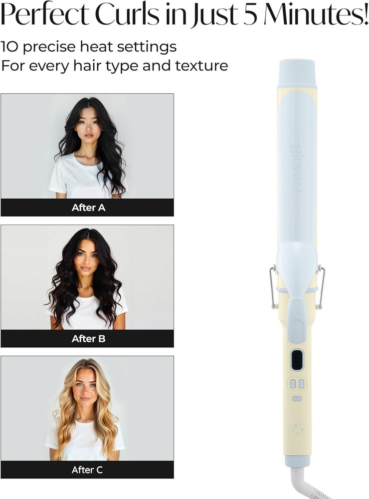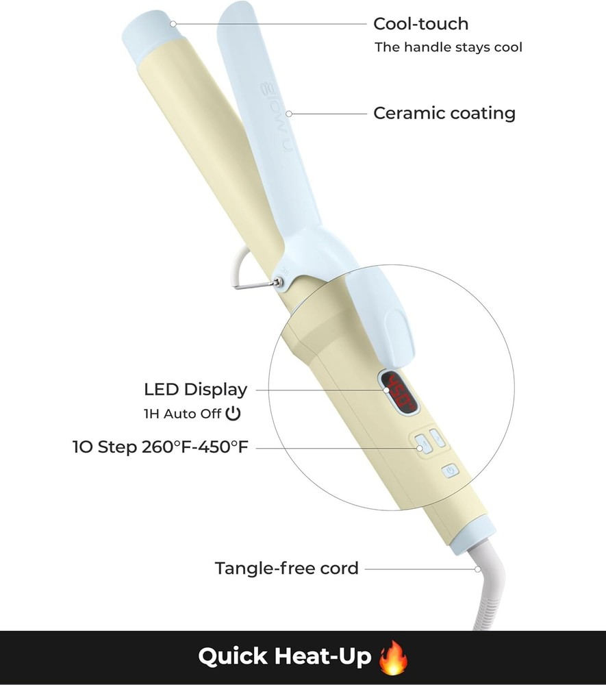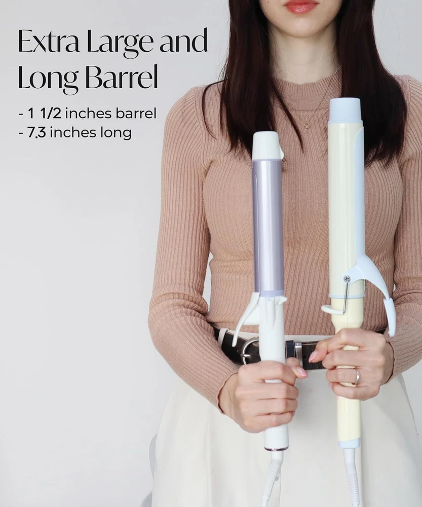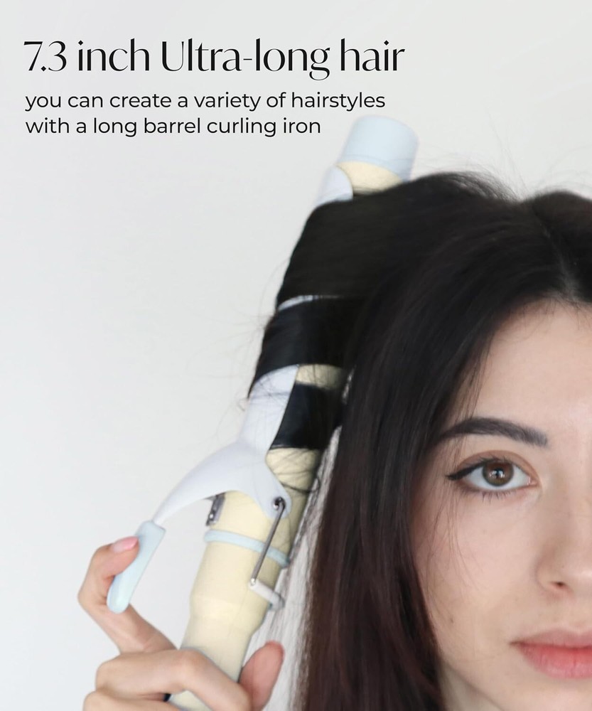 1 1/2 inch Extra Long Curling Iron - 10 Temperature Modes Fast and Easy Styling - 7.3" Ceramic Barrel Hair Wand for All Hair Types Blowout, Beach Waves, Bouncy Curls - Marshmallow About this item Long Barrel for Fast Styling - Achieve gorgeous bouncy curls with ease. The 1.5 inch barrel and 7.3 inch extra-long length (excluding the cool tip) are perfect for thick, long hair, saving you time while styling. LED Temperature Display - No more guesswork! Monitor the temperature at a glance. Ensuring every style is perfectly suited to your needs. Achive consistent styling every day. Versatile and Protective - Choose from 10 adjustable heat levels(260°F to 450°F) for precise control, making this curling iron suitable for all hair types. The ceramic coated barrel ensures smooth, healthy curls with minimal heat damage. Lovely, Elegant, Long-Lasting Curls - Enjoy beautiful curls that last up to 24 hours, no matter the occasion. The elegant and lovely design adds a touch of luxury to your beauty routine. Tangle-Free & Voltage-Free - Enjoy hassle-free styling with the 360 degree swivel cord(8.2ft/2.5m). The universal voltage(AC 100~240V, 50/60Hz) makes you take this curling iron with you on your travels. Smart Auto Shut-Off for Safety - For peace of mind, the device automatically shuts off after 60 minutes of inactivity, ensuring energy efficiency and safety.