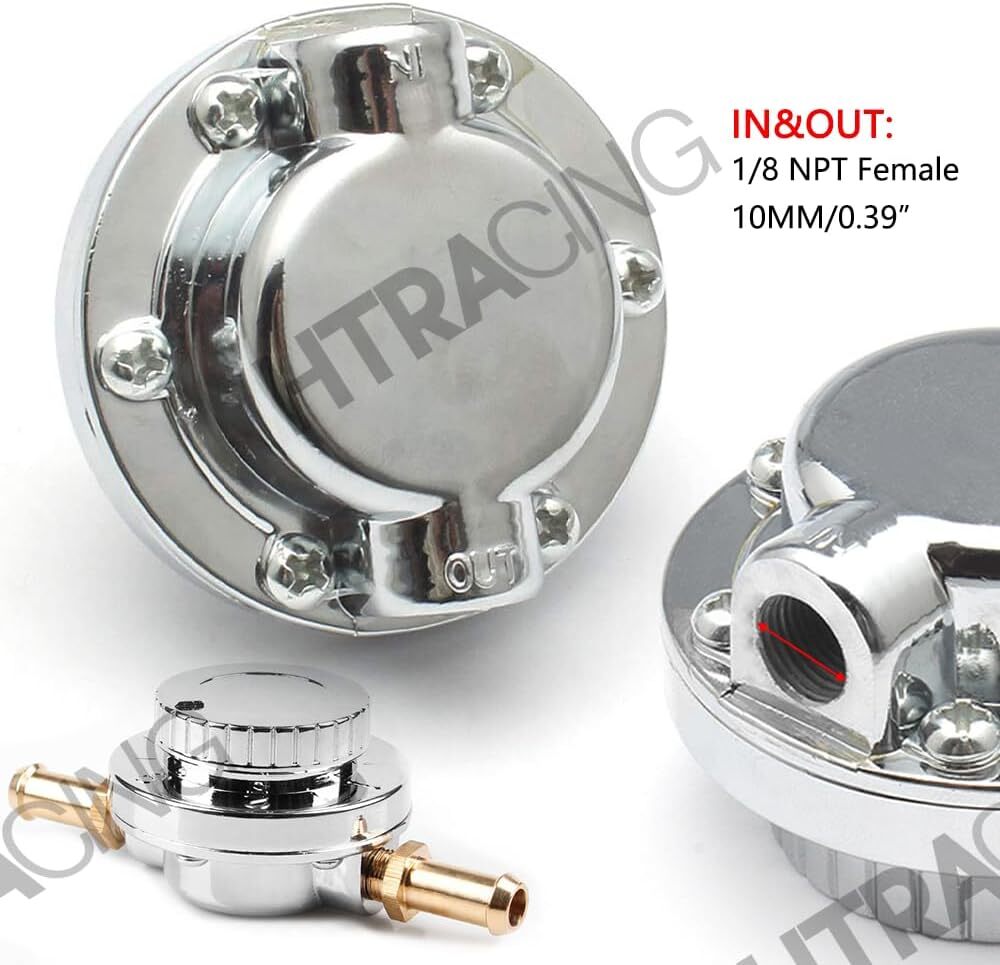 1-5 PSI Fuel Pressure Regulator with Gauge Adjustable Manual Universal for Carburetor Carb Zinc Alloy FPR with 8MM 10MM (5/16" 3/8") Hose Fittings Item Description 【Function】Ideal for fuel pumps to detect and control the fuel pressure to carburetor. 【Material】High-quality chrome-plated zinc alloy construction for the fuel pressure regulator makes it durable and long-lasting. Glycerin-filled stainless steel gauge provides shock absorption, enhancing data accuracy. 【Manually adjustable】the range of 1 to 5 psi can be adjusted via the dial on the top. (The input pressure should not exceed 7psi.) 【Application】 Used for single or twin carburetor application. (NOT suitable for fuel injection systems, NOT for ethanol or fuels containing lead) 【Accessories】 Including 0-15 psi fuel pressure gauge with adapters, 8mm, 10mm (5/16", 3/8") push-on fuel hoses with brass fittings, and clamps . › See more product details Application: Used for single or twin carburetor application. (NOT suitable for fuel injection systems, NOT for ethanol or fuels containing lead) Material: chrome-plated zinc alloy, steel, brass, rubber Payment We accept payment only through PAYPAL Shipping We ship products worldwide through standard express courier service, it will reach within 7 to 10 days to abroad buyers, we ship the product after recieved clear payment and give full information about shipment to the buyer Return We accept product return within 7 to 21 days from delivery date but product should be in original position and not in damaged condition,the return shipping charges will be buyer responsibility