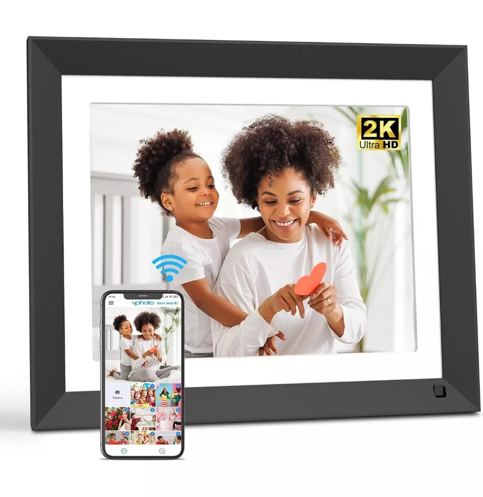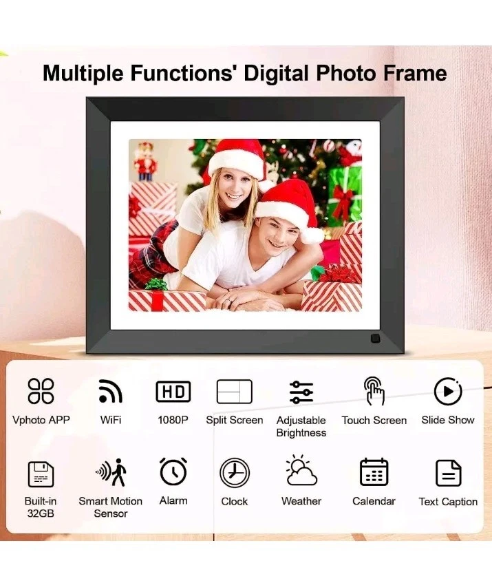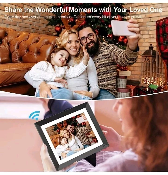 This is a Moman 10.1" WiFi digital picture frame in black, featuring a touch screen HD IPS display with a 16:10 aspect ratio. It has 32GB of internal memory capacity and supports media formats like MPEG 4 and JPEG. The digital photo frame is ideal for displaying photos and videos wirelessly through Wi-Fi, making it a great Christmas gift for loved ones.