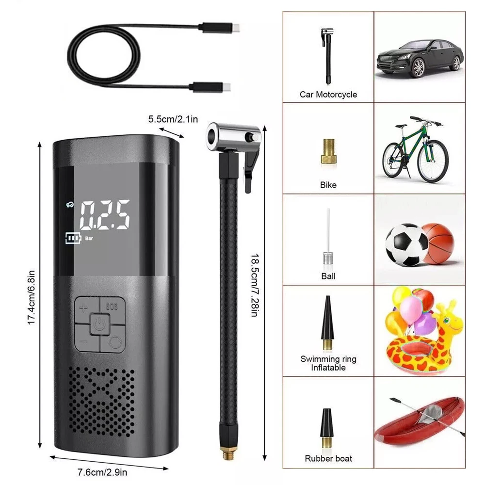 Description Features. 150PSI Smart Air Pump: This practical electric air pump mini inflator has a 150PSI maximum inflation pressure. Plug it into the 12V power outlet in your car and attach the stem to the tire valve. One simple press on the car air compressor and it will do all the work for you. 4 Inflation Modes & Power Prompt: The LCD digital display panel will display 4 kinds of air pressure units "PSI", "BAR", "KPA", "Kg/m²". The digital display panel will have icons such as motorcycles, cars, and balls for selection. The corresponding safety air pressure has been set by default for the type of product. Multipurpose Nozzles: Comes with four different aeration nozzles that can be replaced to charge bicycles, motorcycles, automobiles, air cushions, basketballs, and other products, simple and very convenient. The wired air pump is connected to the power supply through the attached car power cord. LED Lighting For Night Time: Power tire compressor has 3 LED lighting modes (Ordinary White light & Slow frequency warning light& Hazard warning light) for you to use as an outdoor lighting source. It is a helpful companion for emergency or daily use. Easy to operate: After connecting the tire valve, the current tire pressure is displayed, and the tire pressure can be monitored at any time. When the inflation reaches the preset value, the air pump will automatically stop inflation to avoid over-inflation. Portable & Easy To Carry: Portable tire pump comes with a carrying bag and a well-made mini electric tire inflator is designed to be easily stored in your car. Multipurpose Nozzles: Comes with four different aeration nozzles that can be replaced to charge bicycles, motorcycles, automobiles, air cushions, basketballs, and other products, simple and very convenient. The wired air pump is connected to the power supply through the attached car power cord. Specifications. ▪️ Name: Electric handheld inflatable pump ▪️ Material: poly carbon (pc) ▪️ Color: black ▪️ Display: LCD display ▪️ Maximum working pressure 150 PSI ▪️ Product Size: 175*75*55mm ▪️ Cylinder: 19 single cylinder ▪️ Power: 120W ▪️ Rated voltage: 12V ▪️ Function: Inflatable pump, lighting, warning light, mobile power ▪️ Application: cars, bicycles, electric cars, motorcycles, balls, etc. Package includes. ▪️ 1 x Inflator ▪️ 1 x USB Cable ▪️ 1 x Inflator Tube ▪️ 4 x Inflator Adapter ▪️ 1 x Storage Bag Friendly Tips: 1.Due to the light and screen difference, the item's color maybe slightly different from the pictures. Please understand. 2.Please allow 1-2cm differences because of the manual measurement. Payment 1. We only accept payment through Payoneer. 2. Please make sure you have a valid account prior bidding. 3. Please pay for your item within 7 days after you order. Shipping 1. Buyer take responsibility in import / tax cost (not included in item price) 2. Pls contact with us to confirm extra cost if you need to upgrade the shipping option 3. If there's any concern about shipping, pls contact with us for further confirmation Return Policy 1. Refund or Replacement request is available within 30 days after parcel received and returning the item as the same condition as received. Please contact us to request a return authorization. Your name, auction number, and reason for return should be included in the message. 2. All items returned must contain all original packaging materials. Please repack the item carefully. Items returned will be tested and a new replacement will be shipping to buyer punctually. 3. In the event that a suitable replacement is not available then a refund will be issued. Shipping, handling and insurance fees are non-refundable. 4.If the item was found non-defective, the item will be sent back to buyer at buyer's expense. Items returned without authorization will be refused and returned to sender/buyer. 5. Buyer pay the shipping cost if the item damaged artificially, or buyer say "not like it", "size/color was different per they imaginary", etc. Contact us Please contact us via ebay message any time, all questions will be replied within 12 working hours. Customer Support Online : 9:00am - 22:00pm (GMT +8) Everyday