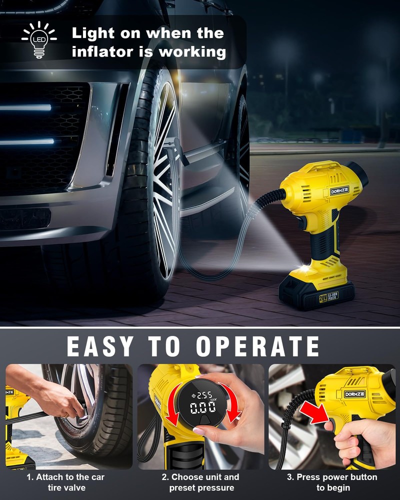 This portable tire inflator is a game-changer! The cordless design and powerful 20V battery make inflating tires quick and effortless. The metal construction ensures durability, and the auto shut-off feature takes the guesswork out of hitting the right pressure. It’s fast, reliable, and perfect for emergencies or regular use—no more struggling with manual pumps or hunting for gas stations. Highly recommend for any car owner!