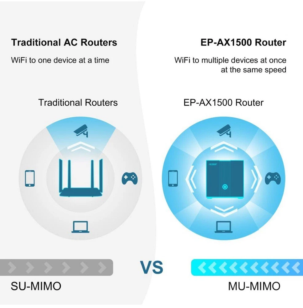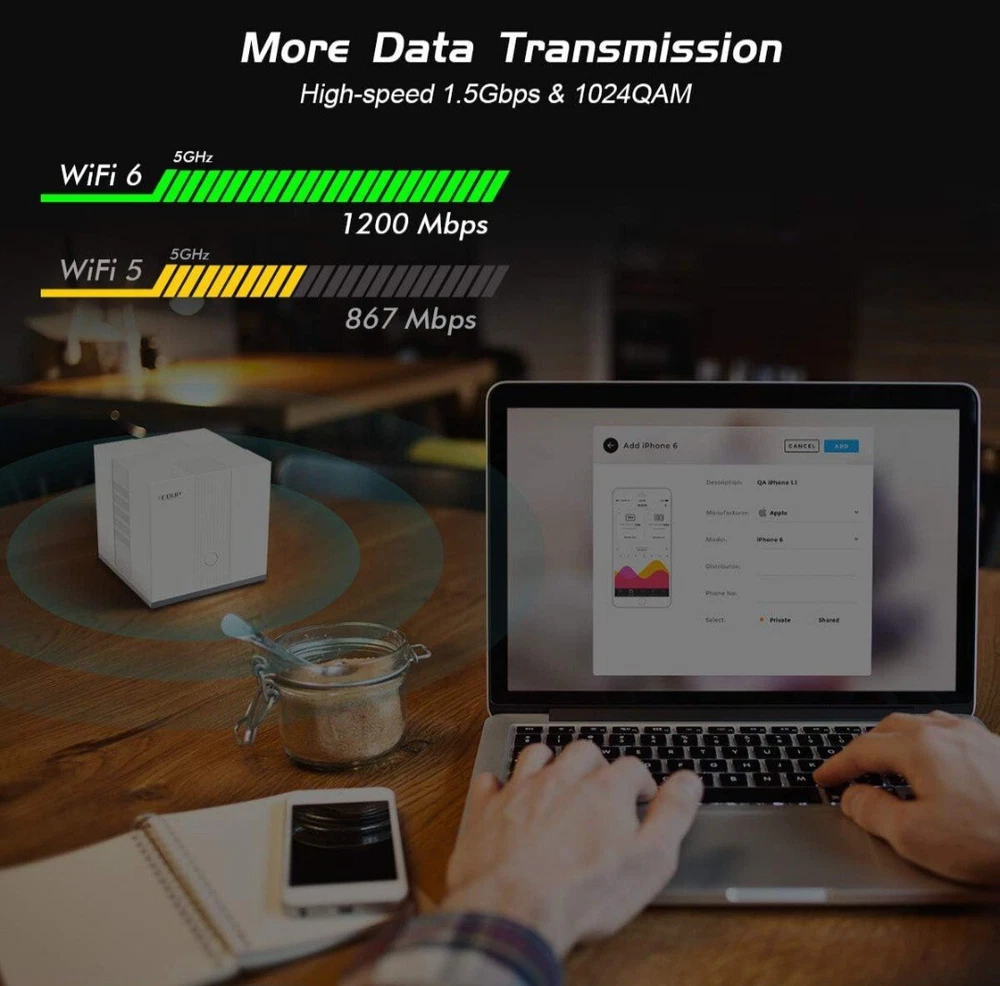 Introducing the 1500Mbps Wi-Fi 6 Router EDUP EP-AX1500 High Speed Dual Band Wireless Router. This router boasts impressive features such as WiFi 6, 1500 Mbps, and 11 AX. It is designed for maximum connectivity and is ideal for home or office use. The router has a sleek white design and comes with 2 LAN ports. It is compatible with various devices and has a maximum wireless data rate of 1500 Mbps. This router is perfect for anyone looking for a reliable and high-speed internet connexion.