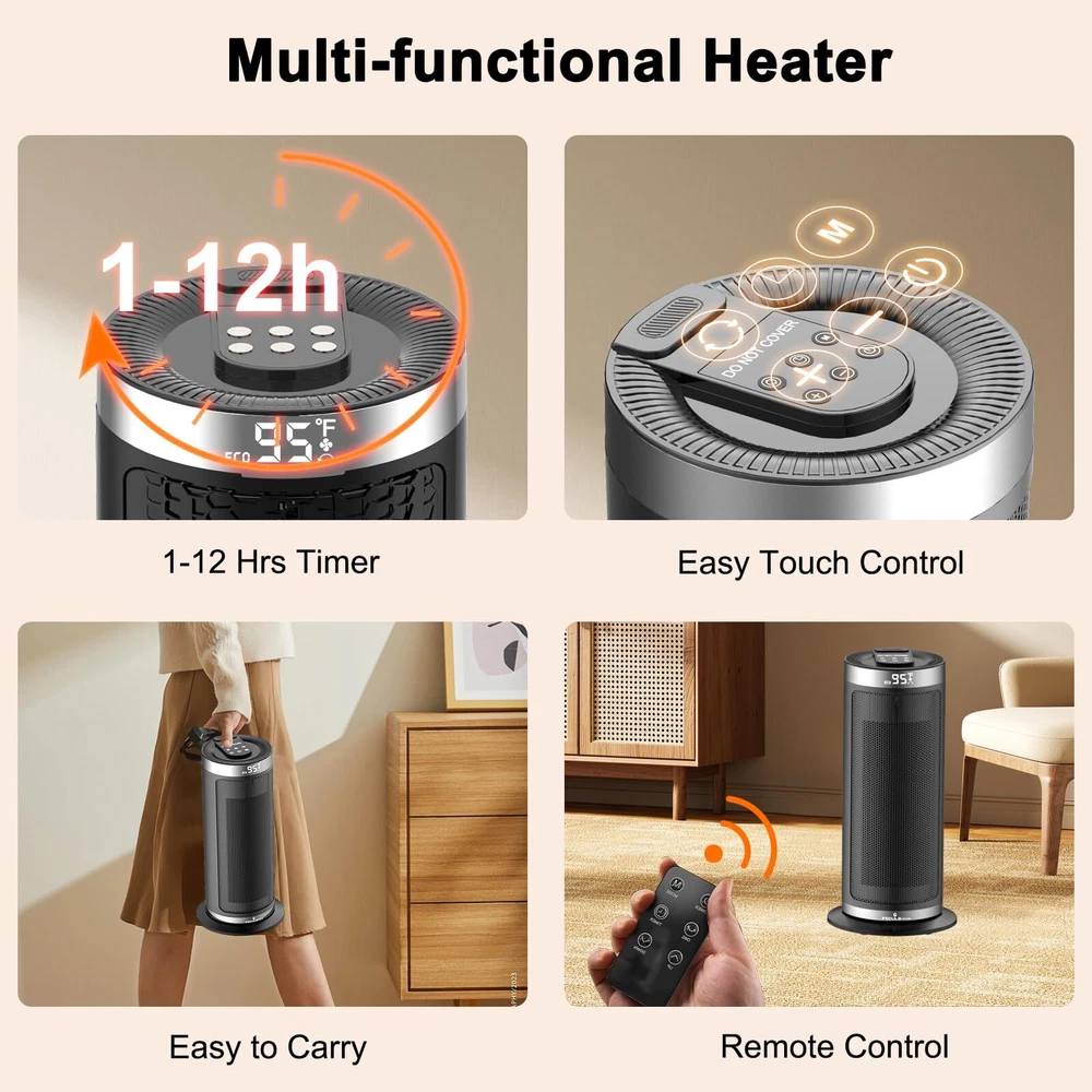 ETL-Certified Safety: Made of V0 flame-retardant materials with multiple safety features including built-in smart tip-over protection, overheat protection, 12-hour timer, V0 flame retardant 2-prong plug, and sturdy 6ft long flat power cord. Safe and worry-free all-day use.Heating Coverage:260 sq.ft. Fast Heating: Powerful 1500W PTC ceramic heating allows this space heater to heat up in seconds, suitable for warming up spaces in the home including bedrooms, basements, garages, living rooms, and can also be used in offices, dorms, hot yoga studios, etc Quiet Heating: 40dB - almost as quiet as a library. The fan wheel uses oblique airflow technology, which effectively reduces wind noise and makes the room heater 12% quieter than traditional electric heaters. Calm airflow lets you sleep soundly and work undisturbed during the cold winter Uniform Heating: The exclusive trackball system helps create smooth and quiet oscillation. The 90° wide-angle oscillation, with a lifespan of over 750,000 cycles, boosts heating coverage by 20%, which helps distribute the warm air more evenly towards the room's corners Energy Efficiency: Save on energy bills and live more sustainably. With a built-in precise temperature sensor, the smart ECO mode adjusts the working mode independently (with a low of 950W and high of 1500W) based on the ambient temperature Usage Comfort: The touchscreen is placed on top of the heater for easier reach, and the remote provides full access from up to 32 feet away. The compact design makes our space heater a real space saver that is easy to move around with its hidden handle. Cord Lenth: 6 ft / 1.8 m Powerful Heating Capability: This portable heaters for indoor is designed to quickly heat up your room in seconds, providing a warm and comfortable environment during the cold winter months. 1500W high power ensures efficient and effective heating, Heating Coverage: 200 sq.ft. making it an excellent choice for keeping your living space cozy Convenient Remote Control: Equipped with a remote control, this small space heater allows you to easily adjust settings from anywhere in the room without having to get up. This feature adds a layer of convenience, enabling you to control the temperature and other functions effortlessly, enhancing your overall experience Smart Thermostat: 90° wide-angle oscillation capability ensures that heat is evenly distributed throughout the room, providing comprehensive warmth coverage. The built-in thermostat automatically adjusts the temperature to maintain a consistent warmth in your indoor space. not only ensures a comfortable environment but also helps in conserving energy by preventing overheating, making it both efficient and eco-friendly 4 Heating Modes: Offering four different heating modes, this space heater with thermostat can cater to various needs and preferences. Whether you need a gentle warmth or a more intense heat, you can easily switch between modes to find the perfect setting for any room or situation, providing versatile heating options Safety and Portability: Designed with safety in mind, this electric space heaters features a tip-over protection system to prevent accidents. Its lightweight and portable design make it easy to move from one room to another, ensuring that you can enjoy warmth wherever you need it. The digital display adds to its user-friendly operation, making it an ideal choice for indoor use