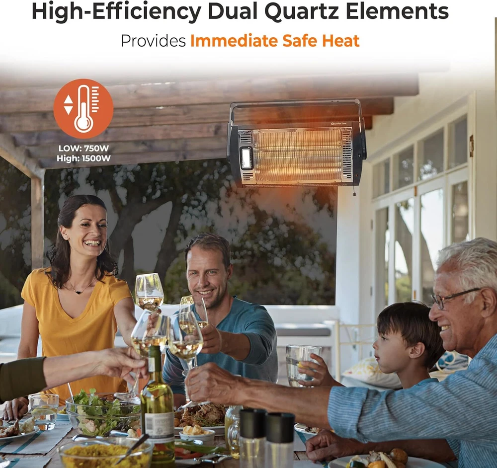 Brand Comfort Zone Special Feature Cool Touch Exterior, Portable, Halogen lamps (type G9, 120V., 60Hz., 25W), Overheat Protection, Adjustable Tilt Head Cool Touch Exterior, Portable, Halogen lamps (type G9, 120V., 60Hz., 25W), Overheat Protection, Adjustable Tilt Head Color Black Form Factor Wall Mount Indoor/Outdoor Usage Indoor Power Source Corded Electric Heating Method Radiant Item Weight 8 Pounds Heat Output 1500 Watts About this item EFFICIENT RADIANT HEATING: This radiant quartz heater utilizes two high-quality quartz bulbs to emit heat that is similar to the warmth of the sun. The radiant heat is directed towards nearby objects, delivering gentle and efficient warmth to living spaces, workshops, and garages. With its effective heating mechanism, this heater is an ideal choice for creating a comfortable environment. Voltage: 120.0 volts. ADJUSTABLE ANGLE FOR CUSTOMIZED HEAT: This quartz heater offers the flexibility to adjust its angle up to 90 degrees, allowing you to precisely direct the warmth to specific areas in your space. Whether you want to focus the heat towards a particular spot or cover a larger area, the adjustable angle feature ensures targeted warmth exactly where it's needed. EFFICIENT CEILING MOUNT: With its space-saving design, this radiant heater is specifically engineered for easy ceiling installation. By mounting it on the ceiling, you can optimize your floor space in crowded areas such as garages, workshops, or storage areas, ensuring maximum efficiency and convenience. BUILT-IN HALOGEN LIGHT: Enhancing its functionality, this radiant heater comes with a convenient built-in halogen light. Whether you're working on a project or need better visibility in dimly lit areas, the integrated halogen light provides ample illumination, allowing you to easily view items on your worktable and read instructions or fine print with clarity. Halogen lamps (use only type G9, 120V., 60Hz., 25W) are available at most hardware and home center stores. ENHANCED SAFETY FEATURES: The radiant heater is equipped with intelligent safety features to provide you with peace of mind. A sturdy metal safety grill effectively prevents the bulbs from coming into contact with other items, ensuring safe operation. Additionally, an integrated sensor automatically shuts off the unit if it detects overheating, protecting against potential hazards and promoting a safe environment.