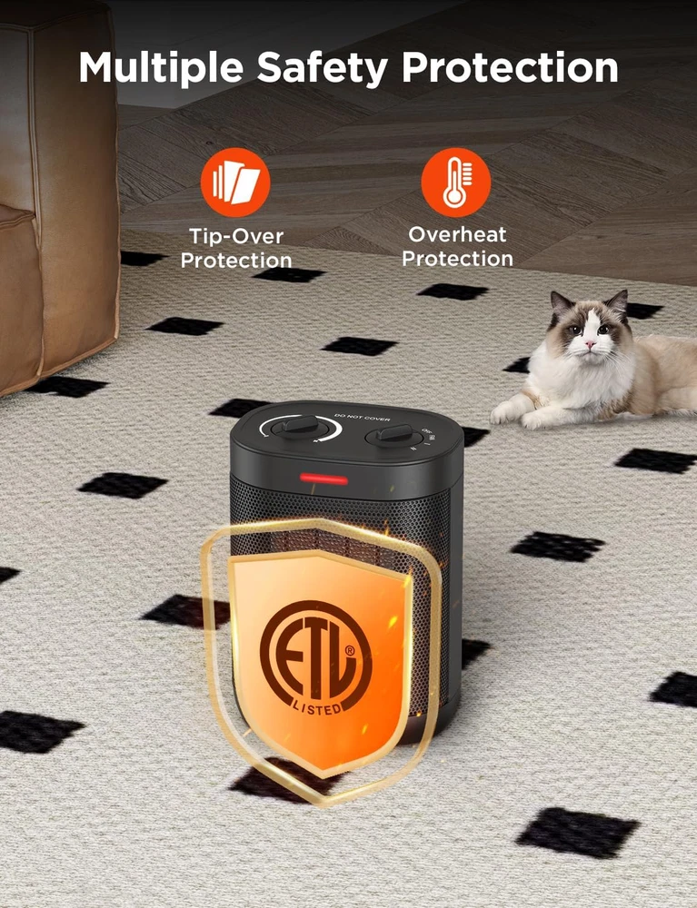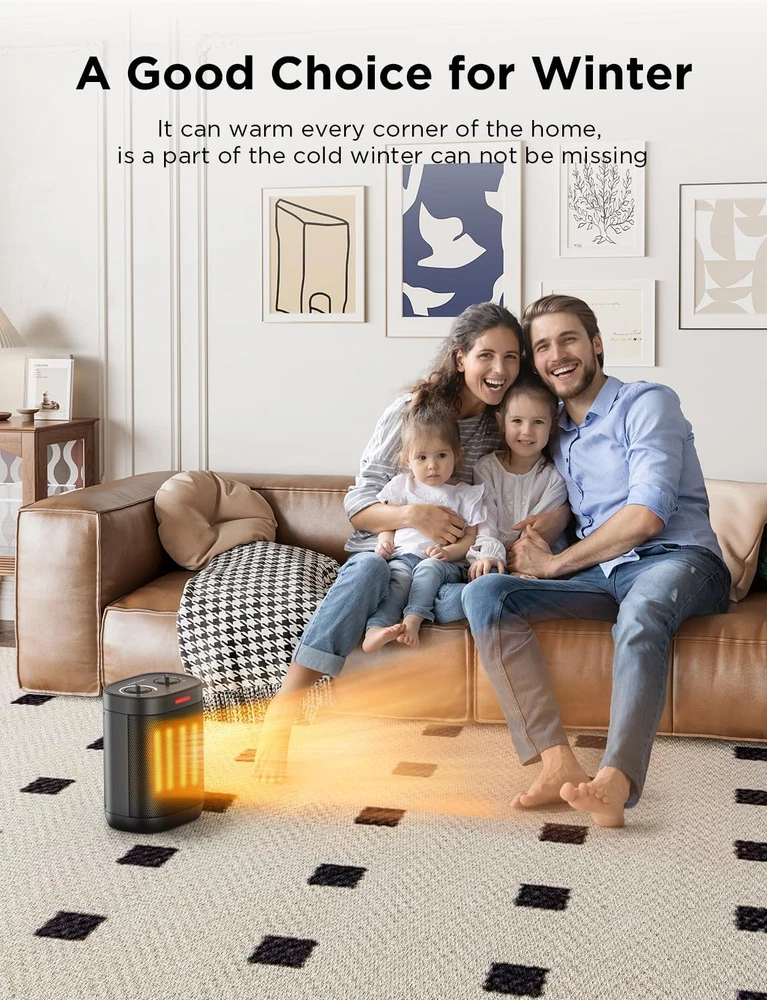 Powerful Heating Technology: The electric heater adopts advanced PTC ceramic heating technology, which can make you feel warm in two seconds, and if you feel overheated you can use the adjustable thermostat, which is convenient for you to feel the most suitable temperature. Reliable Safety Protection System: ETL certified ceramic electric heater is safer in use, when the heater is overheated, it will automatically cut off the power, and if the electric heater is knocked over accidentally it will immediately turn off the electric heater to eliminate safety hazards. Multiple Mode Selection: The space heater has three different function modes: Ⅰ 1500 watt high heat, Ⅱ 900 watt low heat, Ⅲ fan only, you can choose the corresponding mode according to your needs and enjoy the comfortable experience it brings to you. The Best Size for You: Heater for indoor use size is 6.29x4.72x8.78 inch, you can put it on your desk without taking up space. There is a handle on the back of the heater, so you can easily lift the heater with one hand and change its position to bring warmth to all corners of your home. Winter Essential: This powerful portable heater is ideal for every family in winter. Compared with the traditional heating system, it is more environmentally friendly and energy-saving in the heating process. It's also a great gift to give to family and friends. Product Description Powerful Heating Performance Safety Protection Tip-over Protection When the heater is accidentally knocked tip-over Protection, it will shut down immediately to prevent fire. Simple Operating Interface The heater has three function modes High Heat, Low Heat, Fan only to meet your different needs. Overheat Protection The heater comes with an overheating protection system, when the heater is running too hot, it will immediately shut down. Easy to Move There is a built-in carrying handle behind the heater, which can be easily picked up to make every corner of your home warm. 1 work with you 2 warm you in the RV 3 warm the night 4 perfect gift choices Chikit Space Heaters Family Size 6.3" x 4.72" x 8.78" 6.3" x 4.73" x 8.66" 6.29"x4.72"x8.74" 6.29“ x4.72"x8.54" 6.69"x5.11"x13.81" 6.29"x6.29"x14.88" Handle ✔ ✔ ✔ ✔ ✔ ✔ Power 900W/1500W 900W/1500W 900W/1500W 900W/1500W 900W/1500W 900W/1500W Mode Option Low/High/Fan only Low/High/Fan only Low/High/Fan only/ECO Low/High/Fan only/ECO Low/High/Fan only/ECO Low/High/Fan only/ECO ETL Certified ✔ ✔ ✔ ✔ ✔ ✔ Safety Protection Tip-over&Overheat Protection Tip-over&Overheat Protection Tip-over&Overheat Protection Tip-over&Overheat Protection Tip-over&Overheat Protection Tip-over&Overheat Protection Adjustable Thermostat ✔ ✔ ✔ ✔ ✔ ✔ How to adjust the temperature? You can turn the temperature control knob on the left side of the interface to adjust the current optimal temperature. Is this heater safe? The heater is made of high quality flame retardant material, passed ETL certification, and the heater comes with double safety protection function to ensure your safety when using.