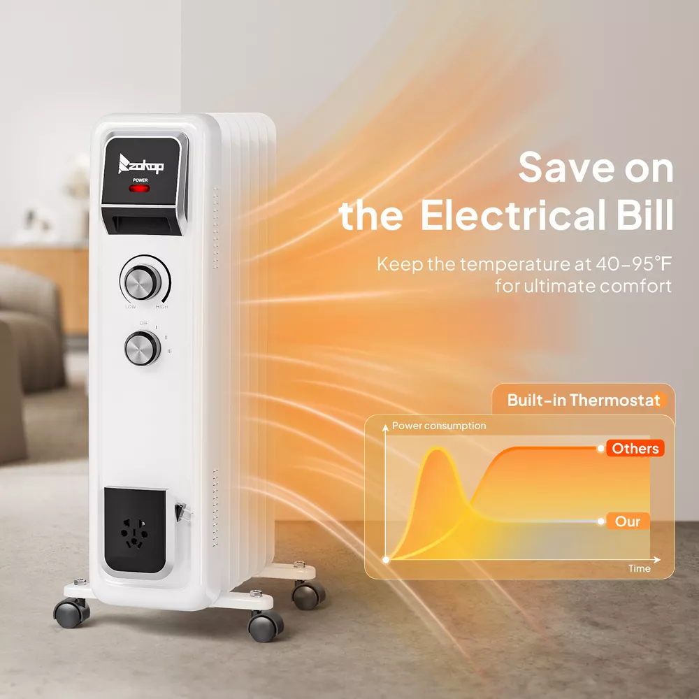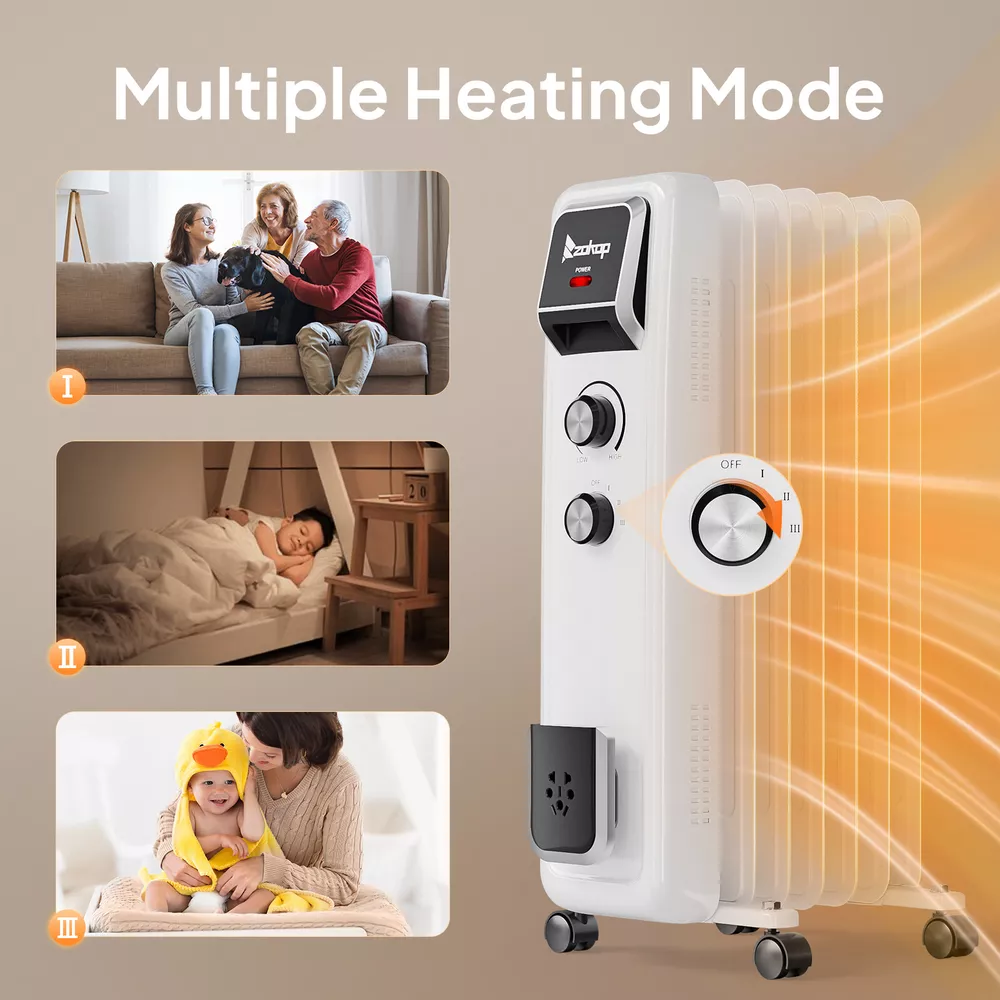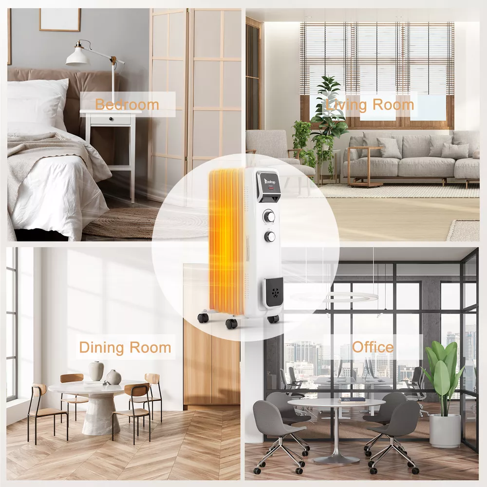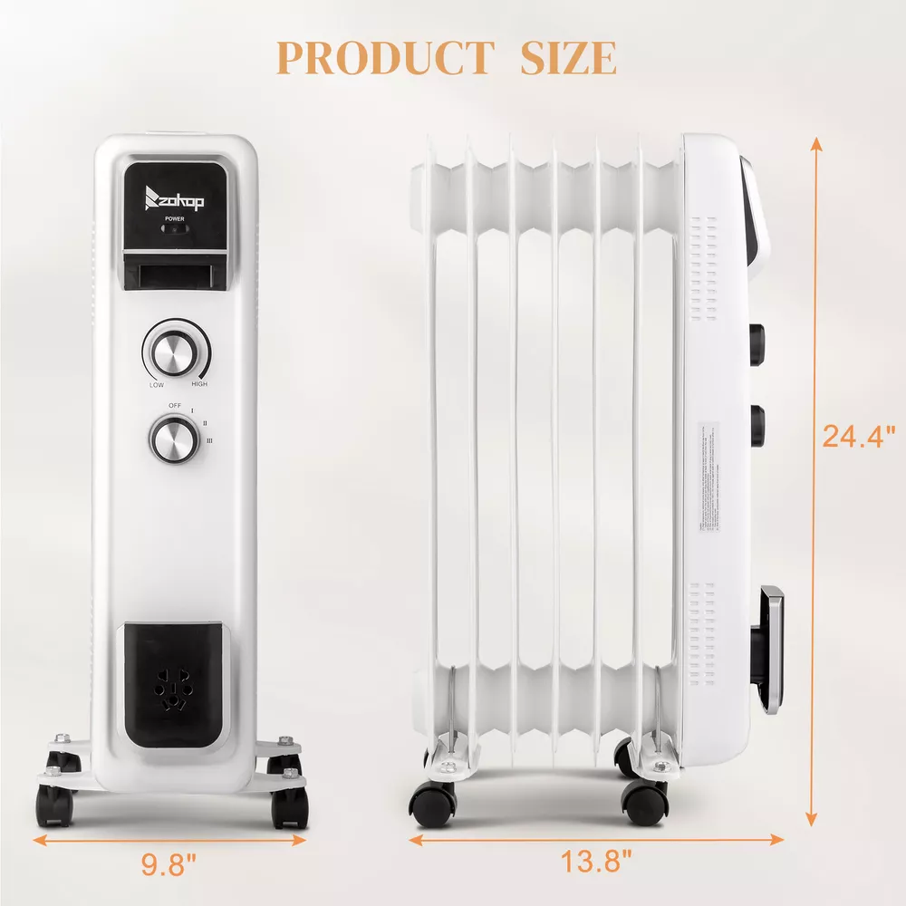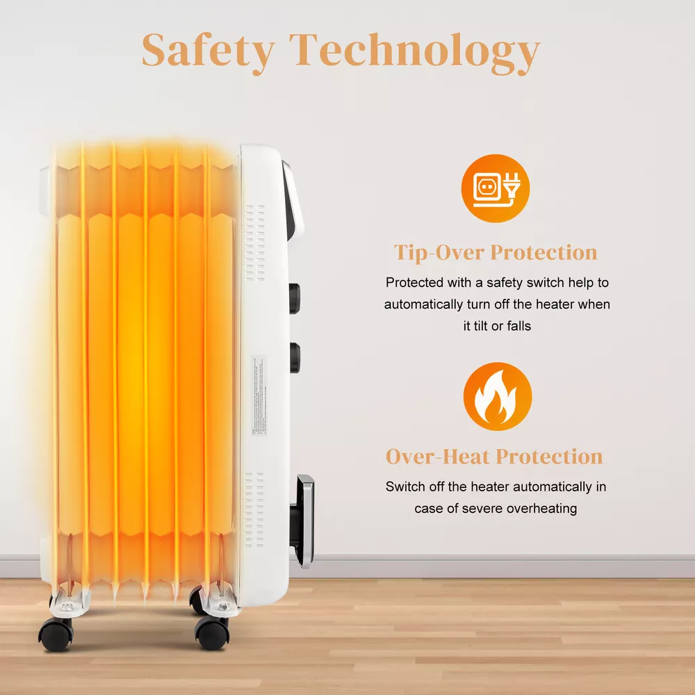 Introductions: Stay warm and cozy throughout the winter with this 1500W Oil Filled Radiator Heater. Designed for optimal comfort, this portable electric space heater is perfect for heating up bedrooms, offices, and other indoor spaces up to 200 sq.ft. With three heat settings, you can easily customize the temperature to your liking. Built with safety in mind, it features overheat and tip-over protection, ensuring peace of mind while you enjoy consistent warmth. Its quiet operation and portable design make it a practical and versatile addition to any home. Features: 1. Powerful and Efficient Heating: This 1500W oil-filled radiator heater quickly warms up rooms up to 200 sq.ft. The oil-filled fins efficiently retain heat to ensure consistent warmth throughout the day. With three heat settings and an adjustable thermostat, you can easily set the perfect temperature for your space. 2. Whisper-Quiet Operation: Enjoy a serene and cozy environment with this ultra-quiet heater. It operates with minimal noise, making it ideal for bedrooms and offices where silence is essential. 3. Overheat & Tip-Over Protection: If the unit overheats or is accidentally knocked over, it will automatically shut off to prevent any potential hazards. This makes it a safe choice for households with children or pets, giving you peace of mind while staying warm. 4. Cord Storage Rack: Keep your space tidy and organized with the built-in cord storage rack. When the heater is not in use, simply wrap the power cord around the storage rack for easy, clutter-free storage. 5. Portable Design with Wheels: Effortlessly move this heater from room to room with its four 360° swivel wheels. Whether you need extra warmth in your bedroom, living room, or office, this heater's portable design makes it easy to transport and use wherever it's needed most. Specifications: 1. Voltage: 120V/60Hz 2. Rated Power: 1500W 3. Coverage Area: 15-20 sq.m / 200 sq.ft 4. Heating Element: Heating Tube 5. Timer: No 6. Heat Settings: Low - High 7. Digital Display: No 8. Base Included: Yes 9. Remote Control: No 10. Certification: FCC 11. Warranty: 1 year 12. Product Dimensions: (12.6 x 5.9 x 15) in / (32 x 15 x 38) cm 13. Weight: 7.5 lbs / 3.4 kg Package Includes: 1 x Radiator Heater 4 x Wheels 1 x User Manual
